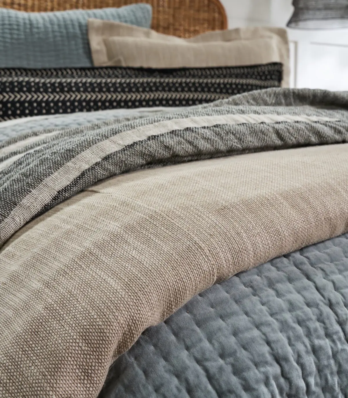 Throughout history, indigo has been used in a variety of global textiles, including Japanese Shibori and West African Batik; the Marshall Quilt acknowledges and celebrates many of these traditions. For example, if you wish to create a “globetrotter” style in your bedroom, you may wish to use natural textures such as grass, jute, or rattan alongside this quilt to achieve a sense of authenticity. Additionally, the deep indigo provides a cohesive foundation for all these prints, helping to bring order to the room by keeping it grounded rather than chaotic.