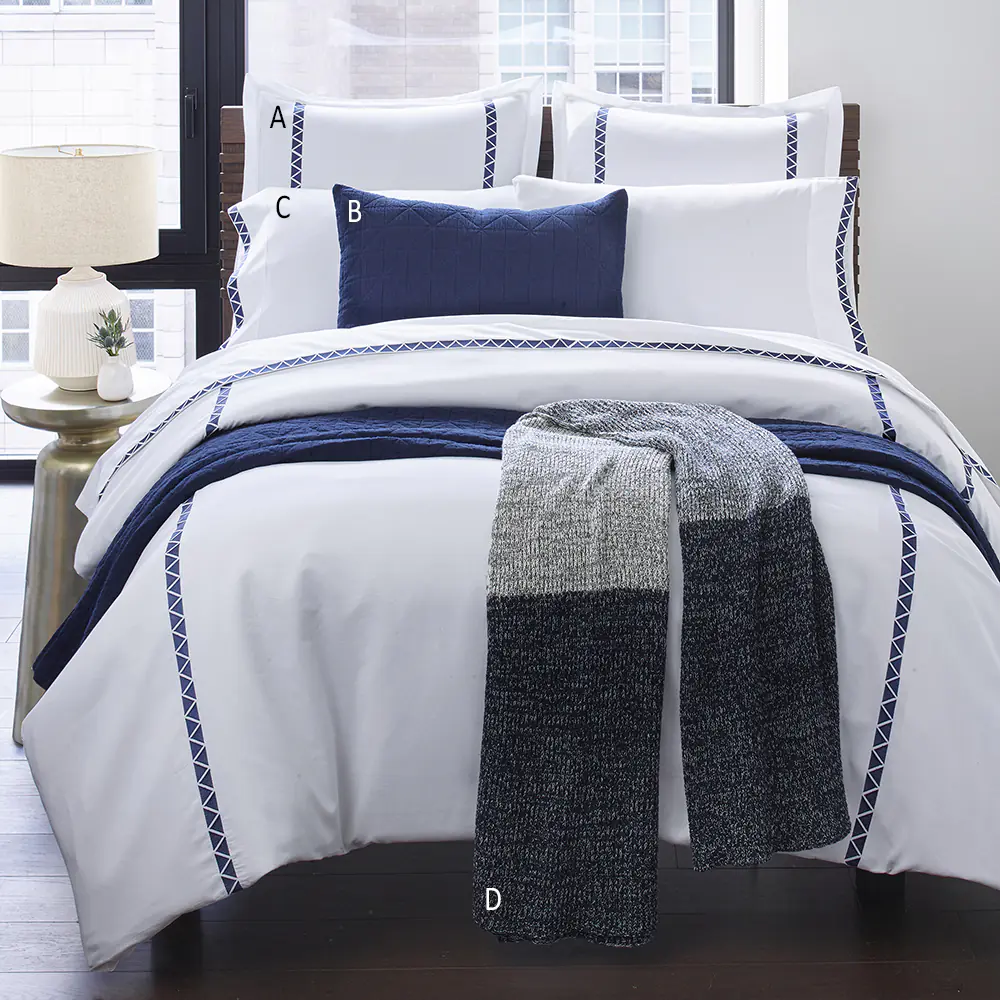 In a coastal luxury bedroom setting, the Jerome Duvet Cover offers a deep blue layering with crisp white and blue accents in the bedding, evoking the deep Atlantic Ocean meeting the white, foaming beaches of the shore. It is an overall timeless, expensive-looking, and calming step away in design and style.