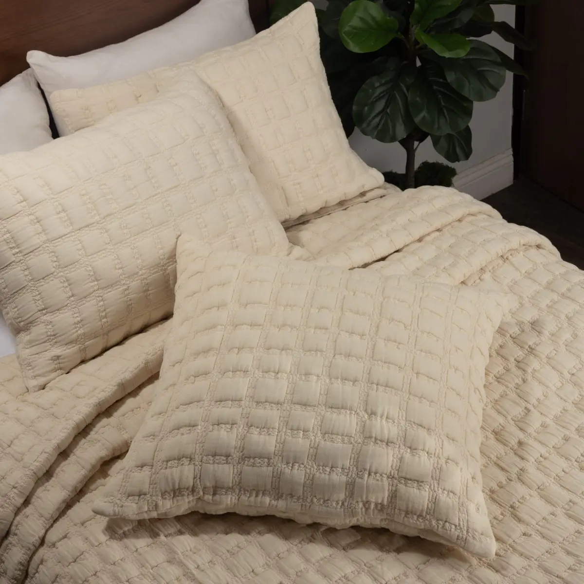 Instead of just sitting on the top of the mattress, Claudia also goes beyond the sides of the mattress to elegantly hide the box spring and give an upscale, textured drape to the bed. The Claudia Quilt is also an ideal solution for anyone who has ever endured another person stealing their blanket; there is ultimately more than enough fabric to go around!