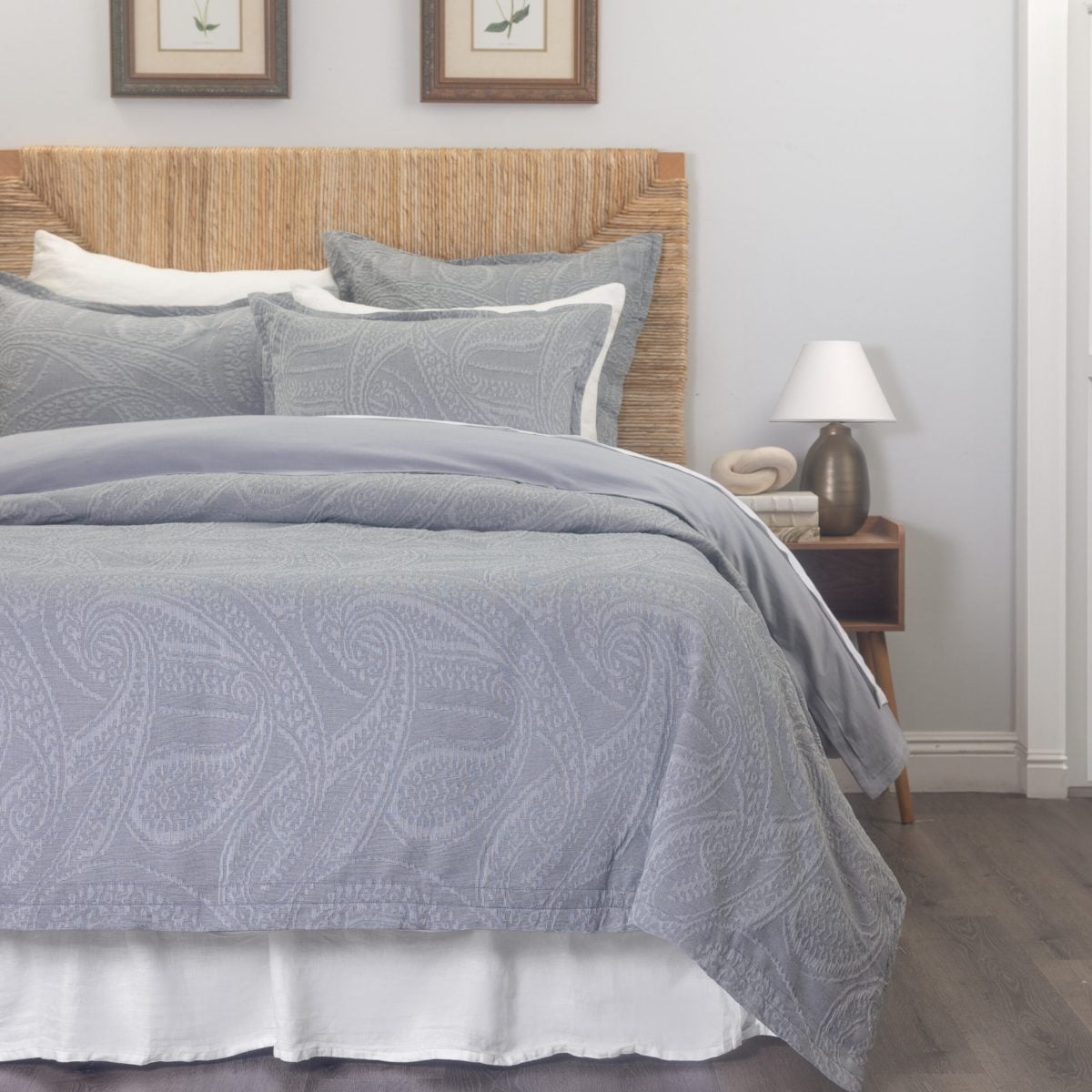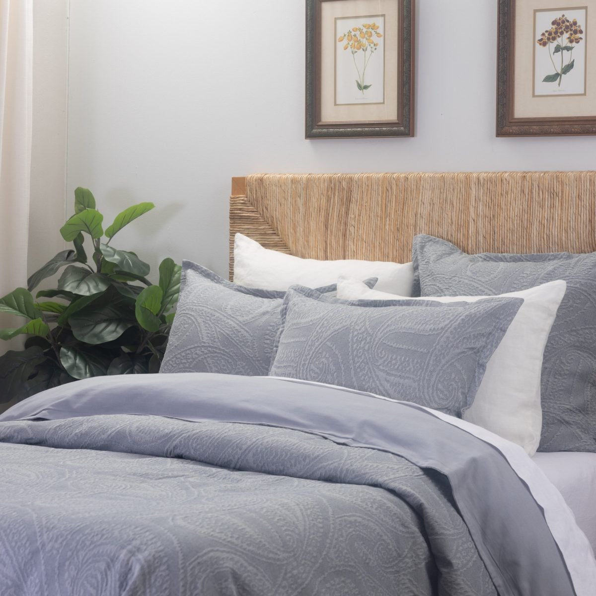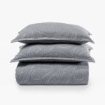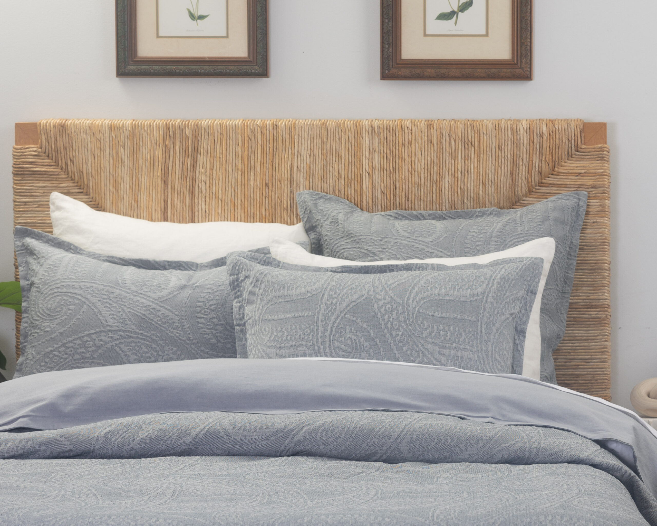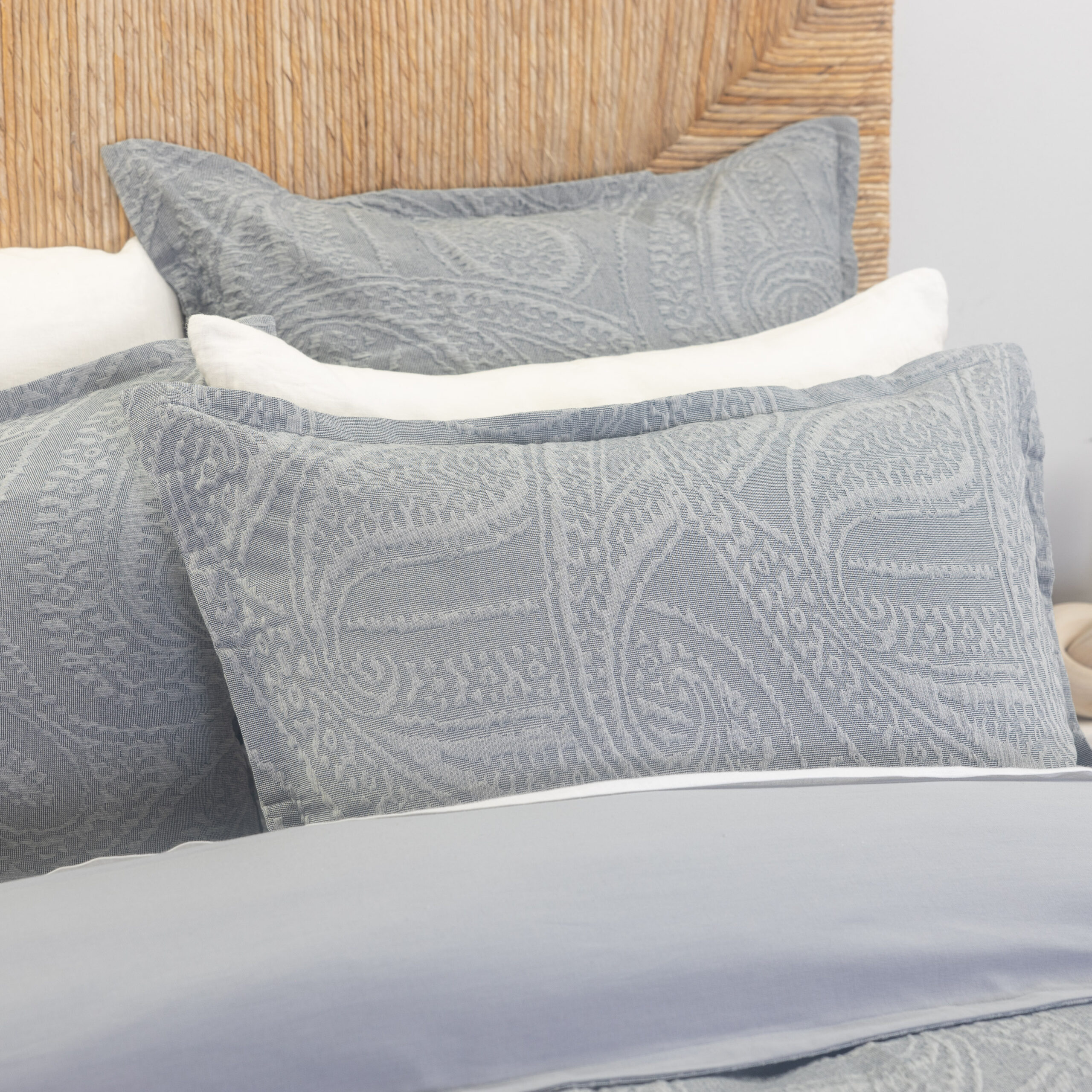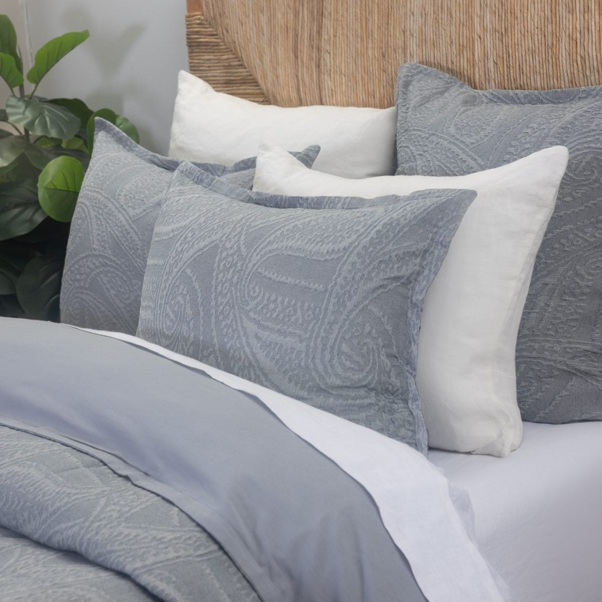 The Summer suiting look translates perfectly to top of bed with the large-scale chambray paisley of the Ada duvet cover paired with the crisp Dante Sandshell coverlet and Eli shams, a classic window pane plaid add in a casual stripe like the Berkley Quilt and a silky bow-tie inspired touch with the Cash Indigo lumbar pillow and the dapper gentleman’s look is complete.