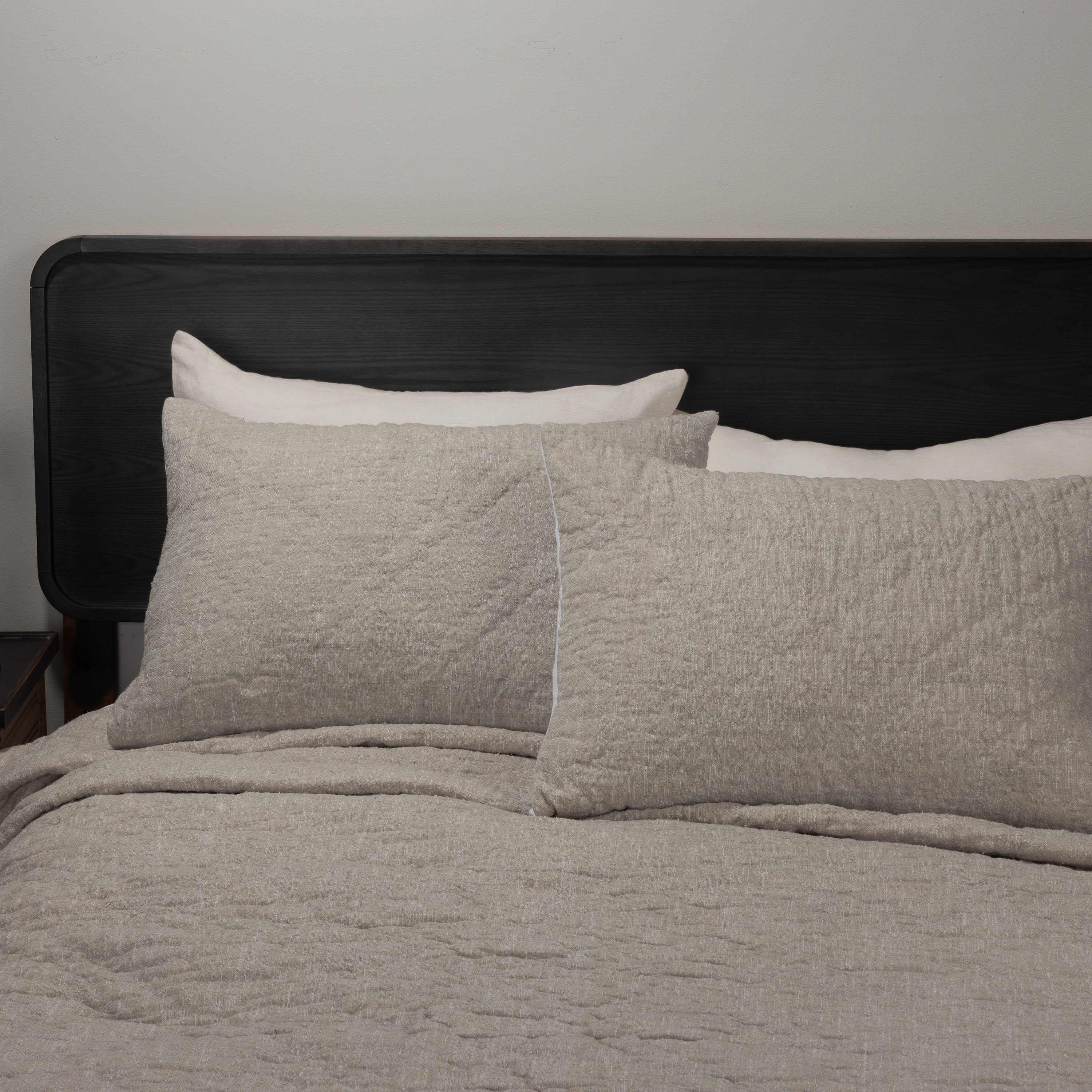 This quilt is crafted from fabric made with recycled yarn, embracing a commitment to sustainability without compromising on quality. The texture and visible slubs are natural characteristics of the yarn, adding depth and a unique, organic look to each piece. It is hand-quilted in a refined double diamond pattern and finished with contrast piping for a touch of tailored elegance. The quilt itself is not recycled, but the use of recycled yarn makes it an environmentally conscious addition to your bedding.