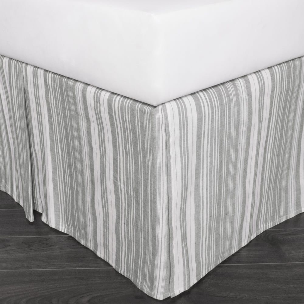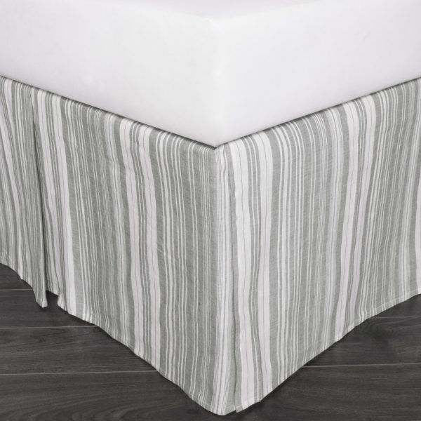 Multi-width Grey and Iovry stripes add dimension to this tailored bed skirt with pleats. Bed Skirt comes as 3 Panels, in drop length + 3 inch deck, and may require pins ( Pins are not included) Sizes
