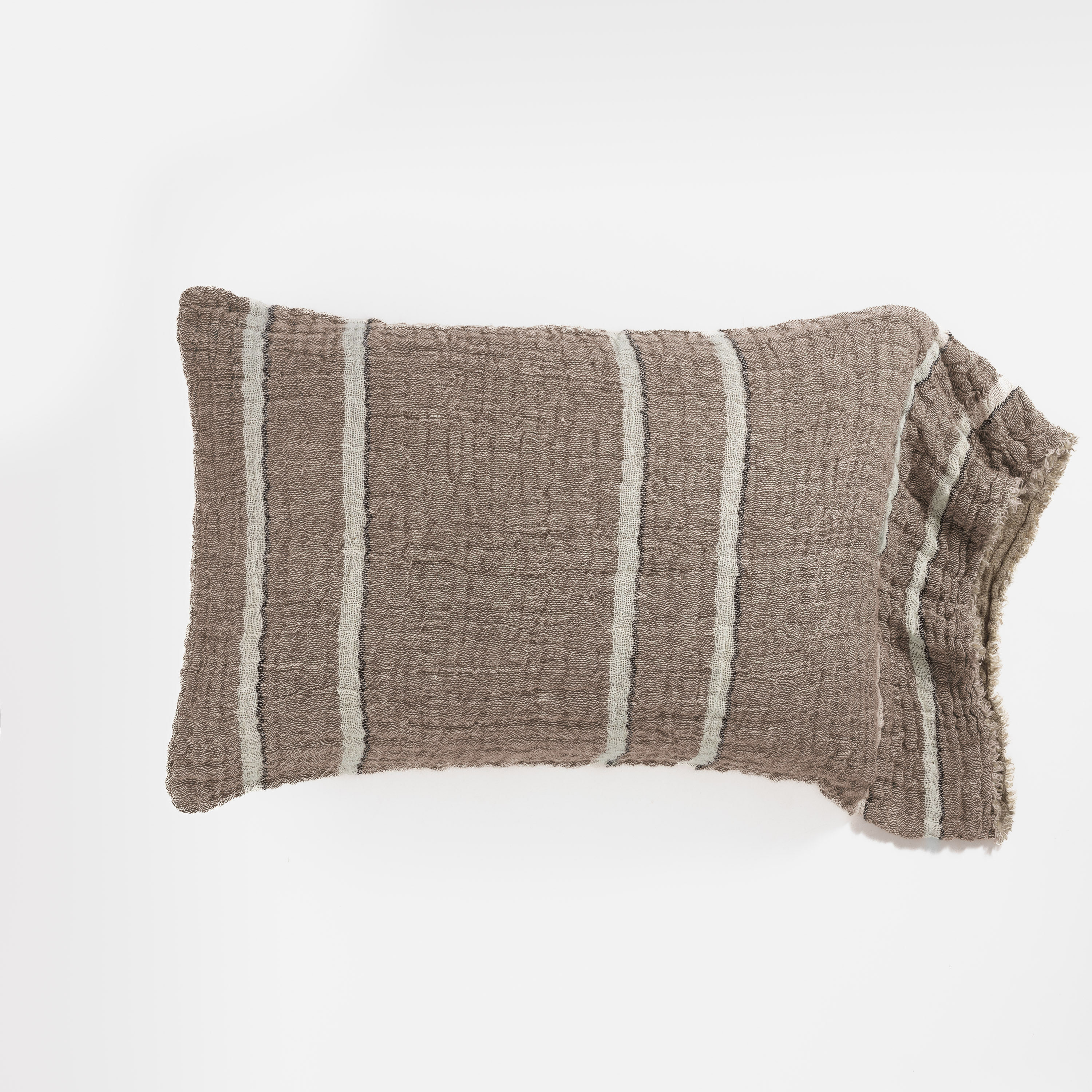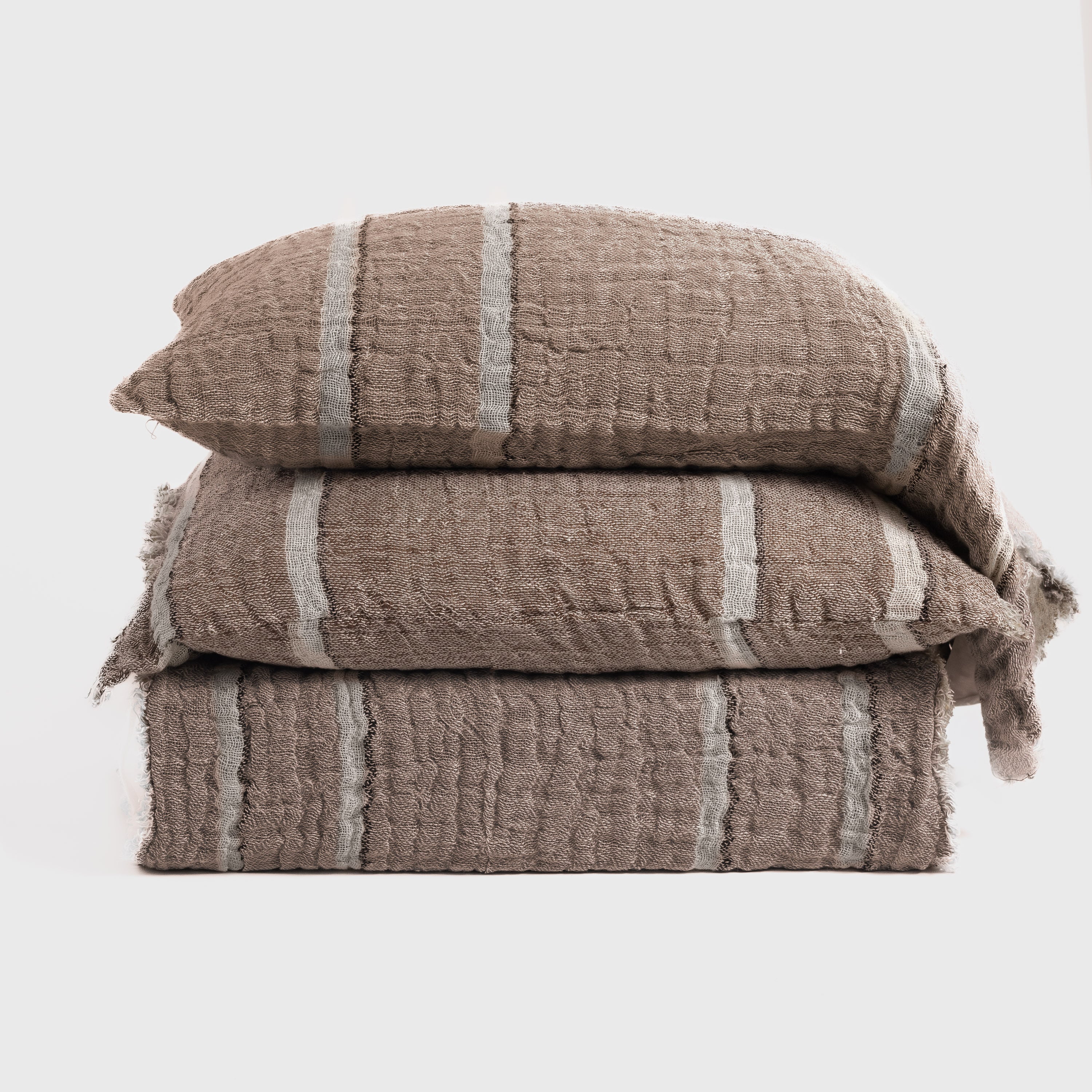 The Akin coverlet is a textured linen double cloth reversing from a wide tri-color stripe on one side to a rustic natural linen on the other. Woven to an engineered width, this coverlet is “one size fits most” at 98 x 98 inches wide. Finished with the woven selvedge on either side, and a raw eyelash edge on top and bottom, the Akin coverlet aligns perfect with the Japanese art of Wabi Sabi. The companion shams are open on one end and designed to fit both a standard sham and king with an exaggerated drape.