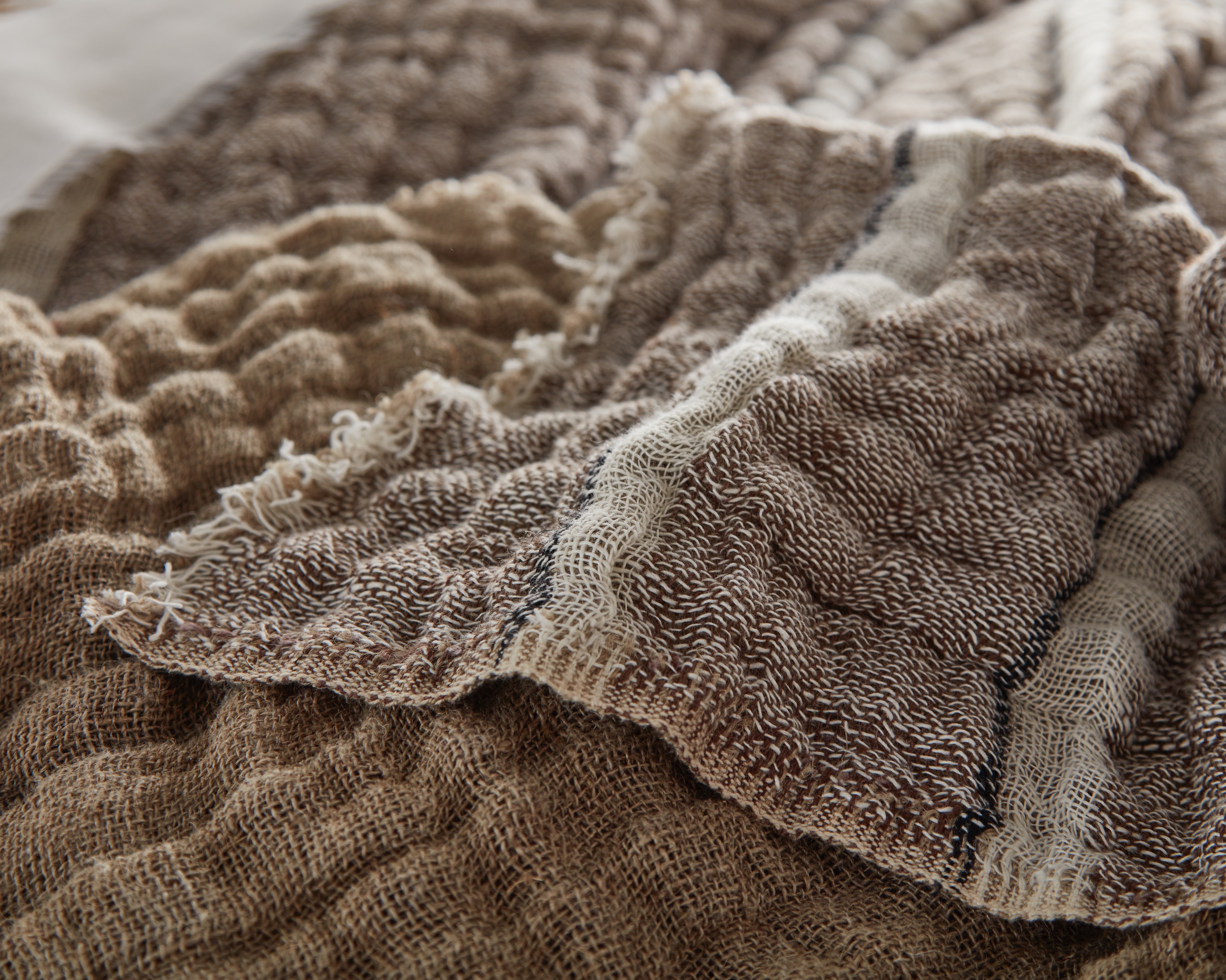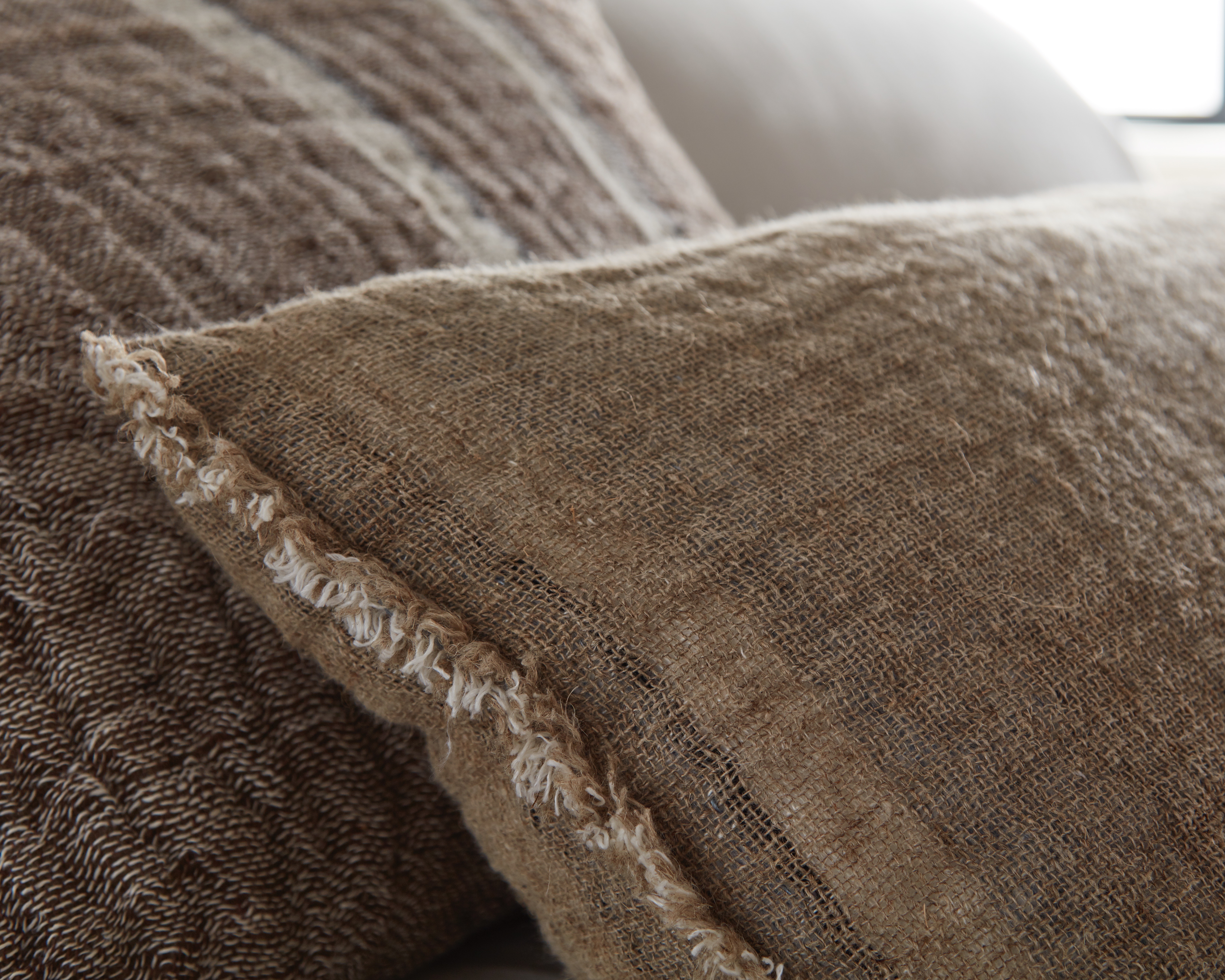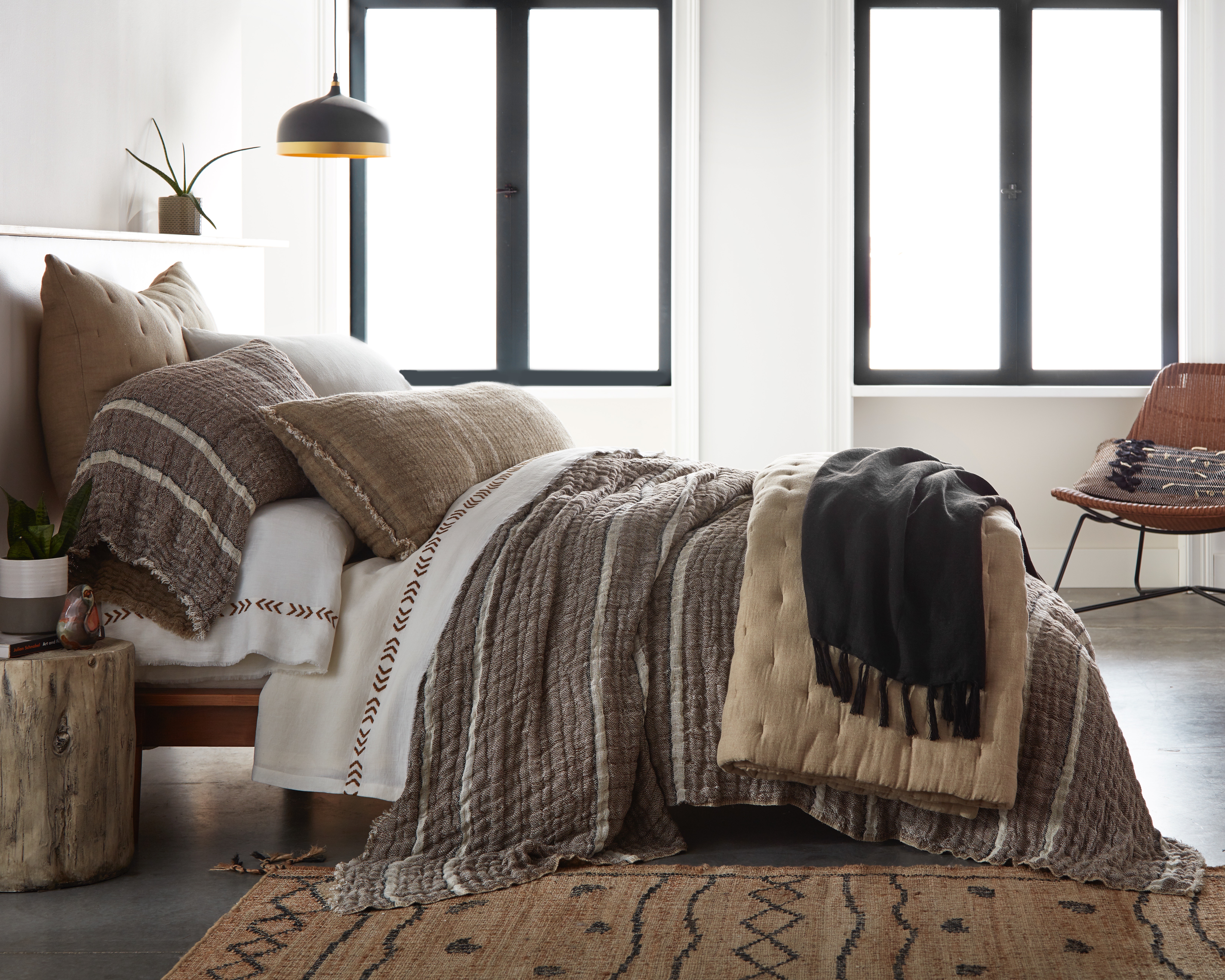 - This setting gives off the vibes of casual, modern and fresh. Starting with the Akin coverlet in saddle, an earthy tri-color stripe and topped with the lofty Dalton quilt in natural this set is simply styled, but anything but boring. Using a Dutch Euro and body pillow keeps this ensemble fuss free without a ton of pillows. The Kith sheet set bridges style and function. The graphic embroidery adds a unique pattern, and linen sheeting is always a luxurious choice! Here we finished the setting with the Dempsey super throw in asphalt to tie into the modern elements in the room.