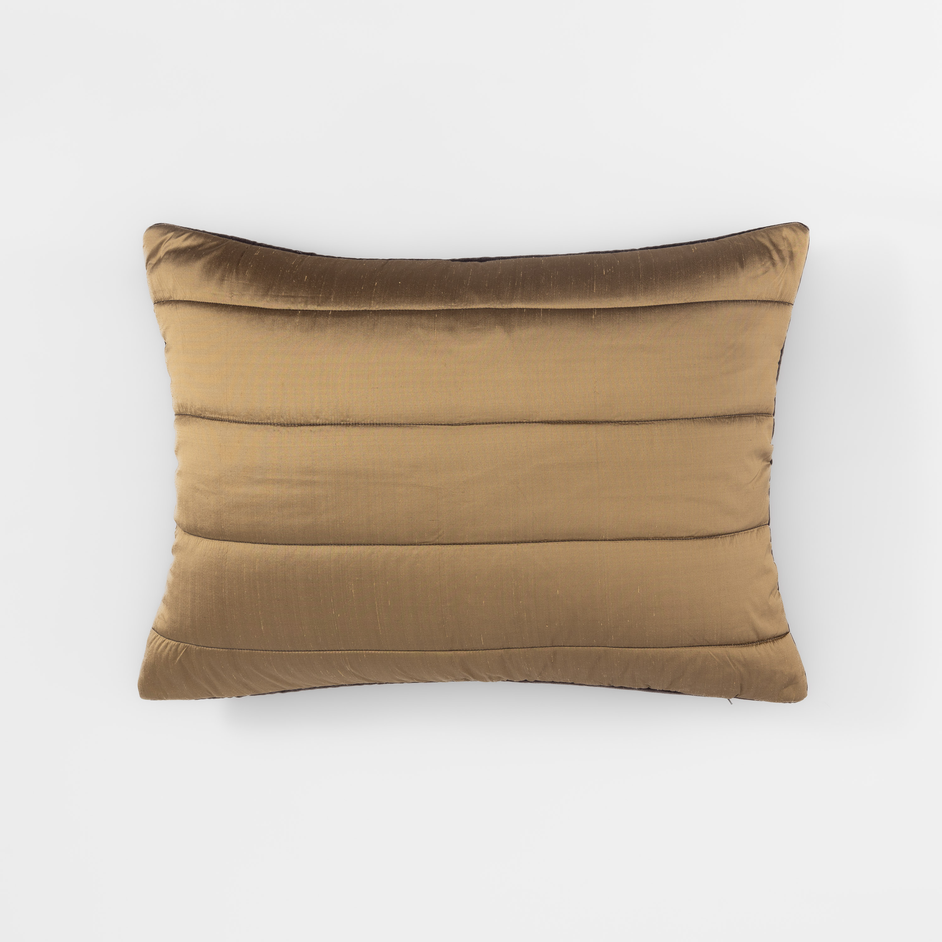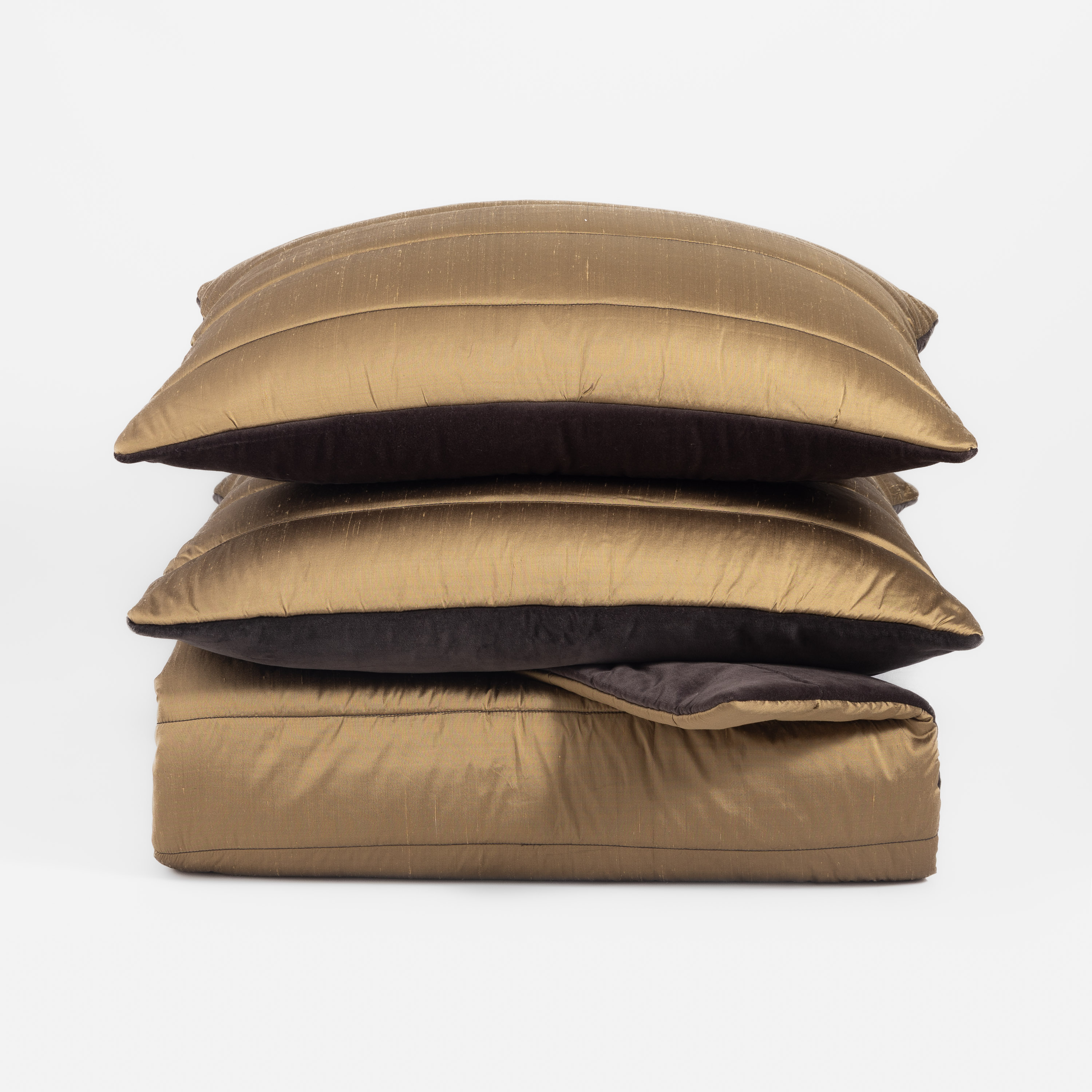 Exquisite dupioni silk is bordered and backed with a rich cotton velvet and channel quilted for a modern take on Elegance. Shams are reversable from silk to velvet with channel quilting on both sides and finished with a hidden zipper.