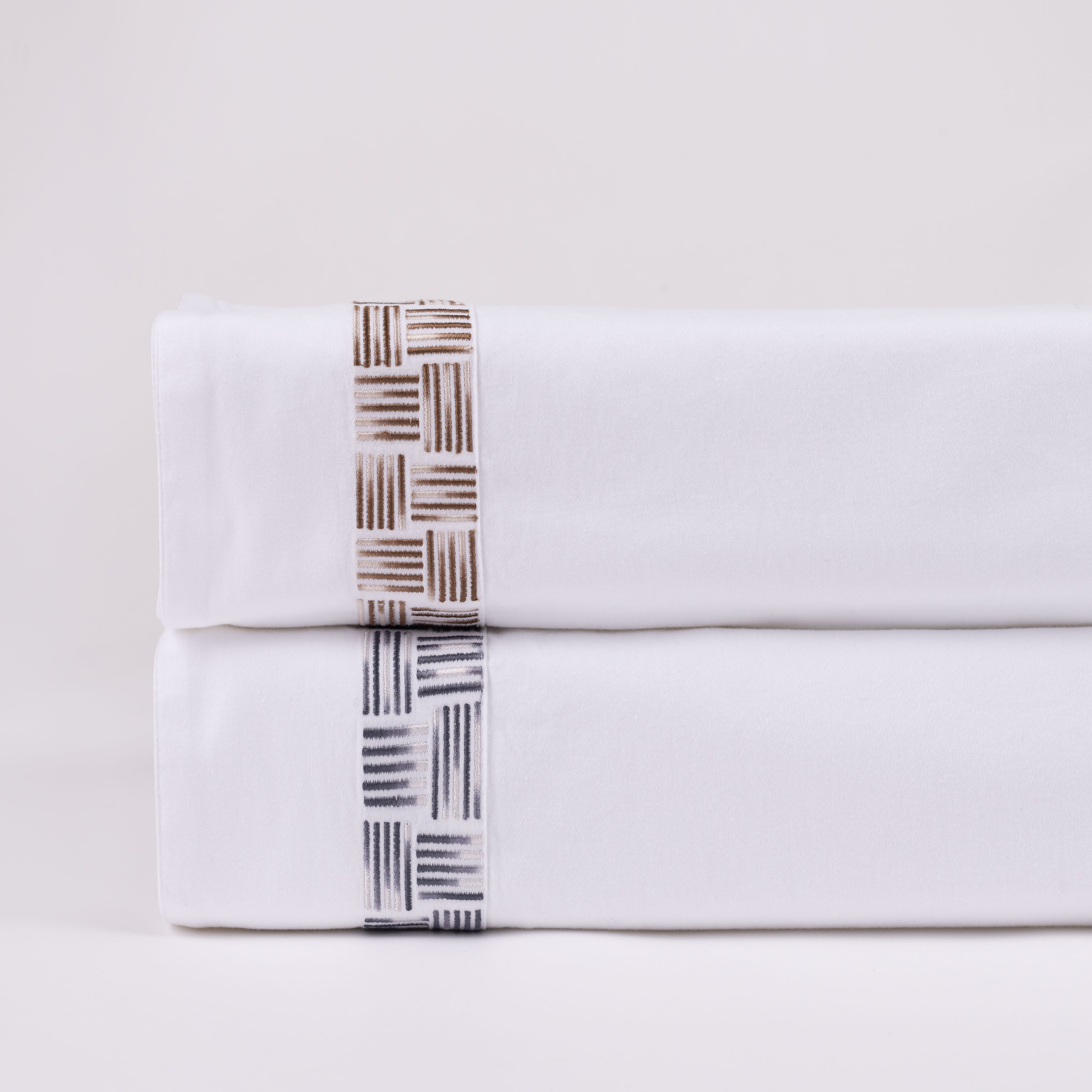 The Ansel sheet set is a sophisticated fusion of modern design and classic elegance. Constructed of luxurious 400 thread count cotton sateen, these sheets are adorned with variegated embroidered bars, creating a visually striking pattern that adds a touch of refinement to your bedding ensemble. Crafted for both comfort and style, these sheets are made from high-quality fabric, promising a soft and breathable environment for restful sleep.
