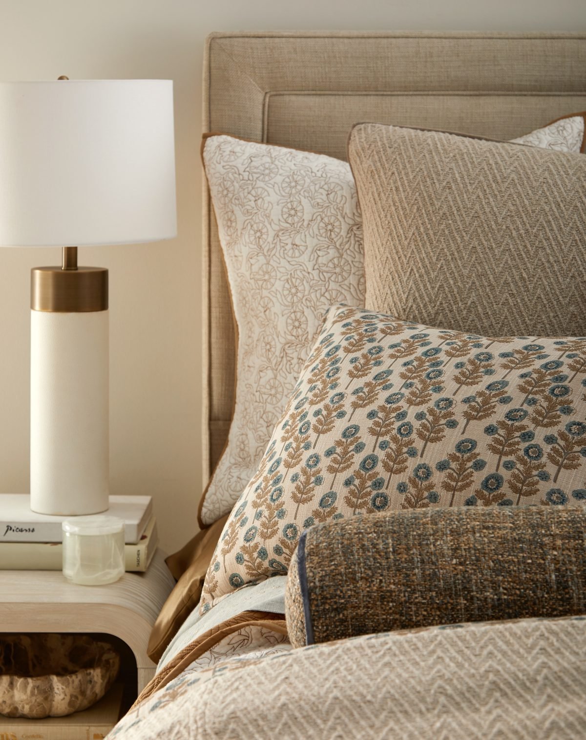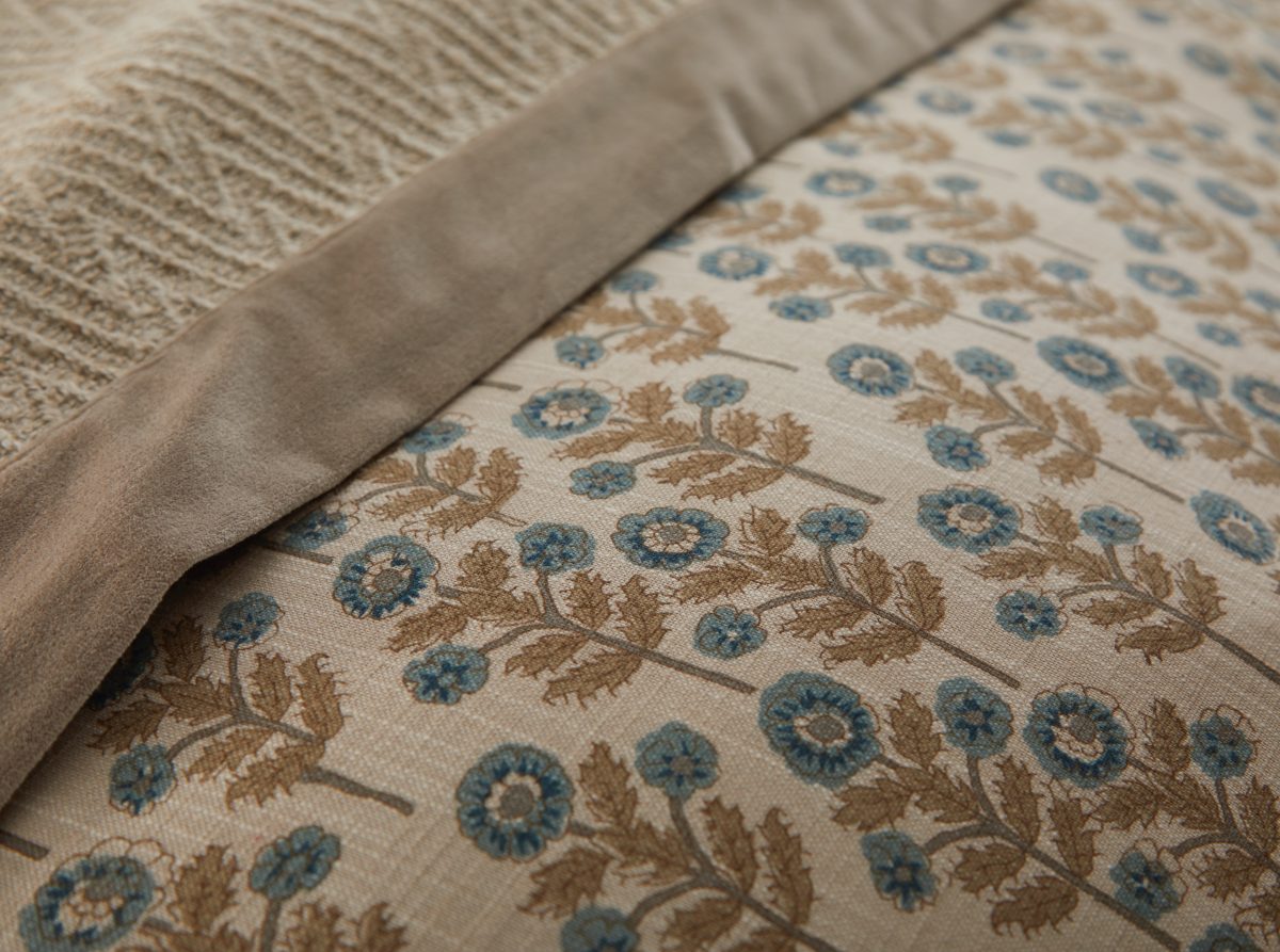 This thoughtfully layered ensemble brings together three uniquely detailed collections to create a serene, quietly luxurious retreat. The Asha duvet with its block-print inspired motif rendered on a yarn-dyed cotton ground, introduces a soft, artisan character that feels both global and refined. Caroline’s reversible quilt, quilted in a delicate tossed-floral pattern, adds a whisper of texture and dimension, offering a gentle counterpoint to Asha’s rhythmic print. At the forefront, the Gabriel collection lends tactile richness with its herringbone-woven boucle, elevated by a luxurious cotton velvet trim that frames each piece with understated elegance. Anchoring the setting, a soumack-weave rug in natural jute tones grounds the palette in organic warmth, pulling the elements together into a cohesive, tranquil composition. The result is a uniquely layered bed that celebrates craftsmanship, nuance, and an effortless sense of calm.