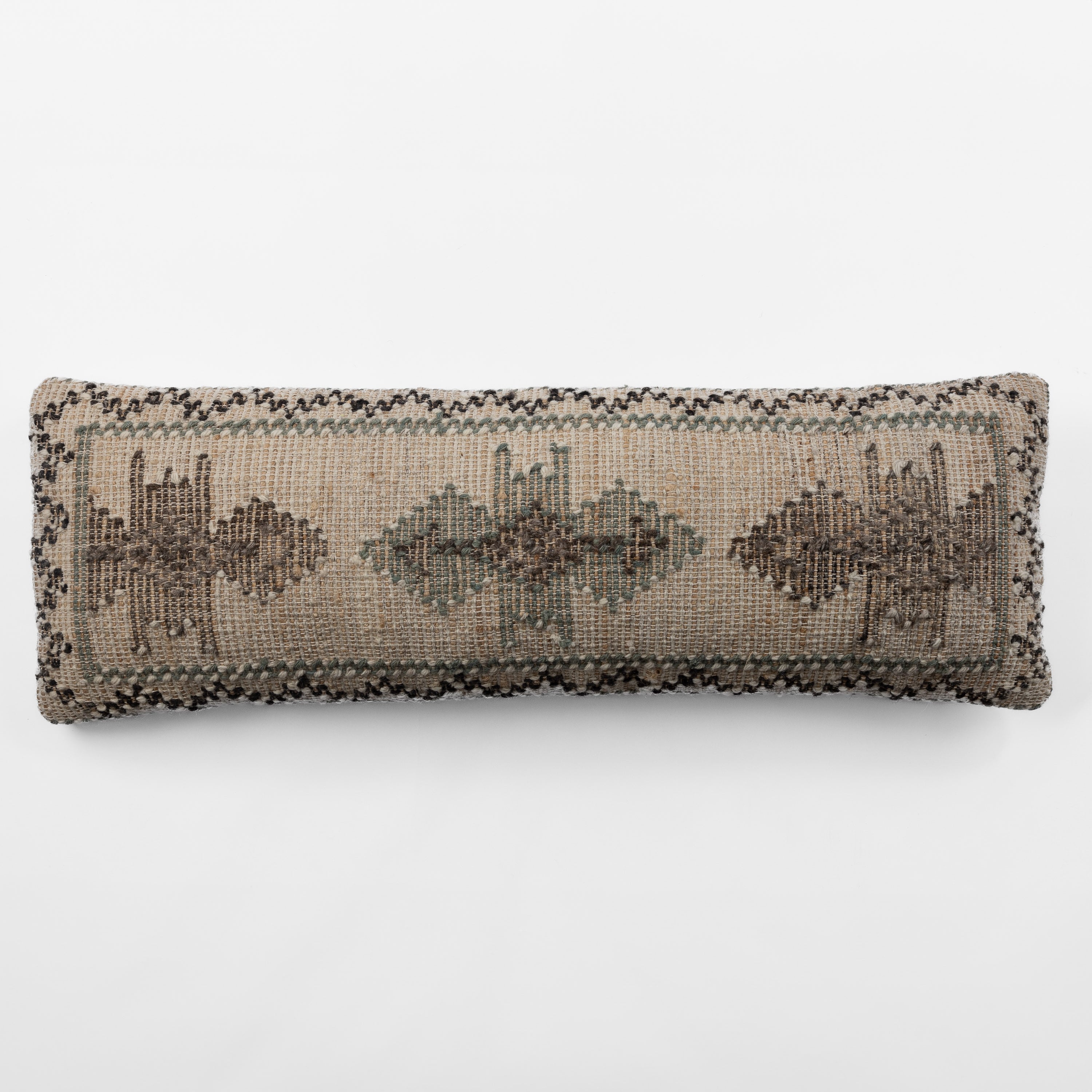 Inspired by traditional kilim motifs, this extra-long bolster pillow is crafted from the same handwoven material as its coordinating rug, offering a seamless blend of textile artistry and functional luxury. Earthy tones of taupe, olive, and espresso form a timeless geometric pattern that brings depth and warmth to any bedding ensemble. Perfect for grounding a sophisticated interior, this versatile piece effortlessly bridges high-end decor with heritage craftsmanship.