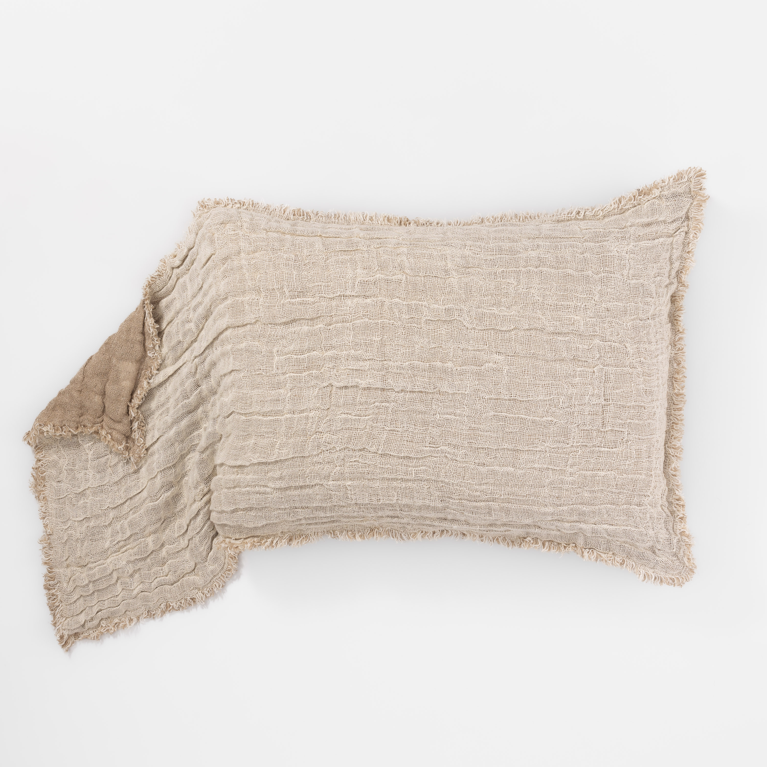 The perfect companion to the Akin collection or anything that needs a touch of sophisticated texture. A textured linen double cloth, Ashford reverses from a rustic natural linen on one side to a textural ivory linen on the other. Woven to an engineered width, this coverlet is “one size fits most” at 98″ wide. Finished with the woven selvedge on either side, and a raw eyelash edge on the top and bottom. The companion shams are also reversible and open on one end and designed to fit both a standard and a king with an exaggerated drape. The Euro shams and body pillow finish with a button closure at the bottom.
