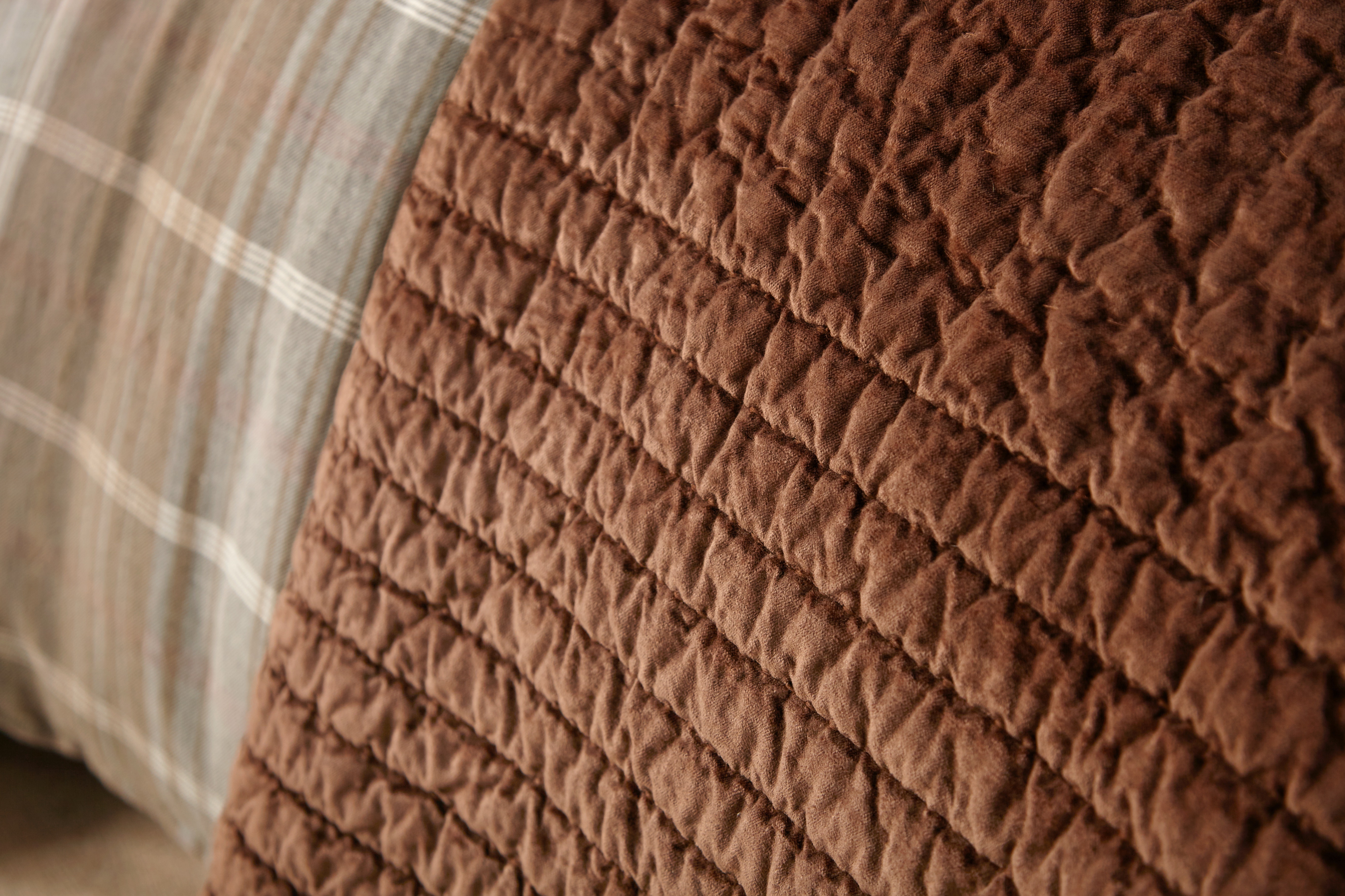 Layered atop, the Aurora quilt in a time-worn copper hue introduces a sense of warmth and quiet luxury. Made from lustrous viscose velvet, its tonal shifts mimic the ethereal glow of the Northern Lights, enhancing the bed with a dynamic, light-catching sheen. The hand-quilted texture adds an artisanal quality, while the sleek machine-quilted border lends a tailored finish. This quilt is more than an accent—it’s an invitation to indulge in touchable elegance, softening the plaid’s crisp lines with its fluid movement.