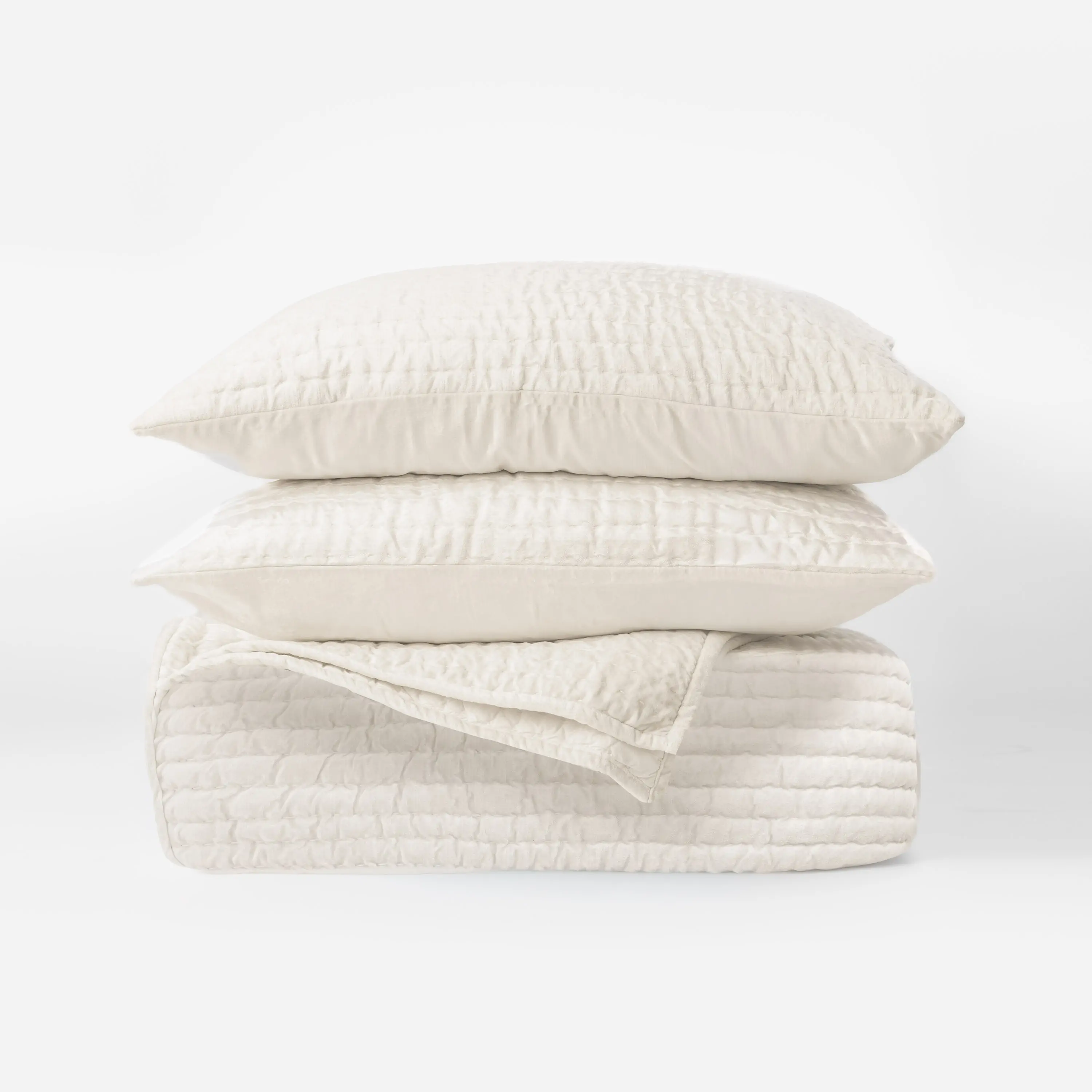 A perfect pairing of refinement and artisanal influence converge in the Baldwin quilt as lustrous rayon velvet is hand quilted with an exaggerated kantha style stitch. The result is a subtle rippling which allows the light to dance beautifully as the fabric naturally puckers with each stitch. The Baldwin quilt is available in: