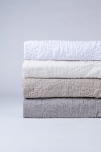 Barcelona is constructed of 100% fine linen front and back, and hand quilted in an elongated double diamond pattern. The scale of the pattern provides for a soft drape and feel to this quilt as well as giving a classic motif a fresh update.