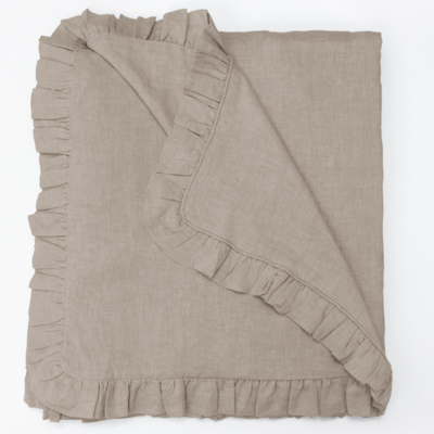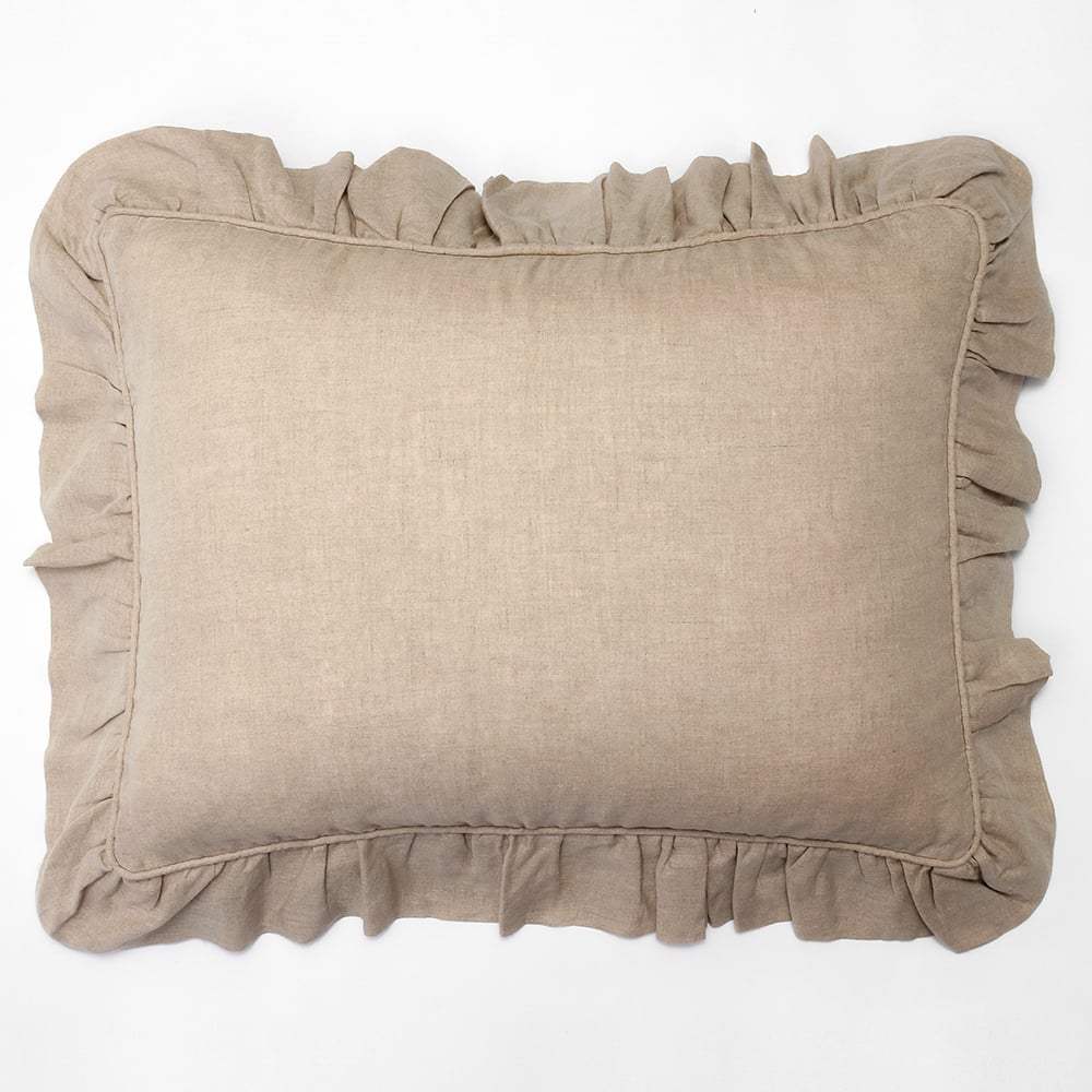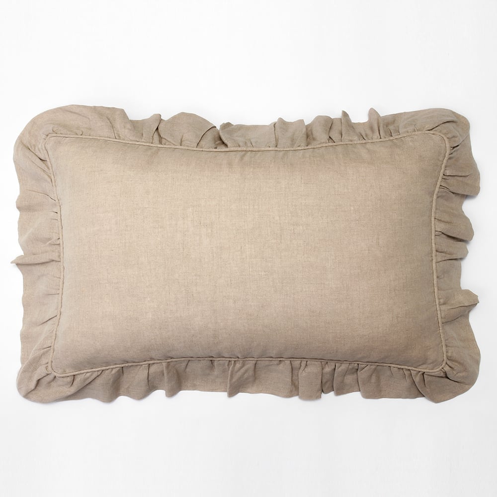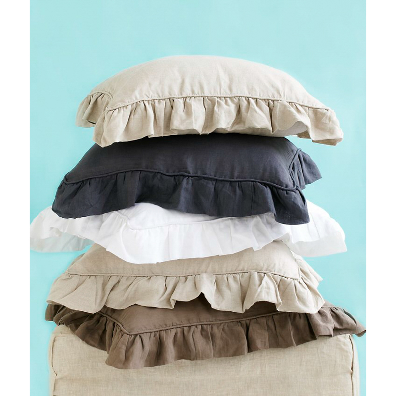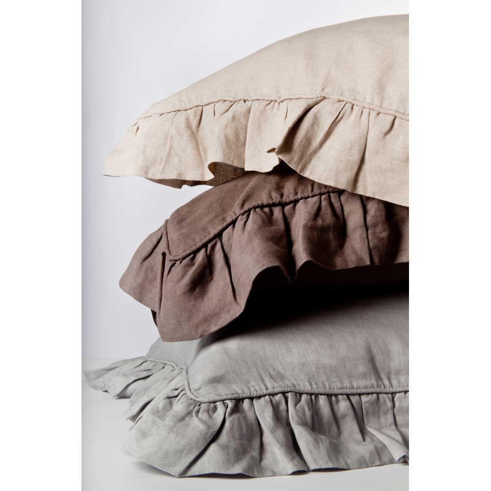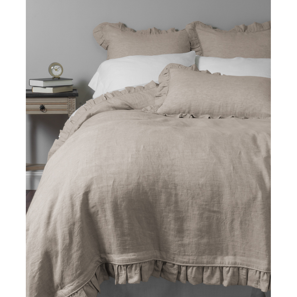 Add a touch of femininity with this lovely collection. Constructed of fine linen and finished neatly with piping and a delicate ruffle.