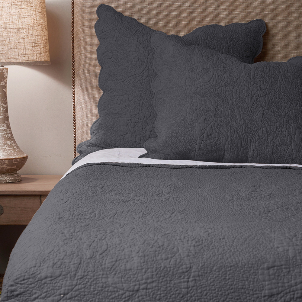 The intricate quilting detail on the Bastien quilt guided by hand to achieve the delicate raised scroll motif. 100% natural linen on the front and back and is finished with a scalloped edge.