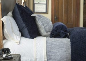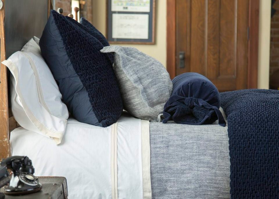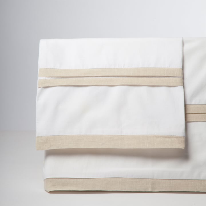 Crisp white cotton percale sheeting trimmed with a trio of linen flanges for a clean finish.