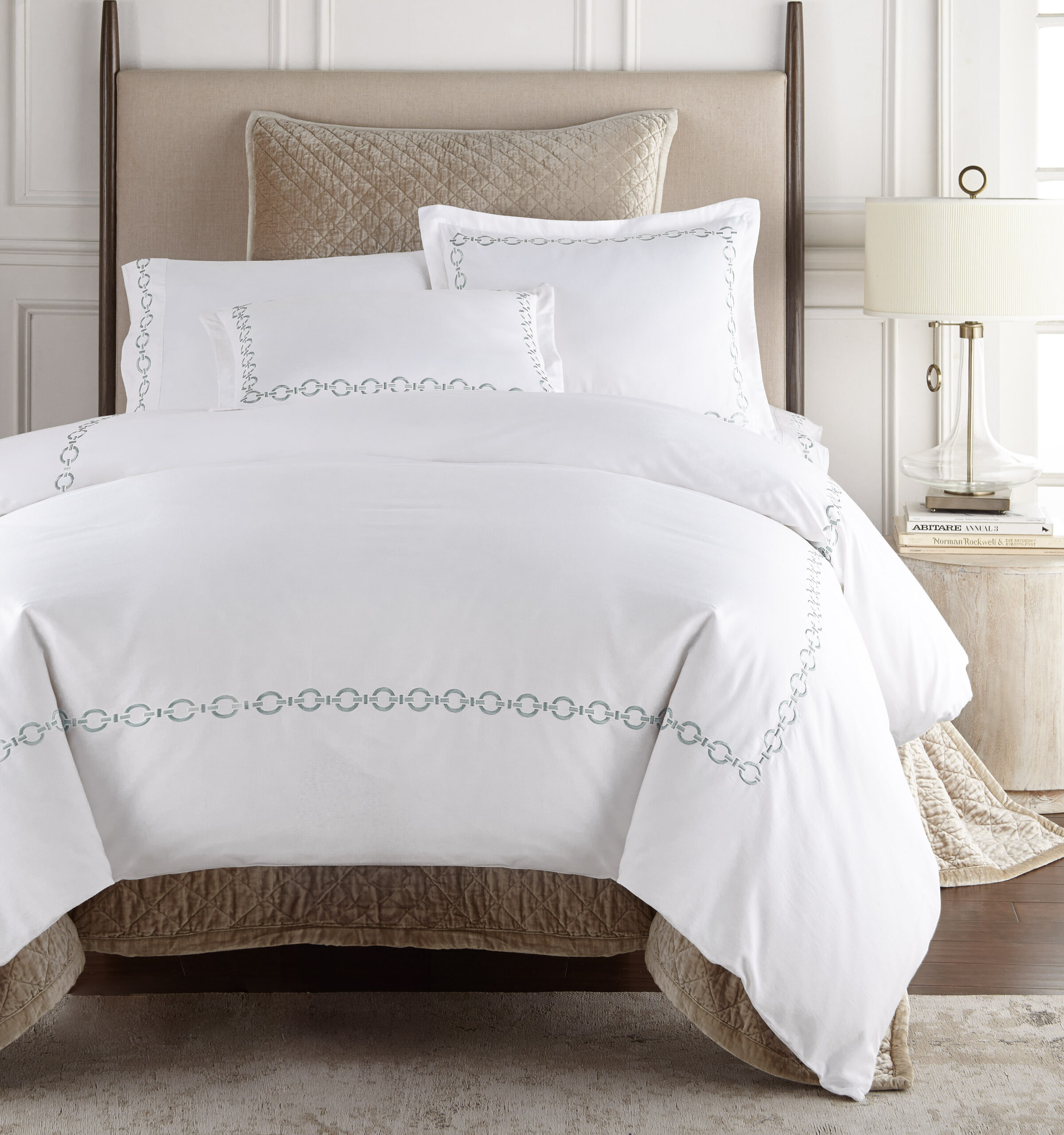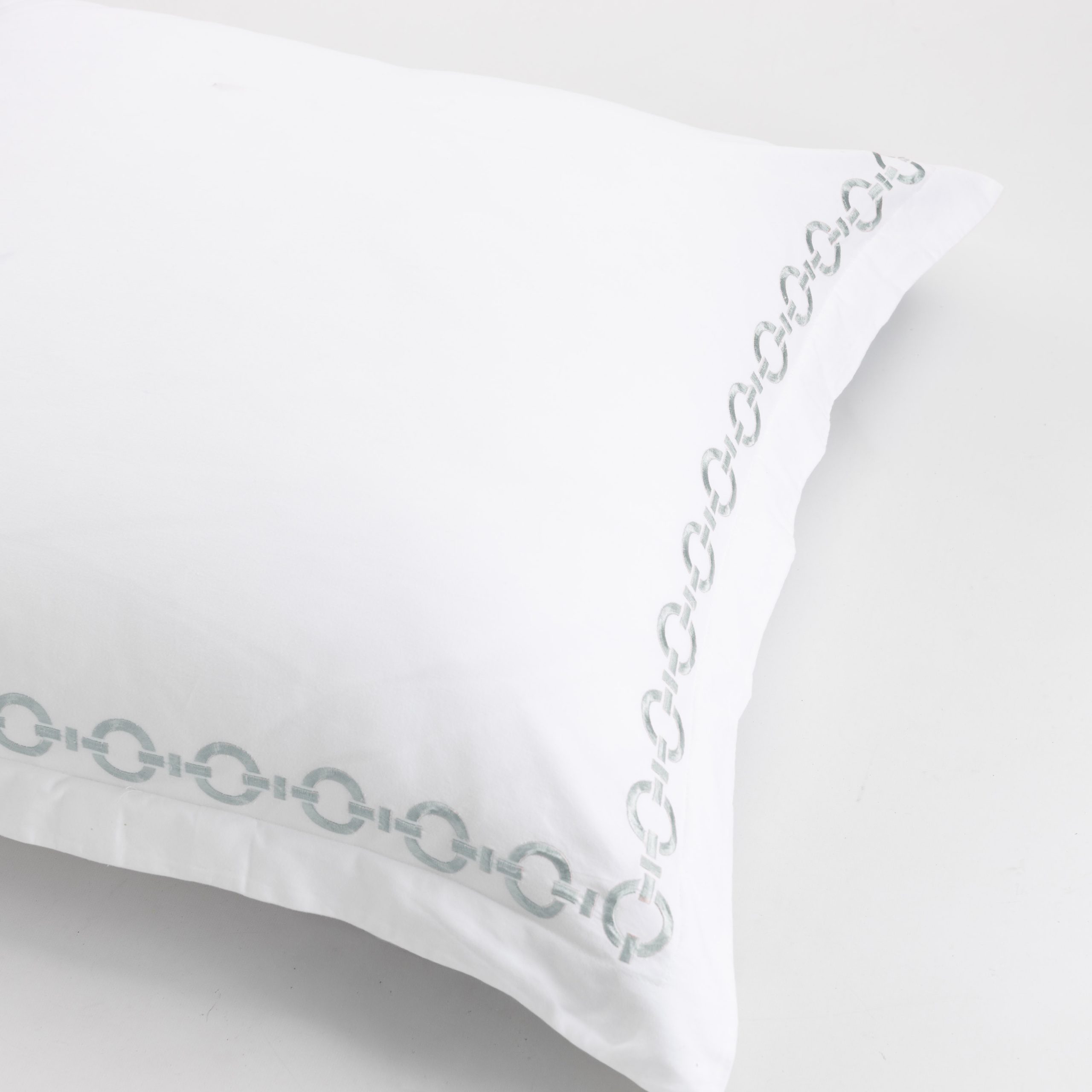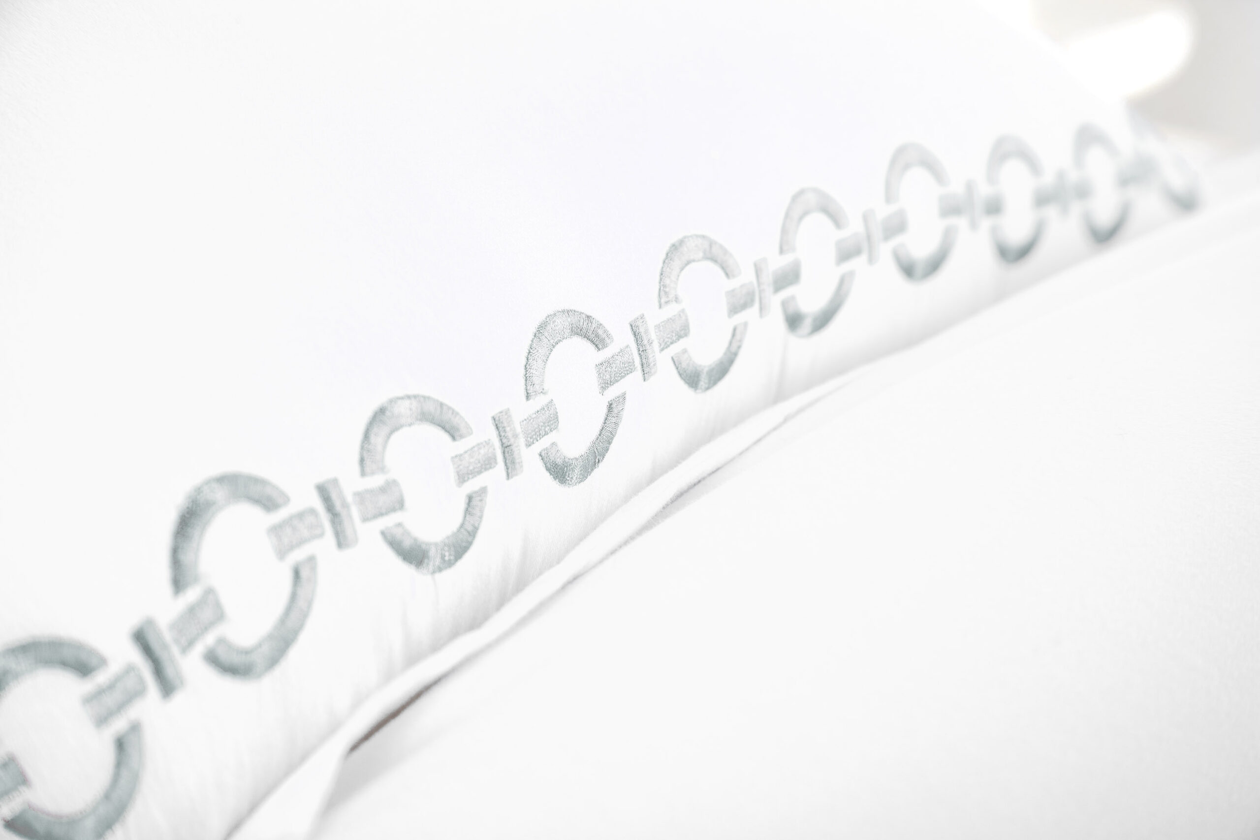 Simply luxurious, this collection is constructed of fine 400 thread count cotton sateen and adorned with a modern chain link style embroidery. The sateen weave provides an easy drape and supple hand, while maintaining a crisp appearance. Embroidery in a soft seagalss coloration lends this collection to a wide variety of styles and sensibilities.