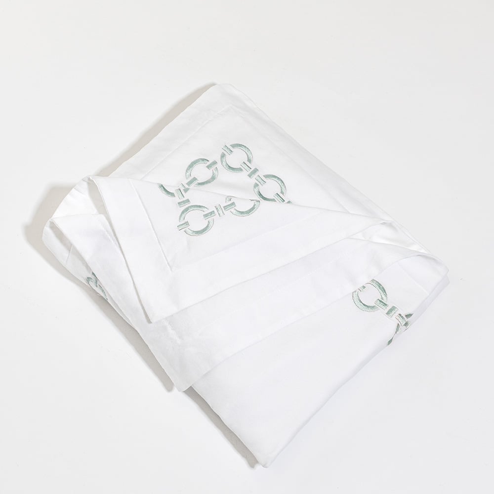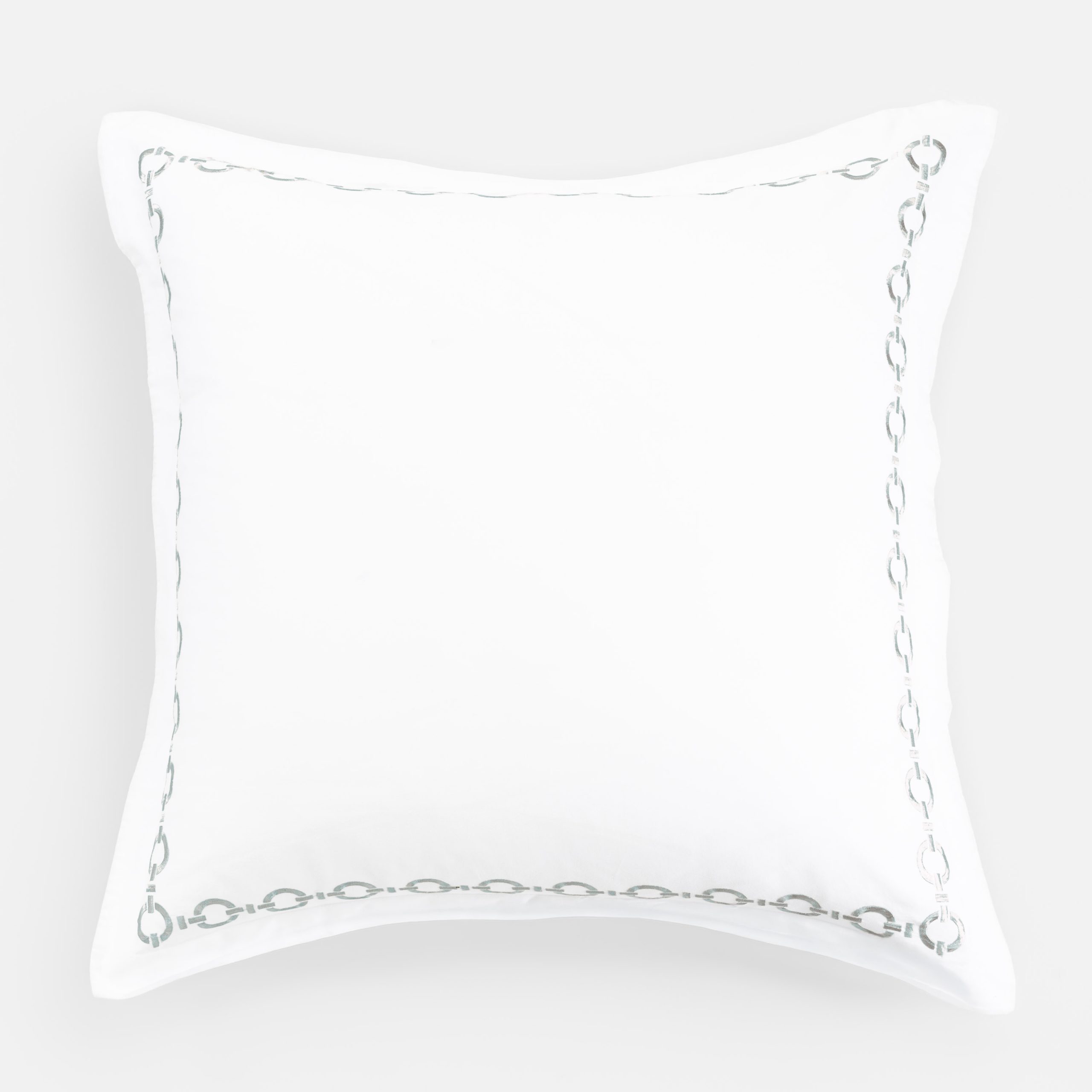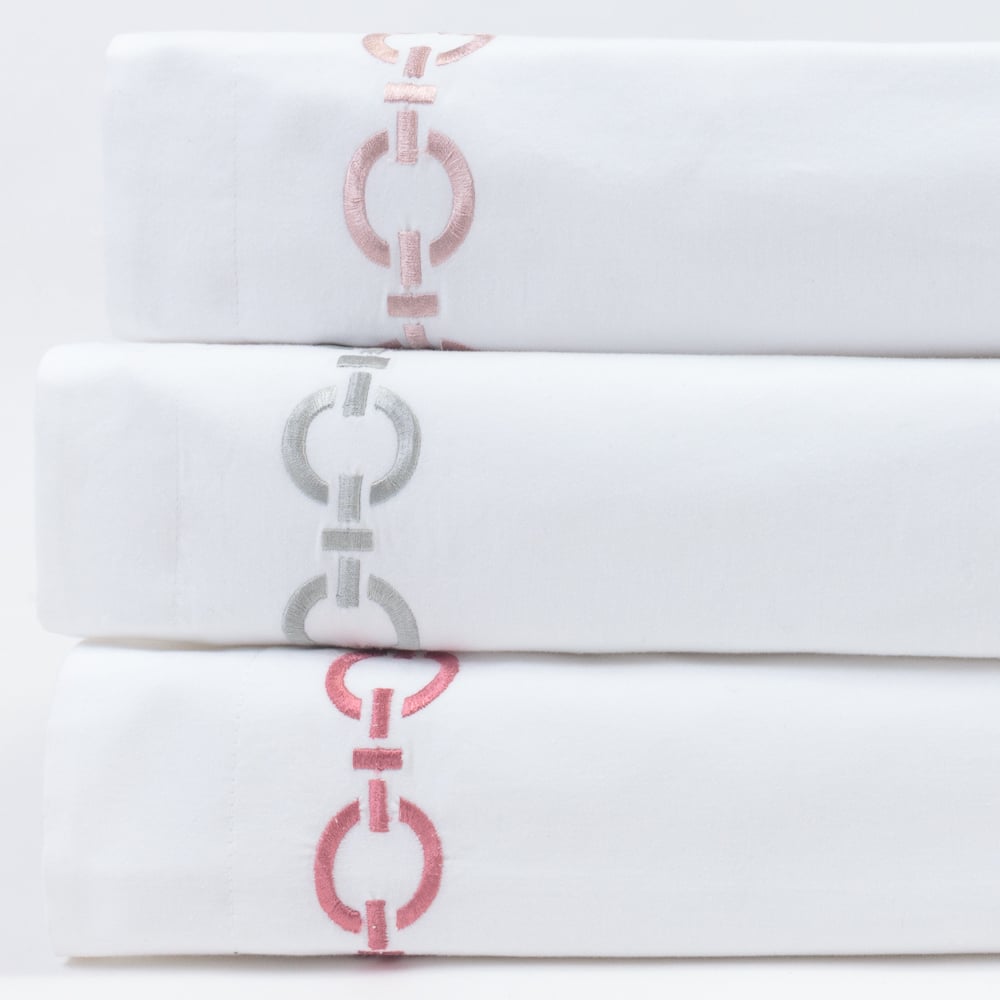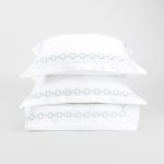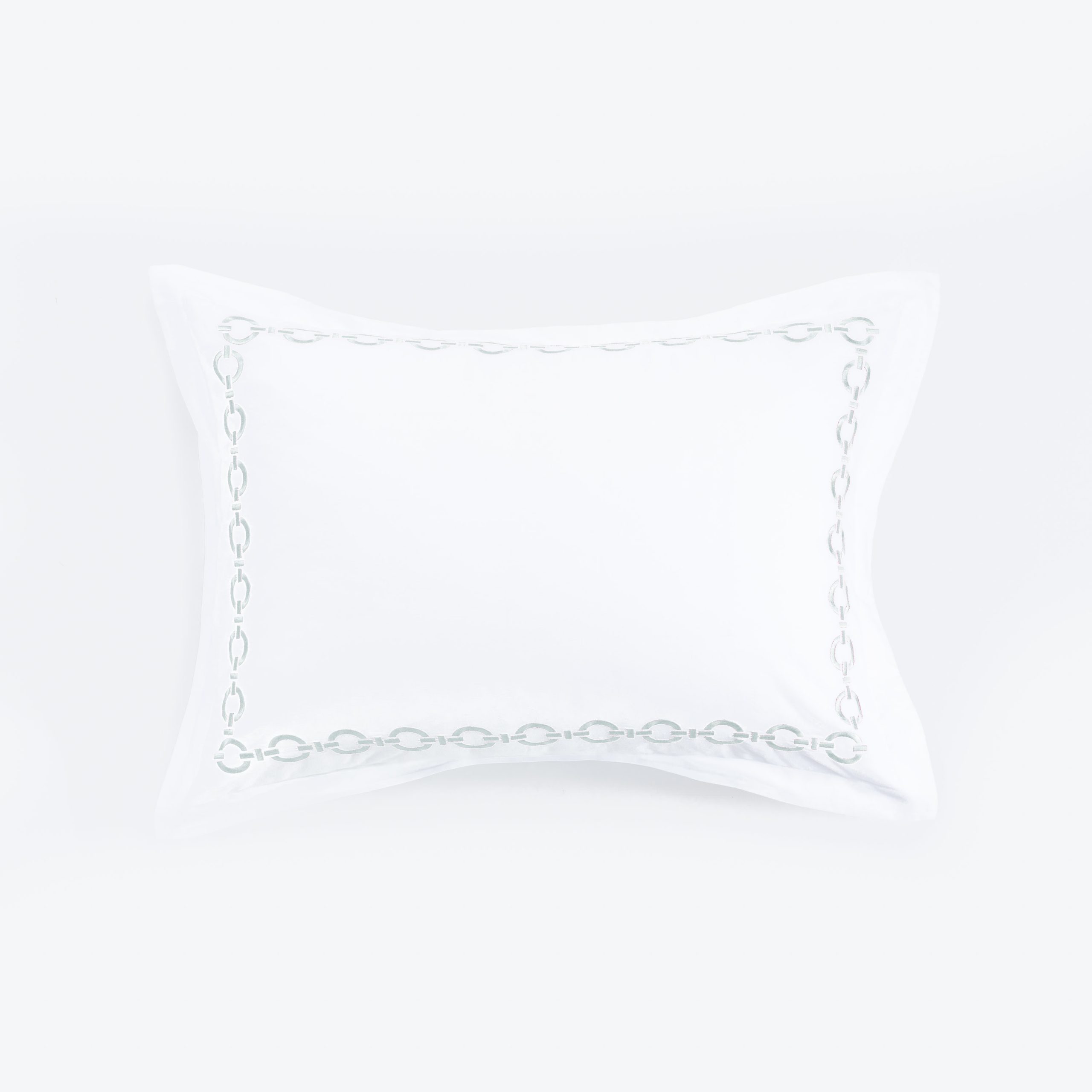 Simply luxurious, this collection is constructed of fine 400 thread count cotton sateen and adorned with a modern chain link style embroidery. The sateen weave provides an easy drape and supple hand, while maintaining a crisp appearance. Embroidery in a soft seagalss coloration lends this collection to a wide variety of styles and sensibilities.