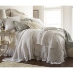 Play up the casual feminine flare of the Bellamy duvet cover with more textures and ruffles all in layers of white in ivory. The Hadon Ivory quilt provides a sleek yet soft base layer, while the Micah cotton coverlet gives weight to the lofty ensemble. Keep it neutral or add just a touch of sun-soaked color for subtle interest.
