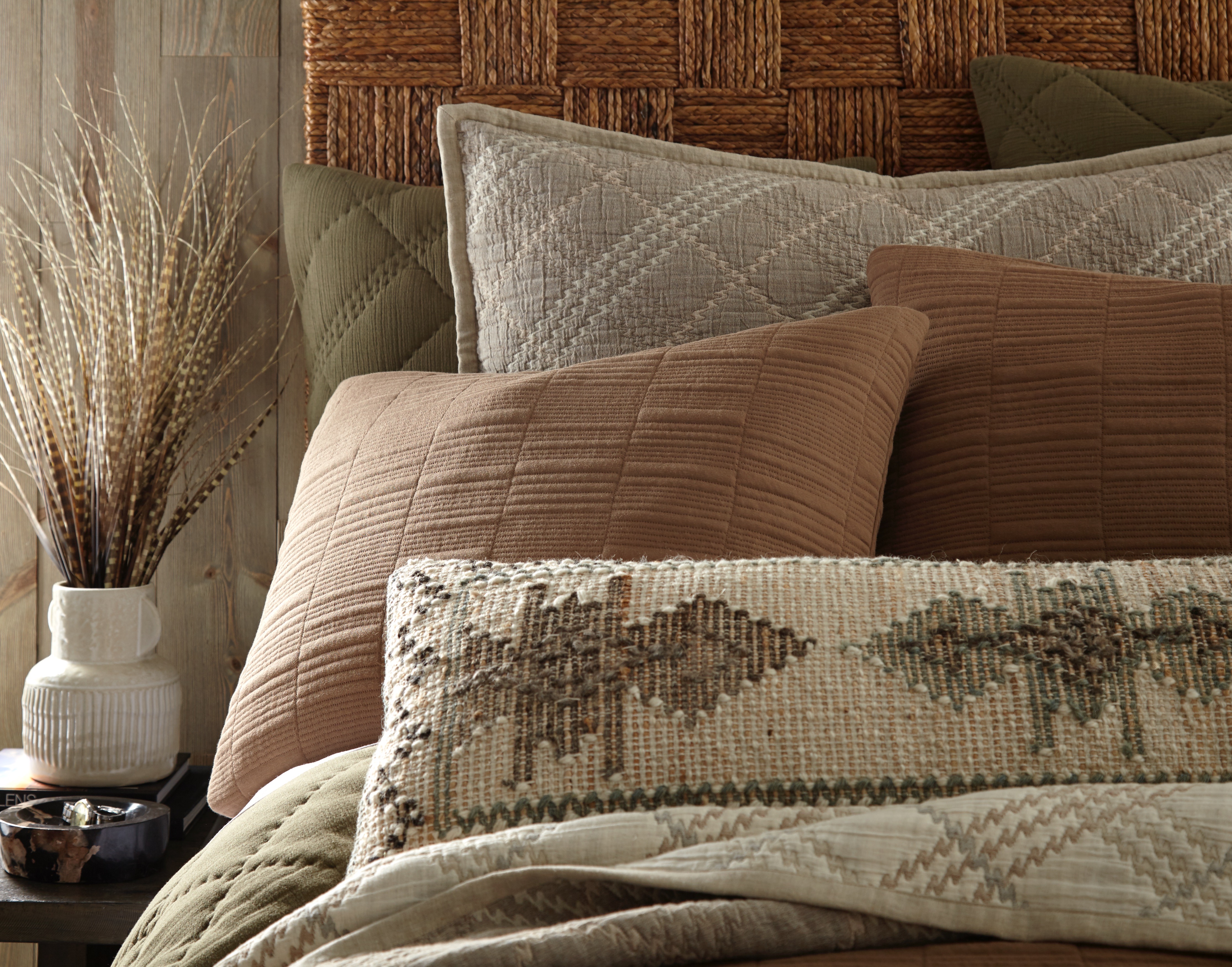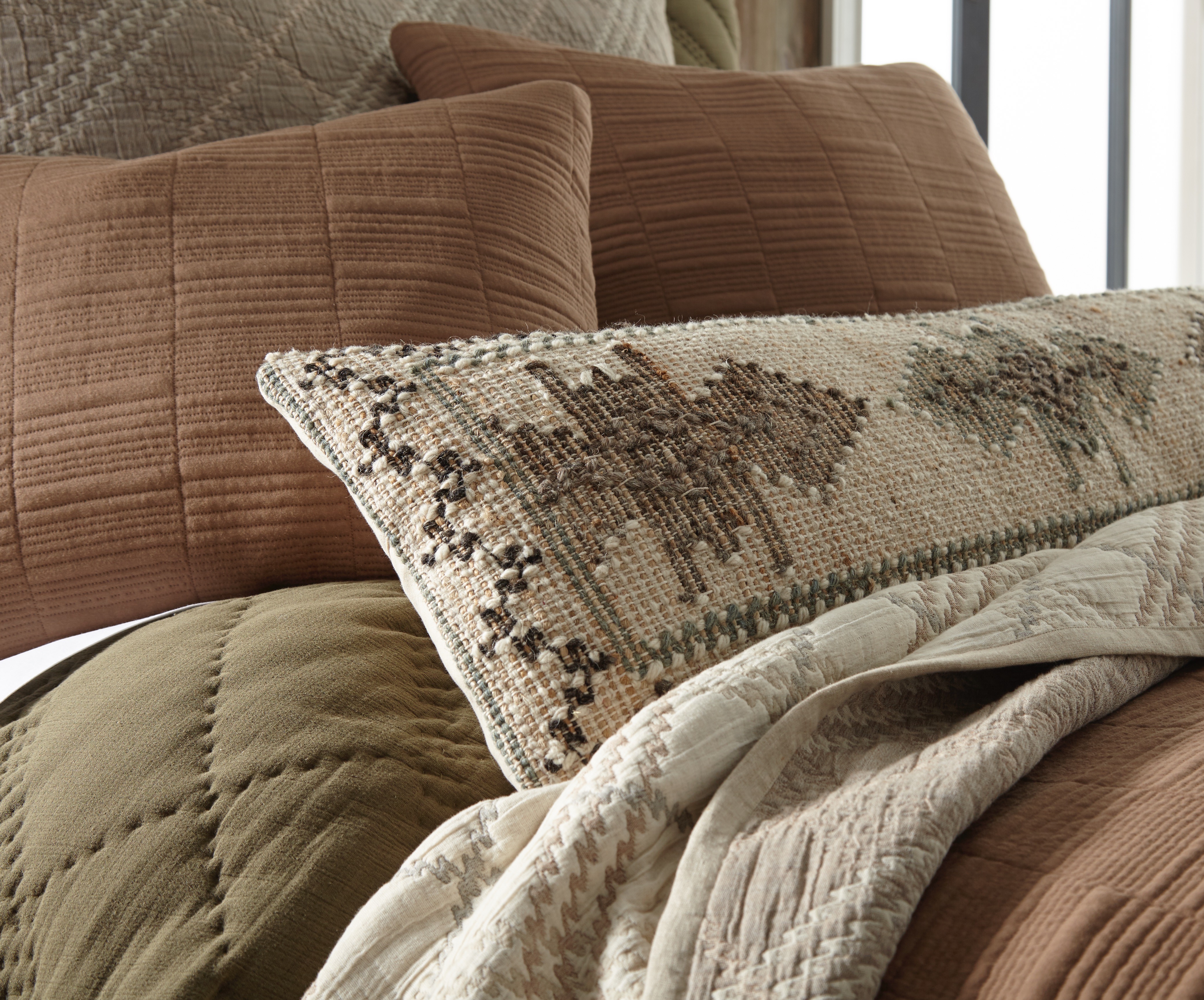 For the final layer, the Somaya collection acts as the ultimate textural chameleon. With its fine cotton knit and tailored texture, it seamlessly transitions from a polished sleeping layer to a casually draped accent, reinforcing the ensemble’s adaptable nature. The Aztec-inspired accent pillow completes the look, offering a subtle global influence that adds just the right amount of visual interest. The result is a bed that’s rich in tone, tactile in feel, and effortlessly stylish—a space that invites you to sink in and unwind, no matter your style.
