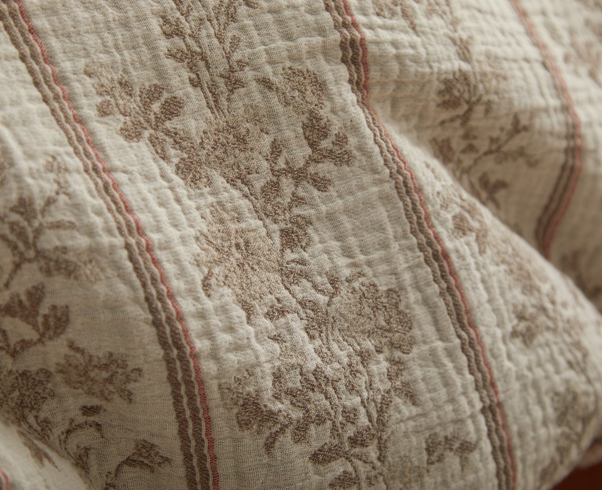 Brooke gives French provincial floral stripes a modern update. The duvet’s traditionally crisp, decorative motif is reimagined in a cotton muslin double cloth that feels exceptionally soft and naturally relaxed.