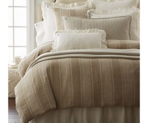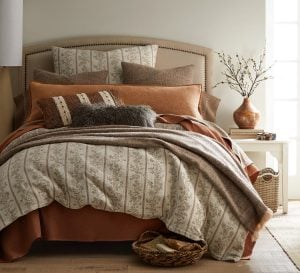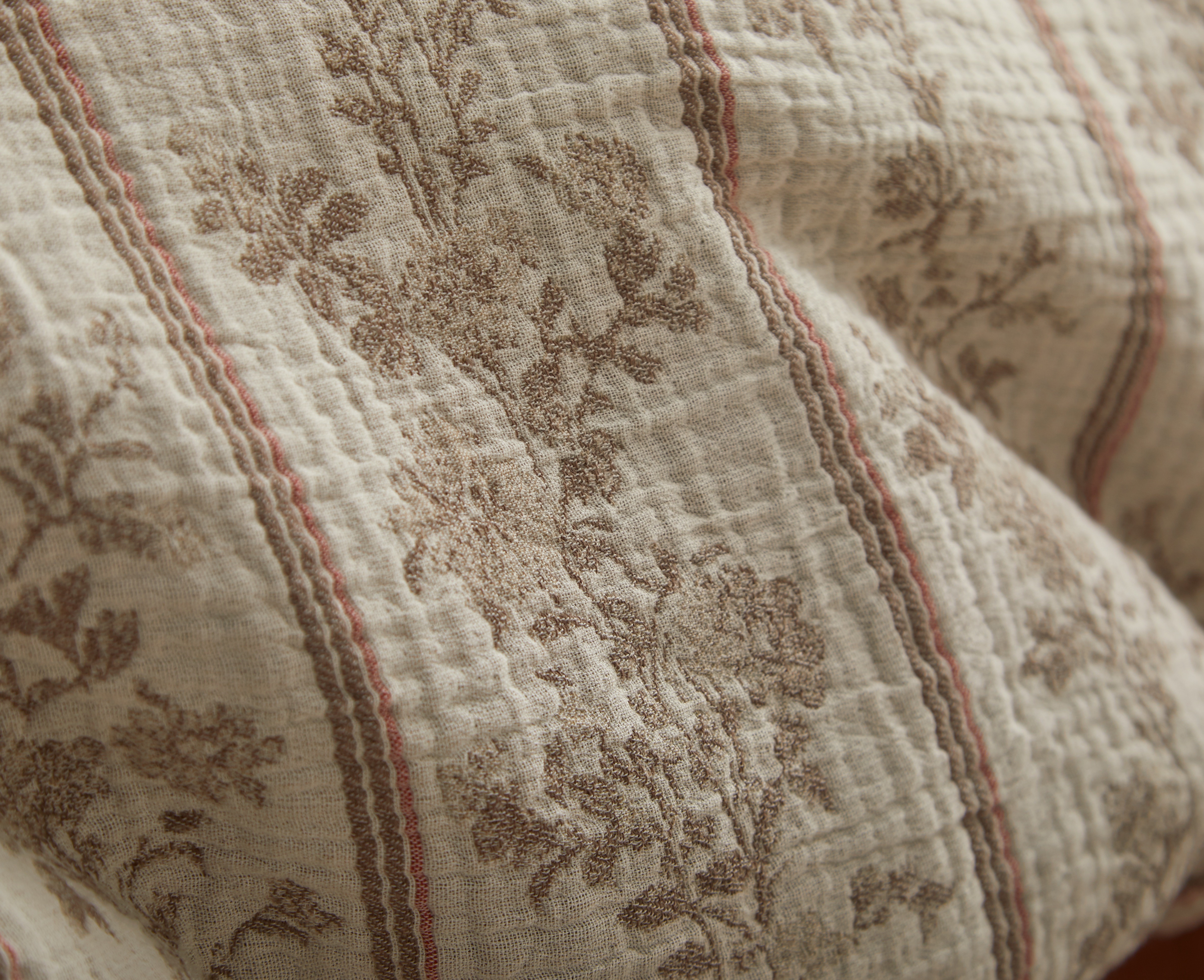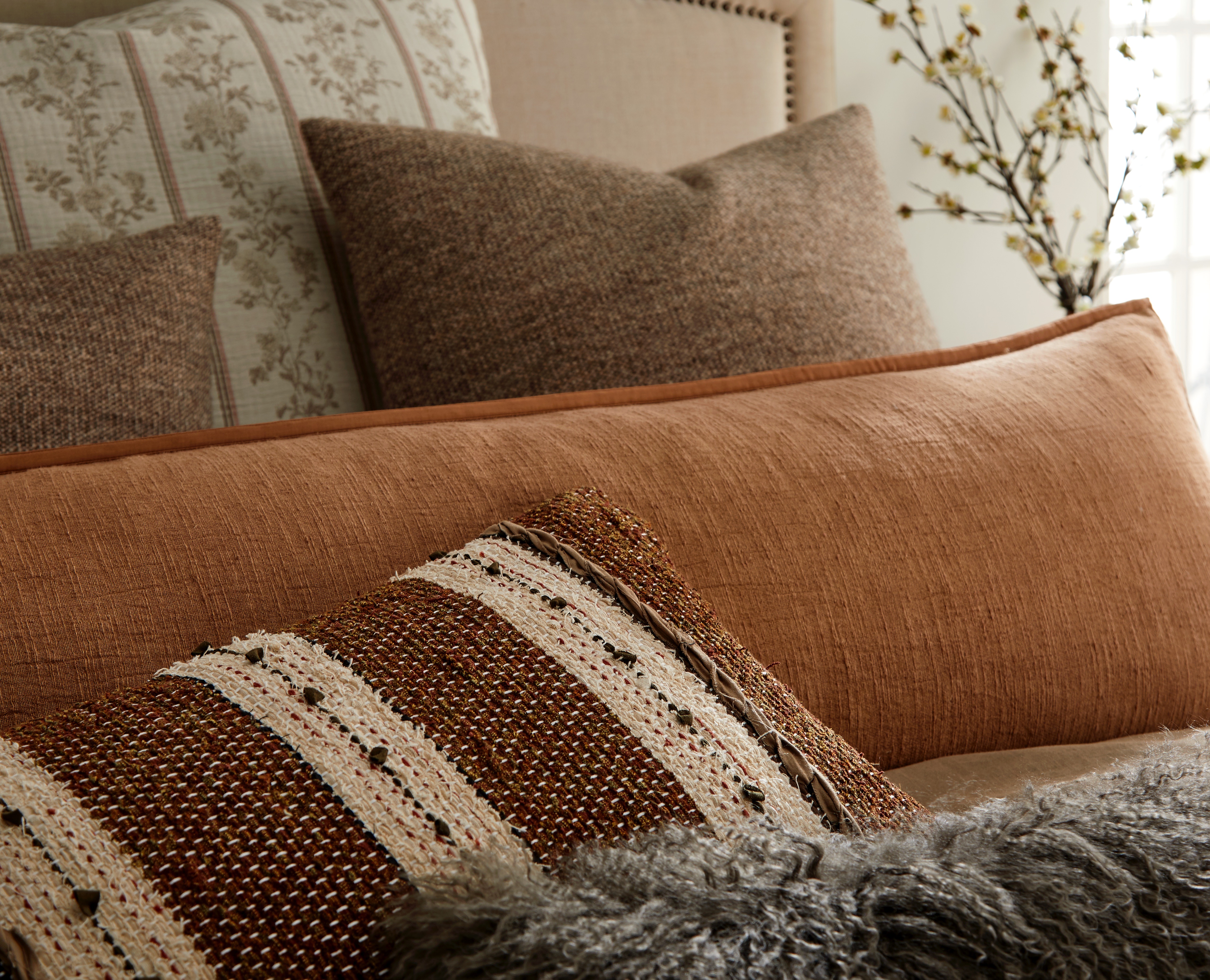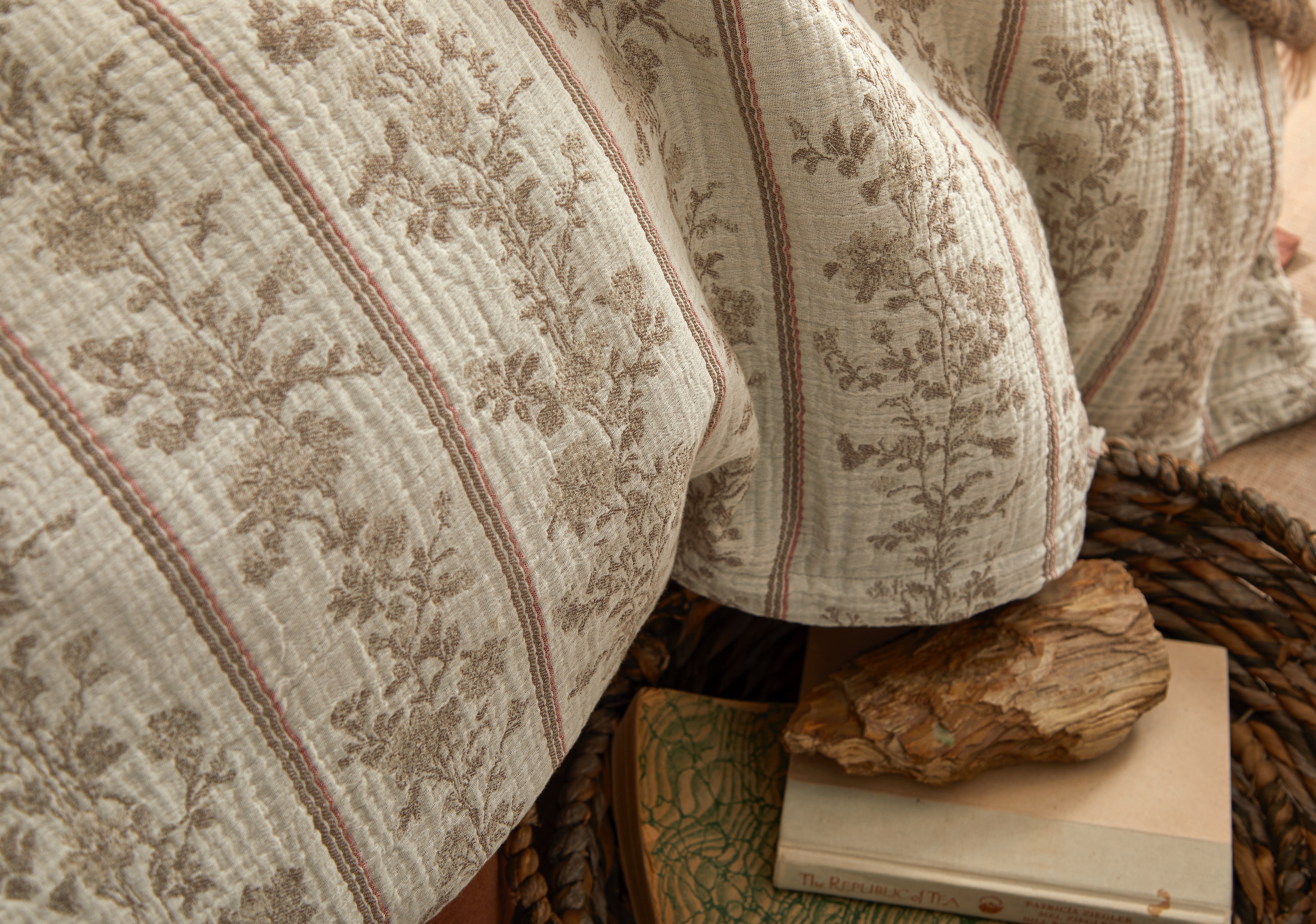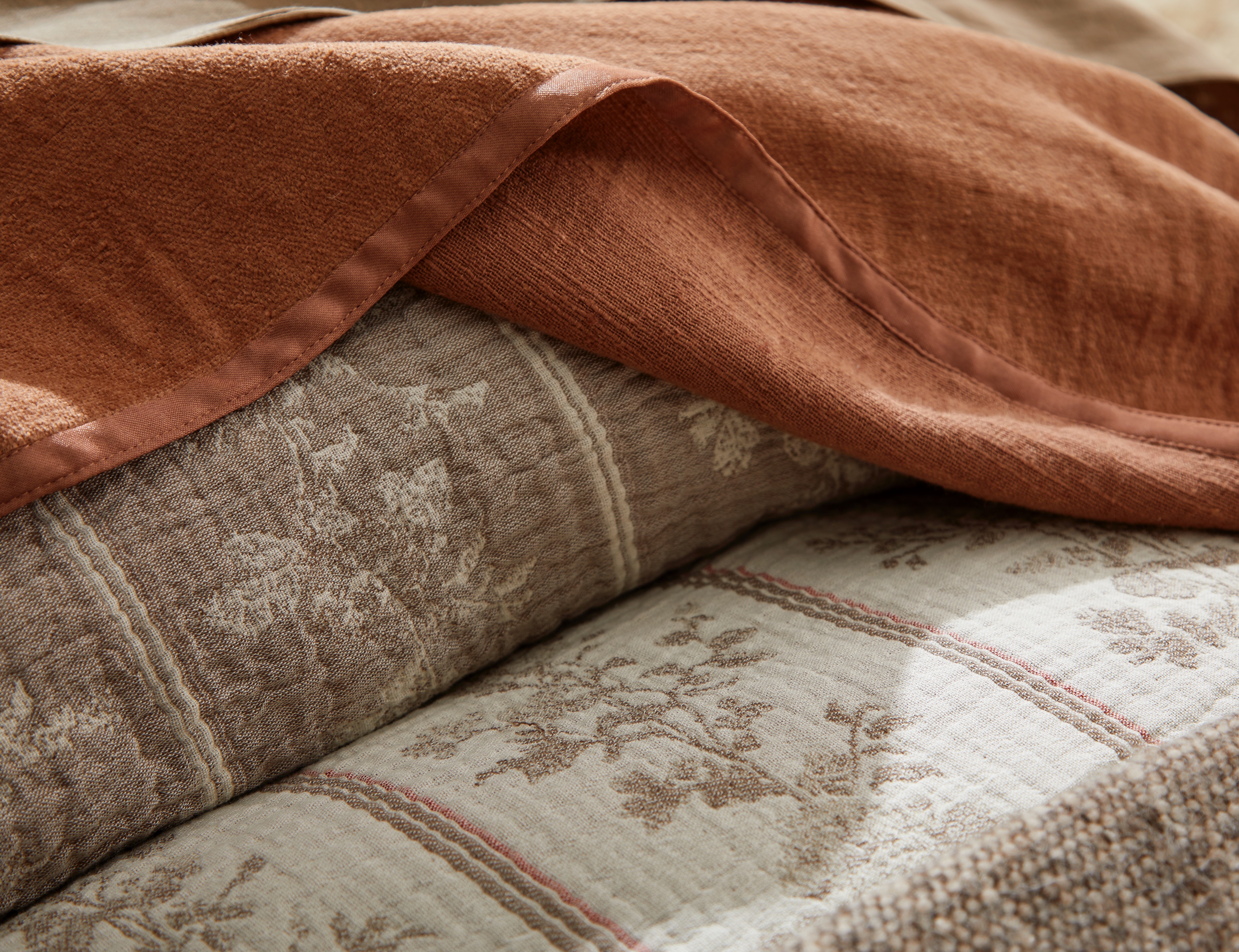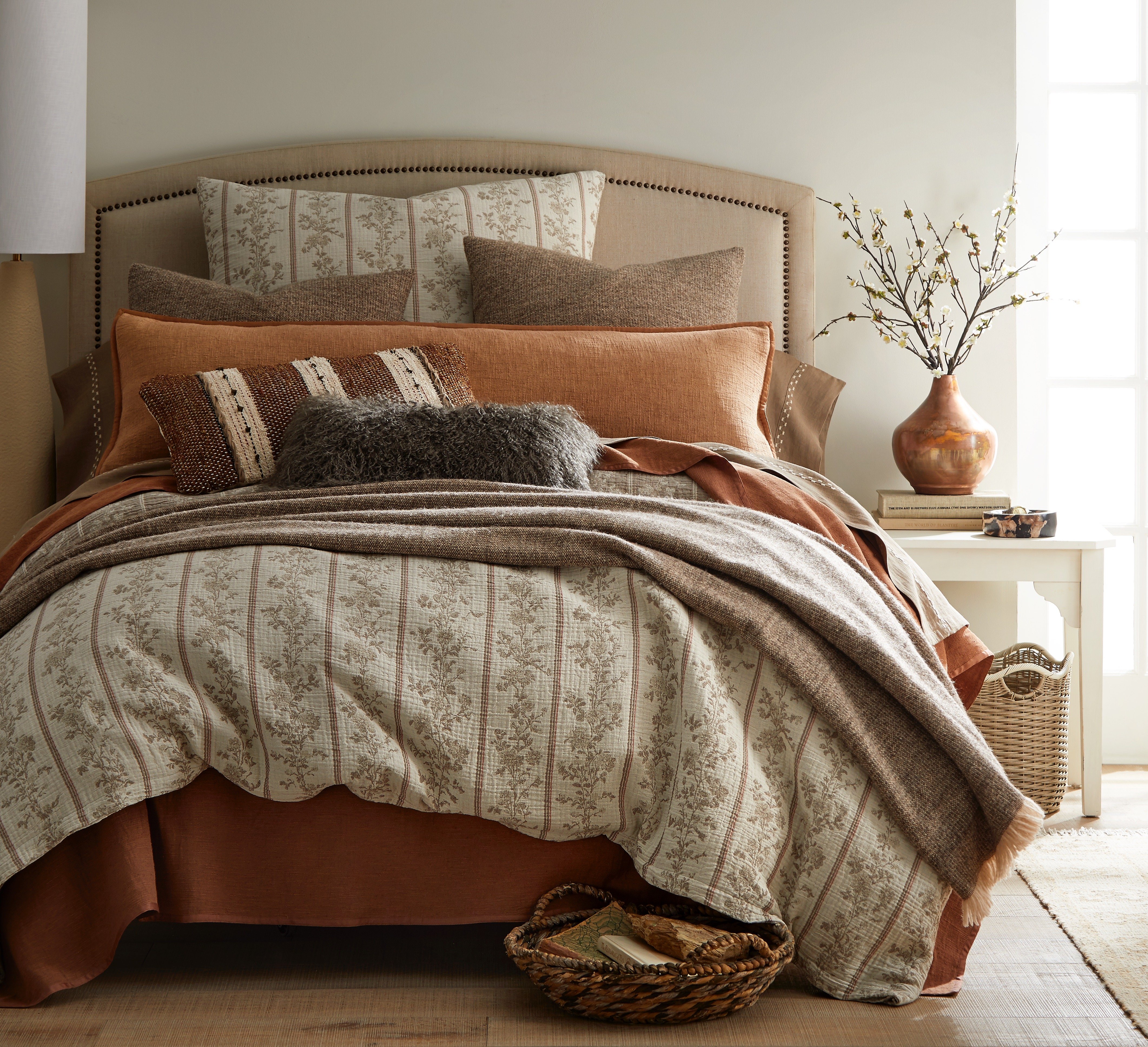 This ensemble reimagines the charm of French provincial floral stripes through a modern lens. The duvet’s motif, traditionally crisp and decorative, is rendered in a cotton muslin double cloth that creates an exceptionally soft, swaddle-like hand and an effortlessly relaxed sensibility. Warm copper tones echo the pattern’s understated elegance, adding depth and grounding the palette. A chestnut alpaca blanket drapes across the bed with its naturally airy loft and refined texture, introducing a layer of quiet luxury.