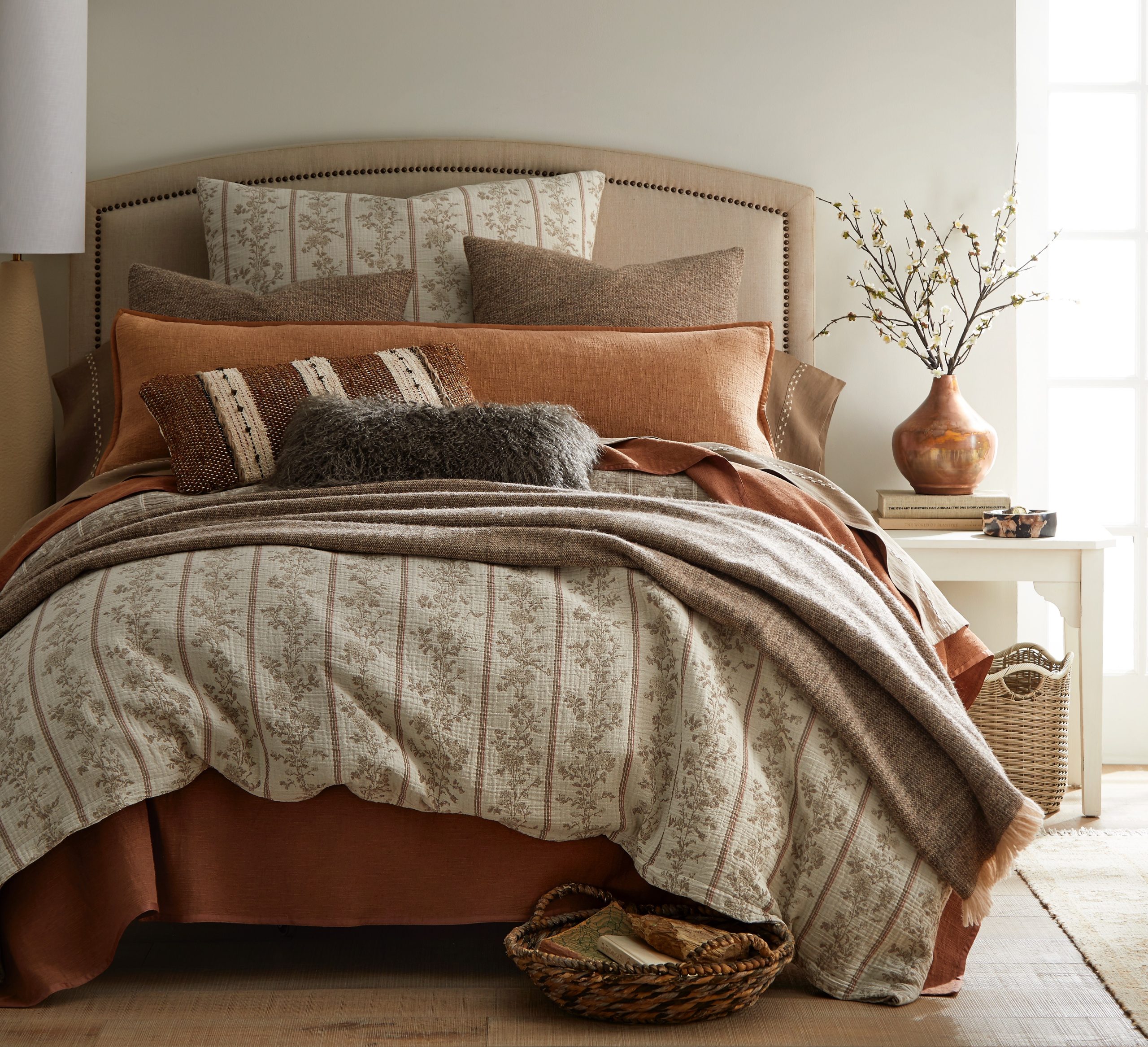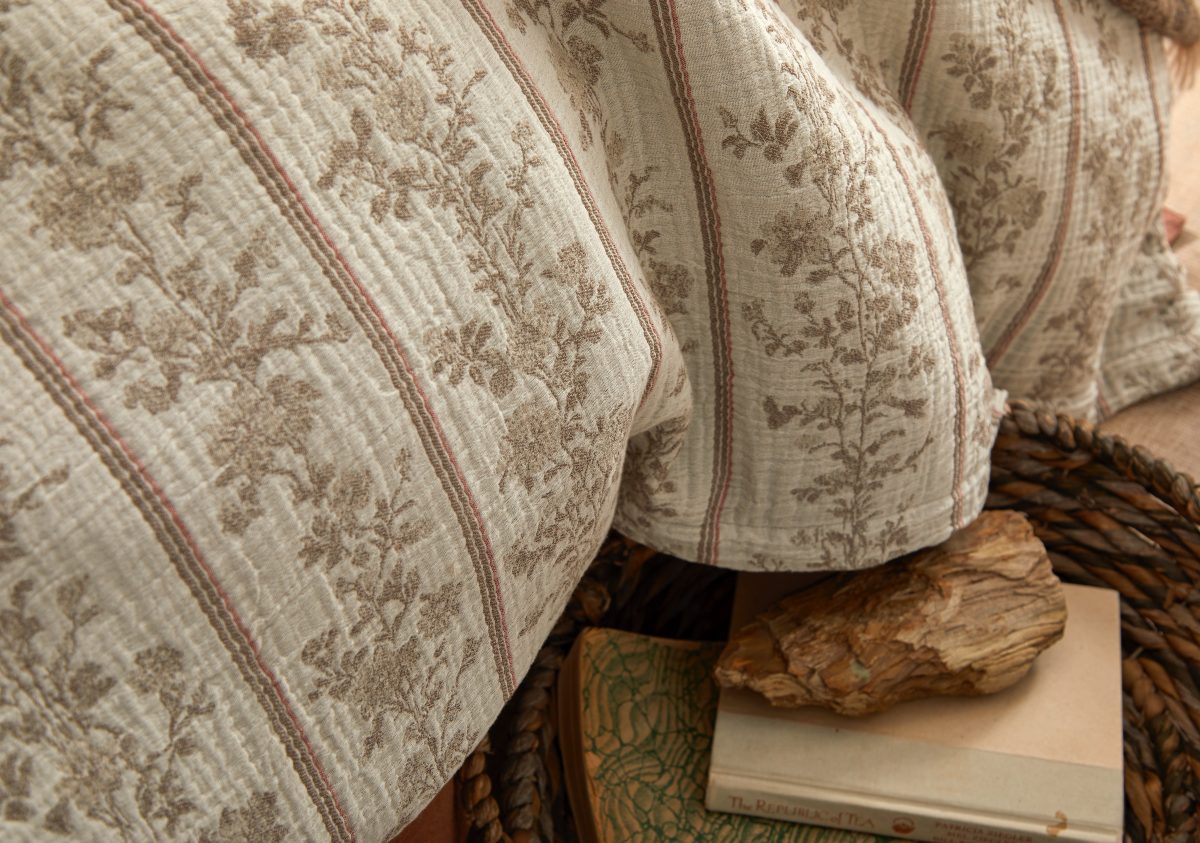 Brooke gives French provincial floral stripes a modern update. The duvet’s traditionally crisp, decorative motif is reimagined in a cotton muslin double cloth that feels exceptionally soft and naturally relaxed.