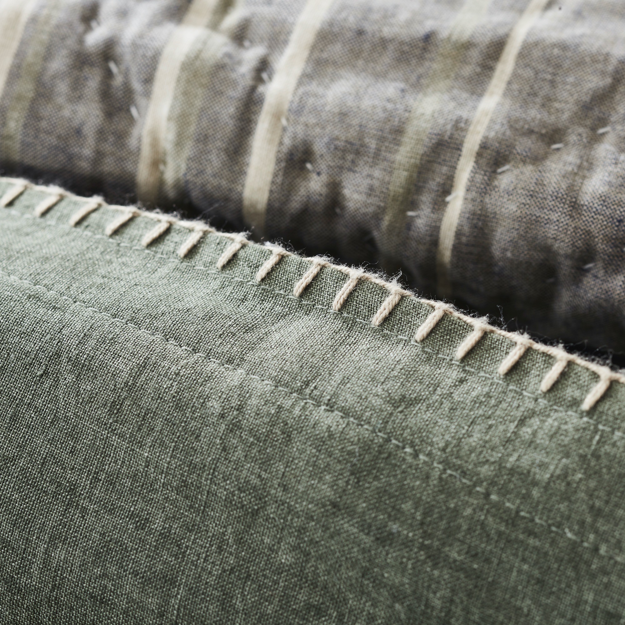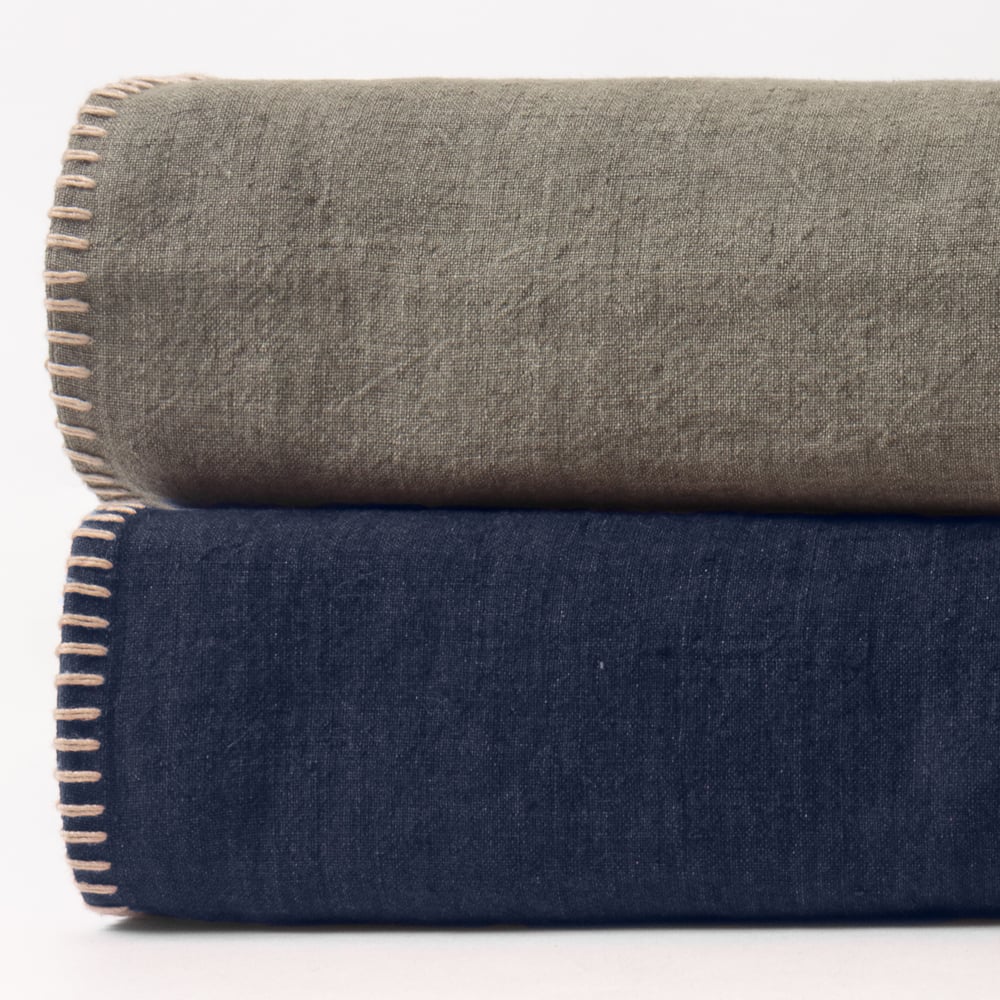 The linen fiber was dyed before being spun, to give this linen a worn vintage look.