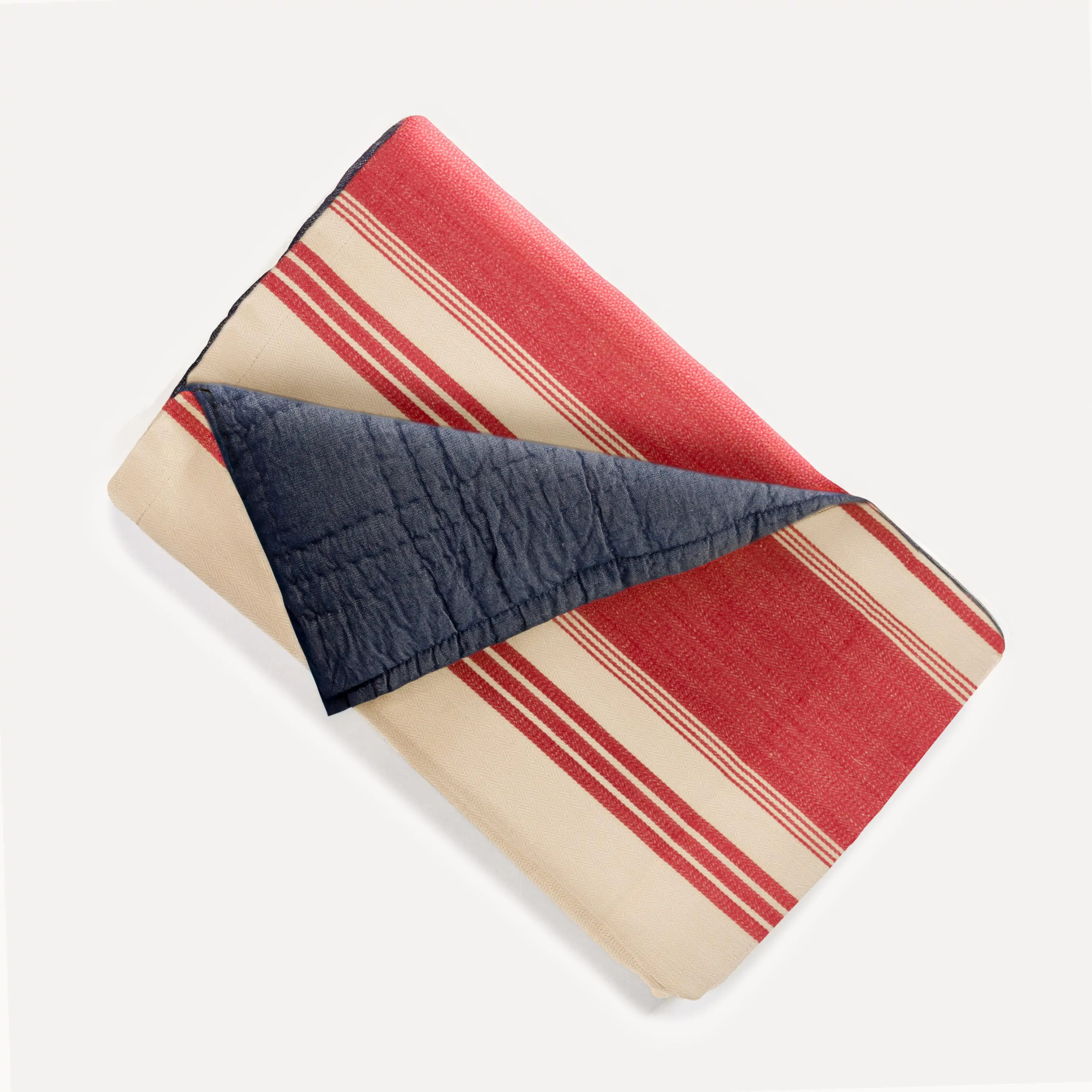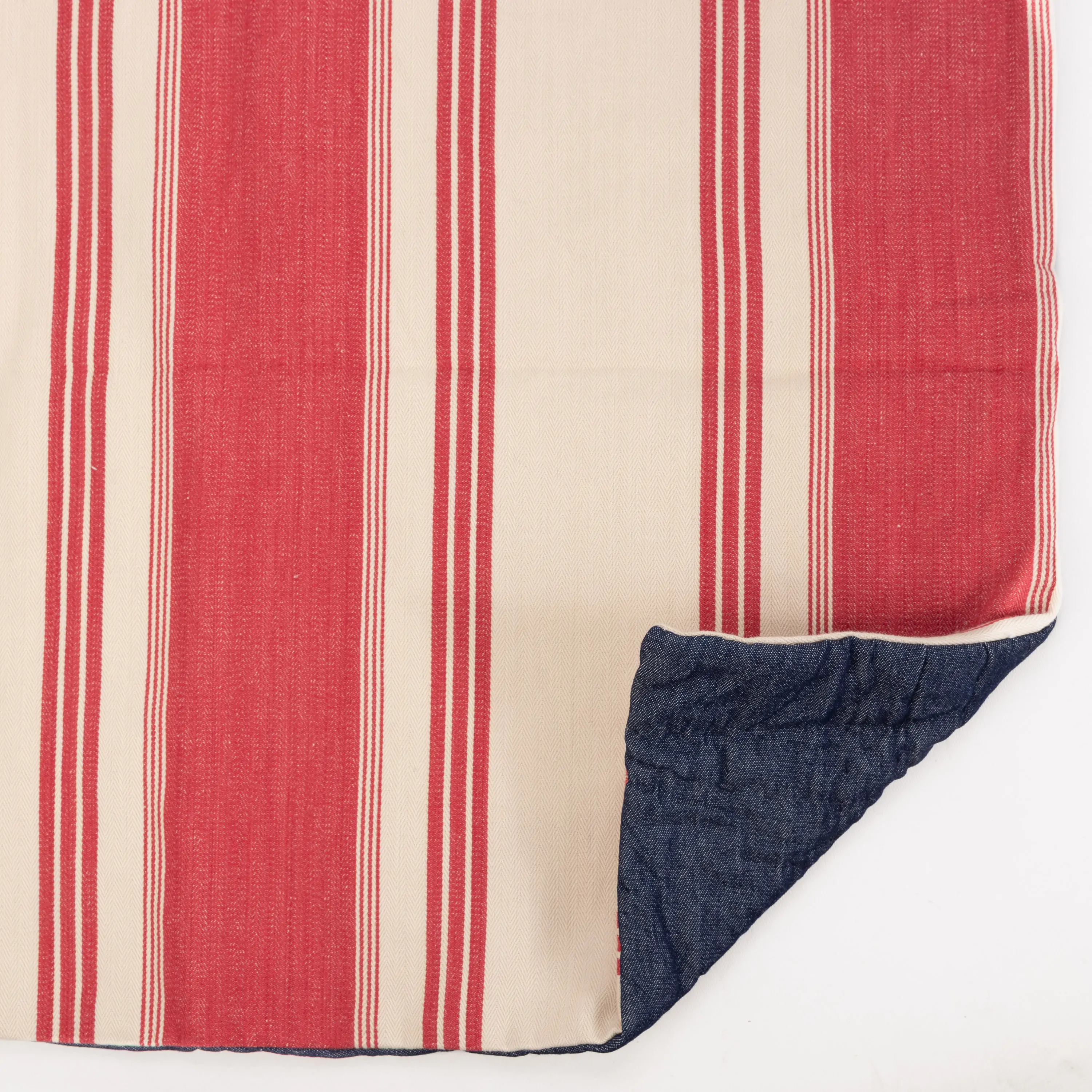 A mid-weight cotton, yarn dyed into a classic two-tone woven collegiate stripe. This sturdy stripe is backed with denim and hand quilted.