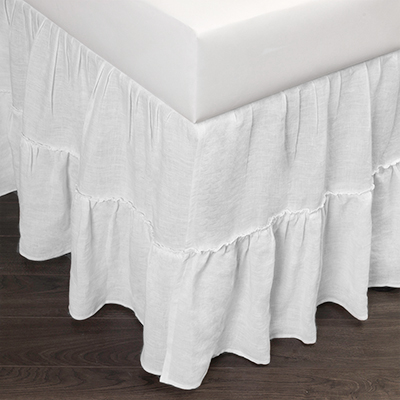 100% Linen, gathered bed skirt, with another layer of ruffle half way down. Bed Skirt comes as 3 Panels, in drop length + 3 inch deck, and may require pins ( Pins are not included) Sizes
