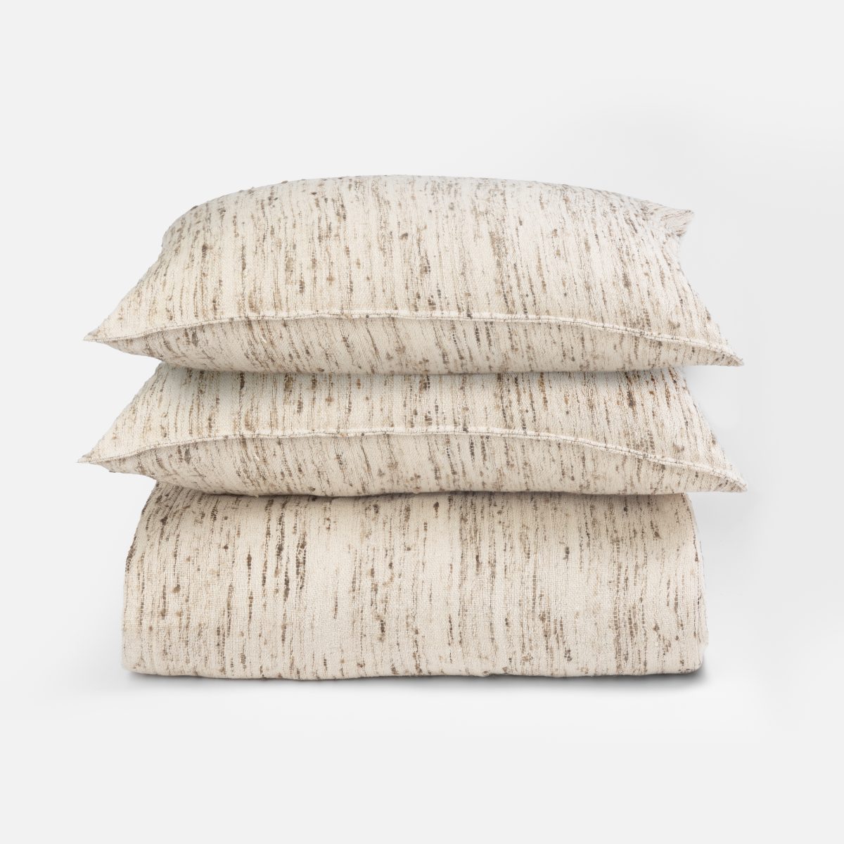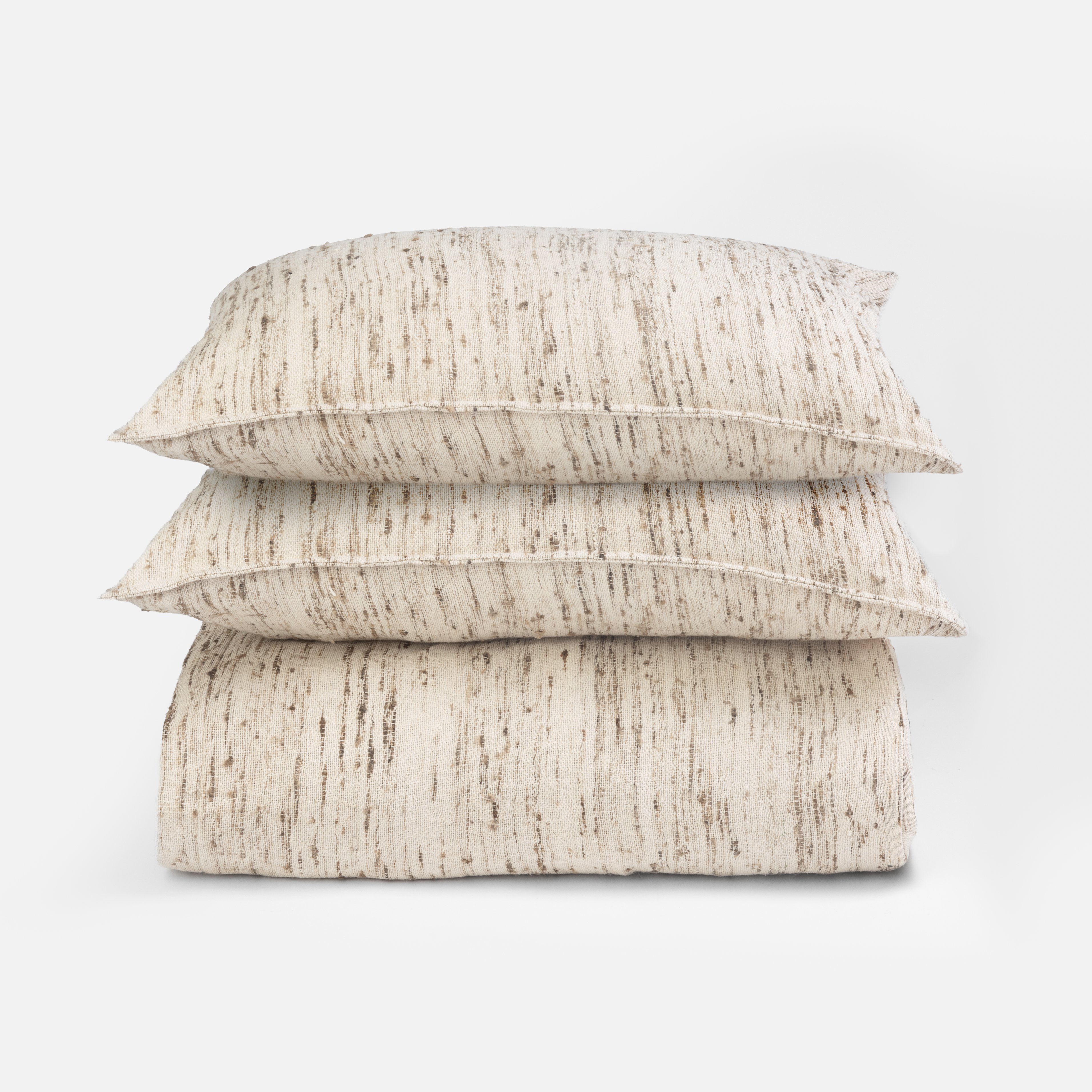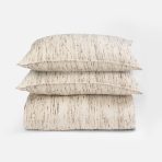 This duvet cover offers a perfect blend of casual elegance and timeless sophistication. Handloomed with a mix of natural cotton and raw silk slubs, it has a distinct tweed-like effect that adds rich texture and depth to its appearance. The classic raw silk look, with its subtle variations and natural imperfections, enhances the cover’s organic charm. This duvet cover is not only a visual delight but also an exquisite tactile experience, making it an ideal choice for those who appreciate understated luxury and artisanal craftsmanship.