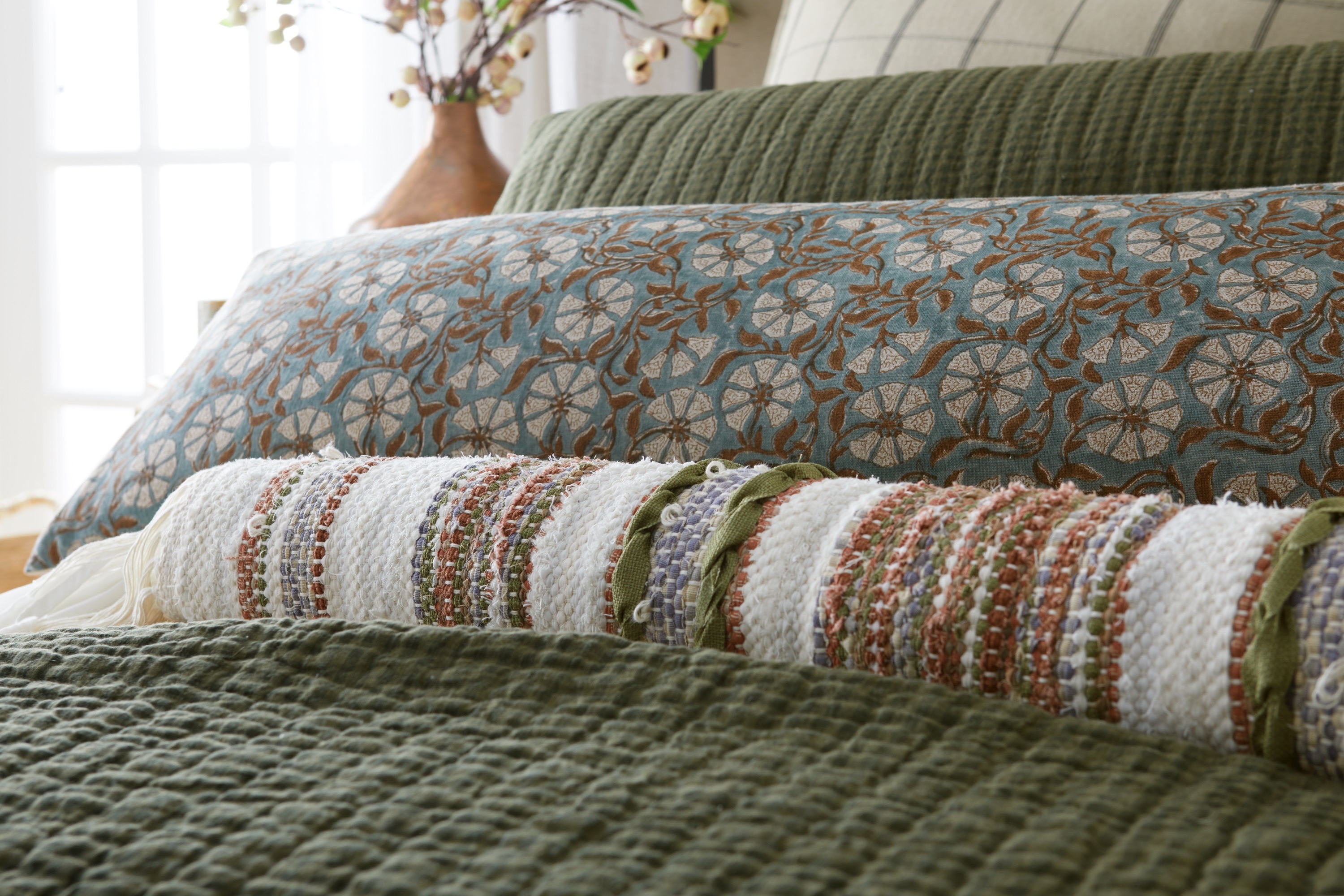 Part of the WEAVING A BETTER LIFE program, the Crawford Pencil Bolster is hand woven from up-cycled, dead-stock materials and supports individuals struggling with low in-come and homelessness.