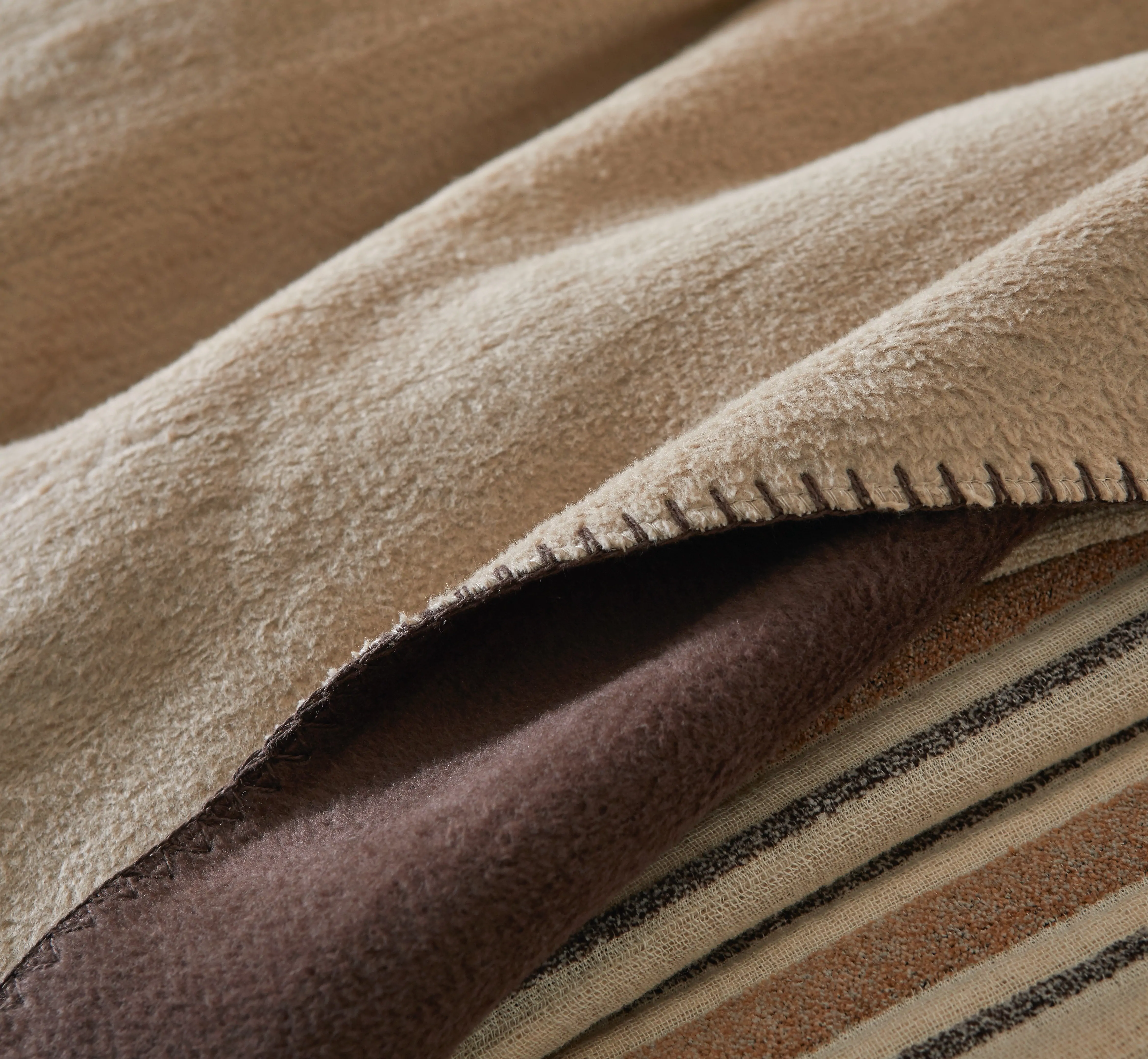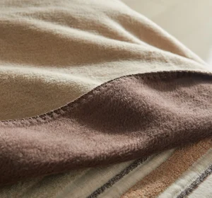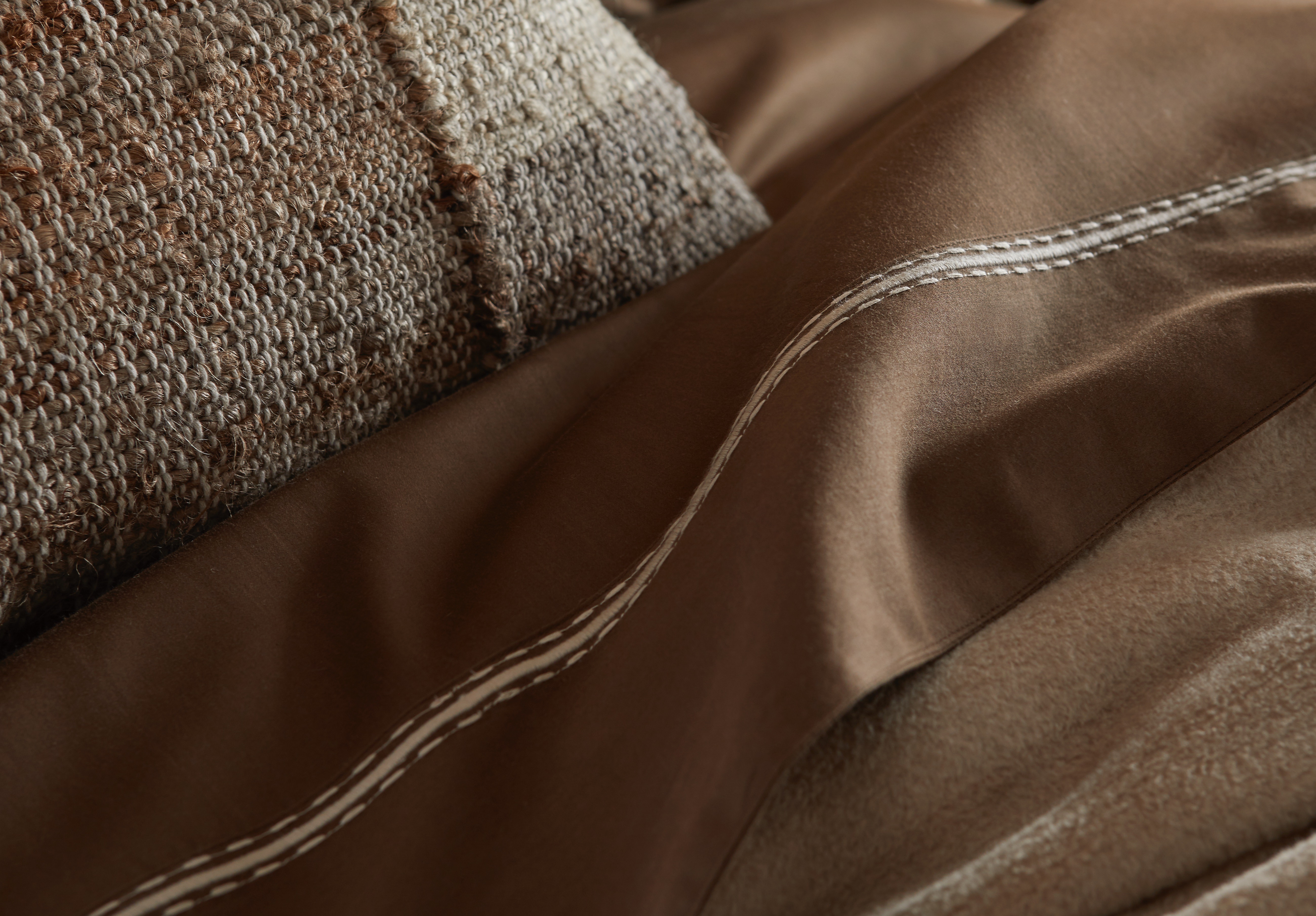 Draped above, the Culver Coverlet introduces additional depth and softness. Crafted from 100% cotton and brushed for an exceptionally plush hand, Culver offers a comforting weight and enduring quality. Reversible from warm oatmeal to rich tobacco brown and finished with a classic blanket stitch, it brings versatility and timeless character while enhancing the layered visual warmth of the bed.