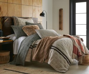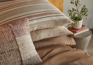 This layered ensemble brings together texture, warmth, and natural refinement in a composition designed to feel both grounded and inviting. At its foundation, the Ferguson Coverlet is woven from soft cotton and finished with subtle chenille stripes that create gentle dimension and tactile interest. The understated pattern adds quiet movement while maintaining a relaxed, tailored appearance.