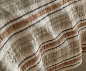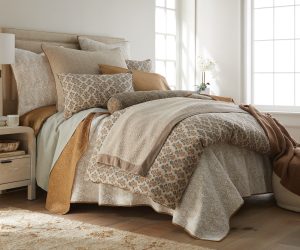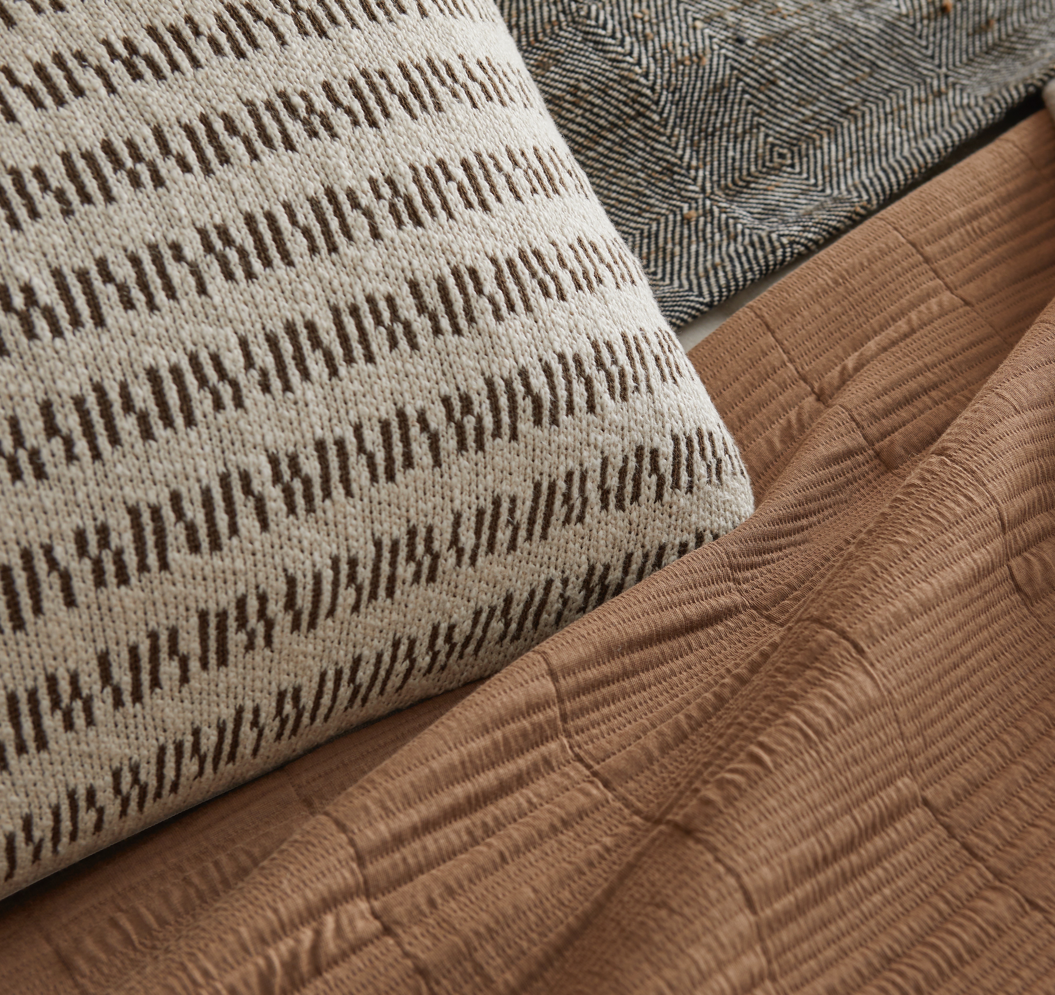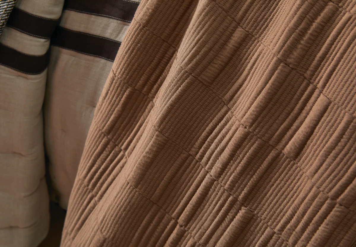 Anchoring the palette, Somaya in Toffee brings the “knit blazer” sensibility to bedding. Crafted from a fine cotton knit with quilting for a perfectly balanced hand, it works beautifully as the under-it-all sleeping layer, a cleanly spread coverlet for polished simplicity, or a casual drape at the foot of the bed—effortlessly versatile, always composed.