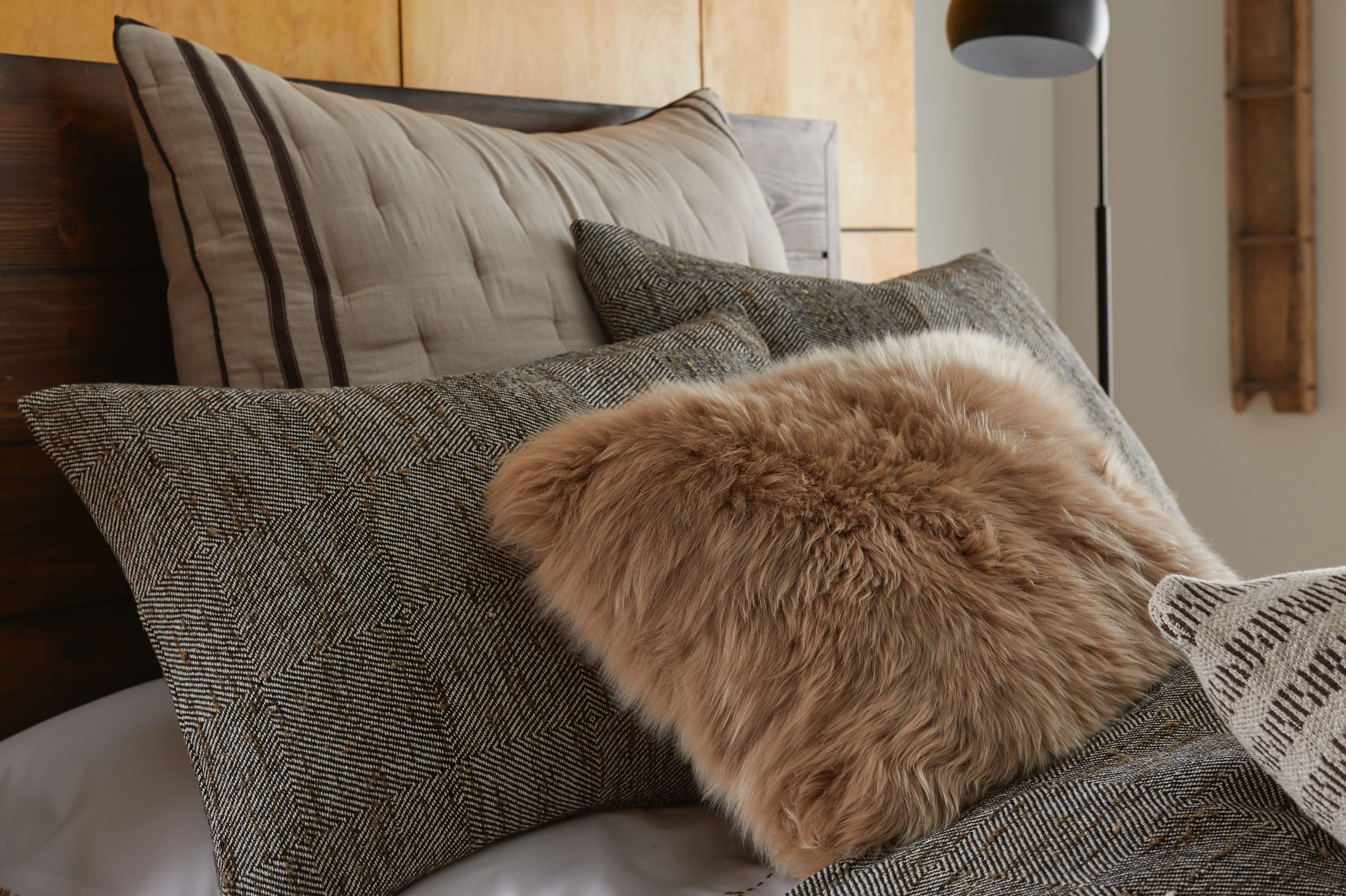 Finishing touches complete the look with warmth and contrast: oversized, textural shams create a grounded backdrop, while a plush shearling accent pillow and a long bolster introduce softness and structure. A luxurious Merino virgin wool throw in autumnal tones adds depth, warmth, and seasonal richness—bringing the entire ensemble together in a refined yet relaxed composition.