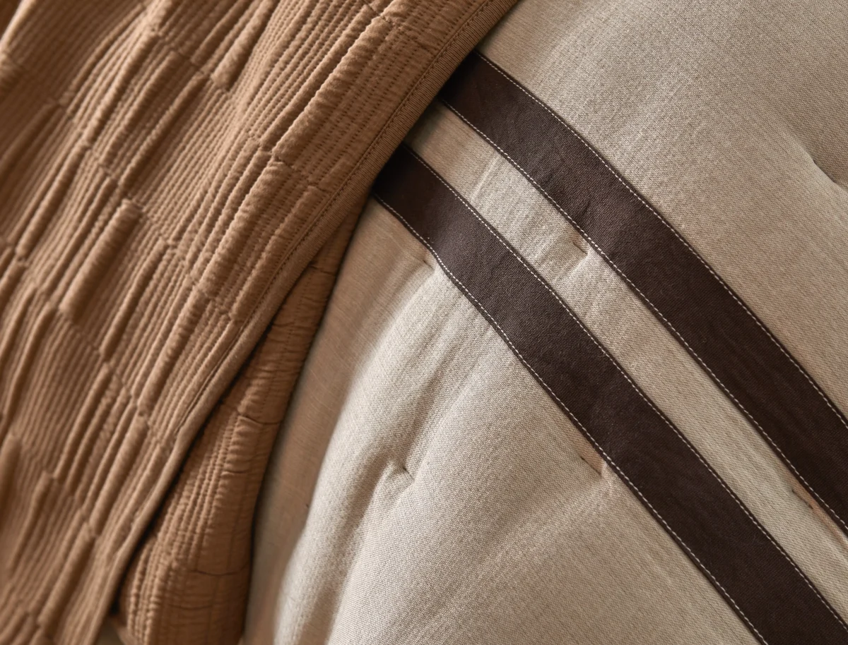 This layered ensemble is a study in relaxed luxury—grounded in natural texture and elevated by thoughtful detailing. The first layer, Merritt, is inspired by athleisure ease: a yarn-dyed canvas of diverse embroidery techniques, richly detailed with running stitches. Lofty fill and a contrasting micro flange enhance the natural cotton texture, giving the quilt a refined, tailored finish with inviting softness.