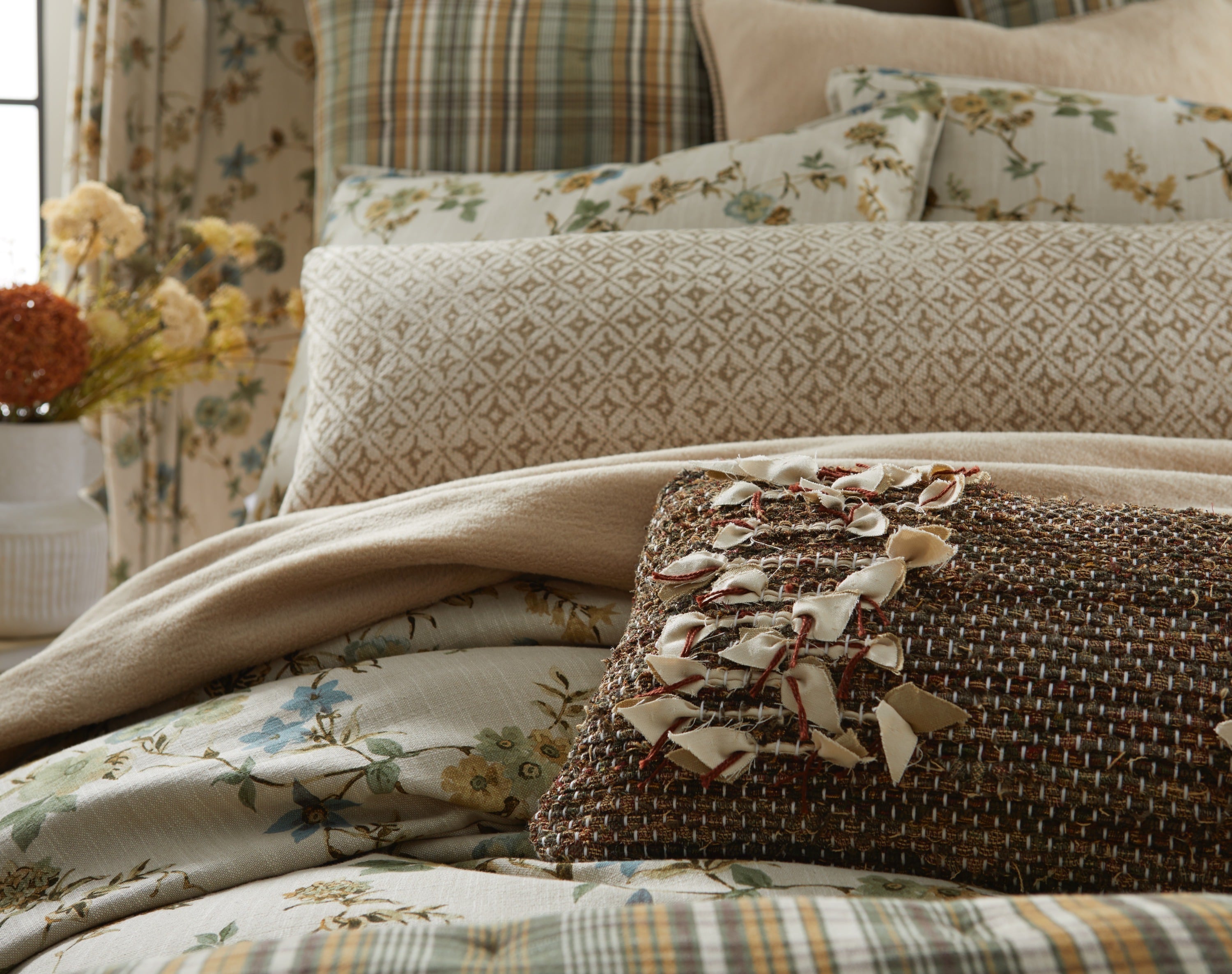Each element in this ensemble stands strong on its own—whether it’s the linen-look floral duvet with its soft watercolor blooms, the tailored plaid quilt woven in laurel green and warm tobacco, or the plush, reversible Culver blanket in brushed cotton. Together, they create a maximalist masterpiece of layered pattern, texture, and tone. The interplay of botanical prints, classic checks, and solid neutrals feels collected yet cohesive, offering a richly detailed bedscape that reads both grounded and elevated.
