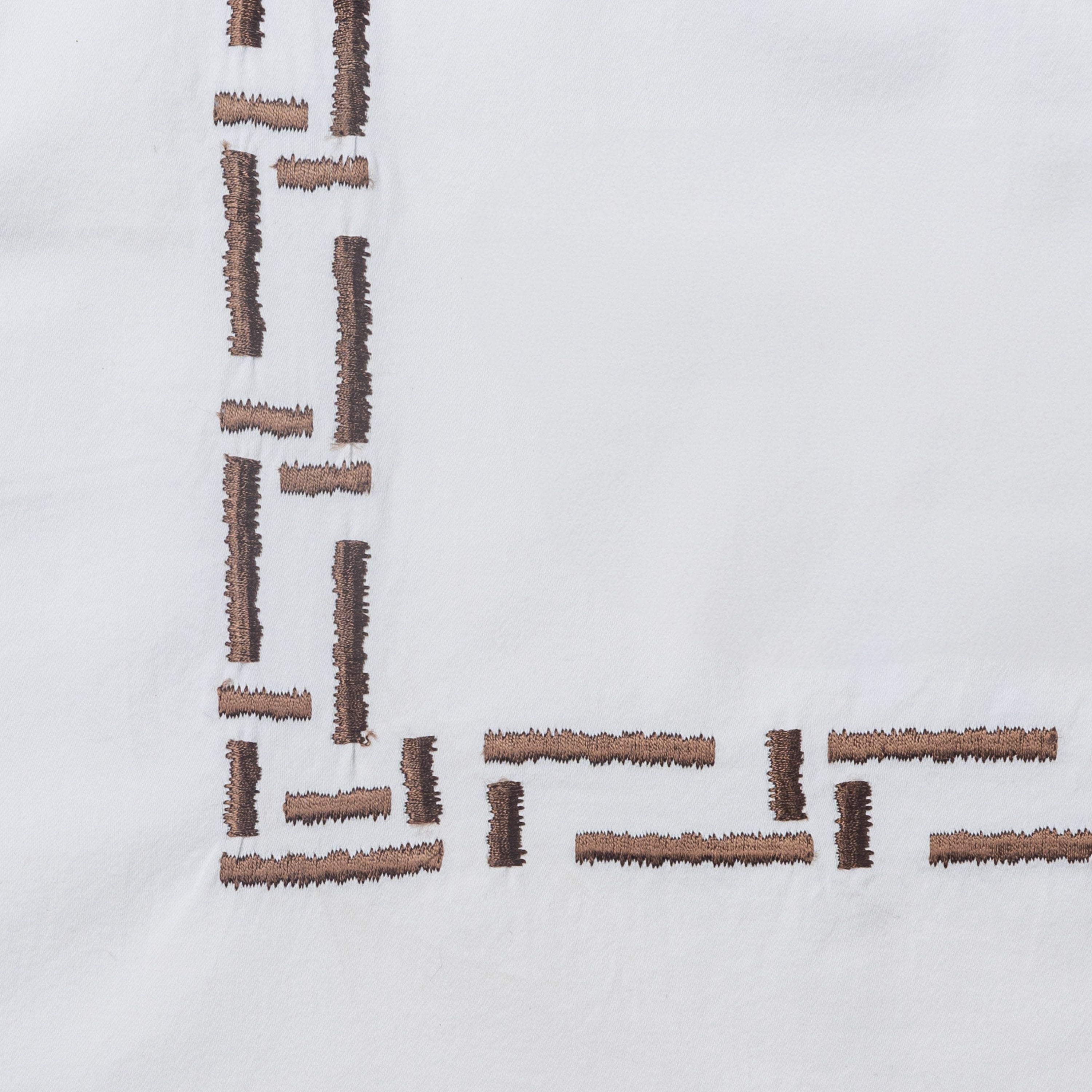 Sleek 400 thread count cotton sateen is embroidered with a lustrous rayon thread in a unique pattern of rhythmic bars. Each of the rich embroidery colors make a striking contrast to the crisp white ground lending this collection a great versatility in style.