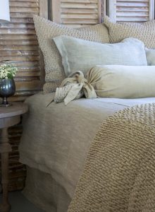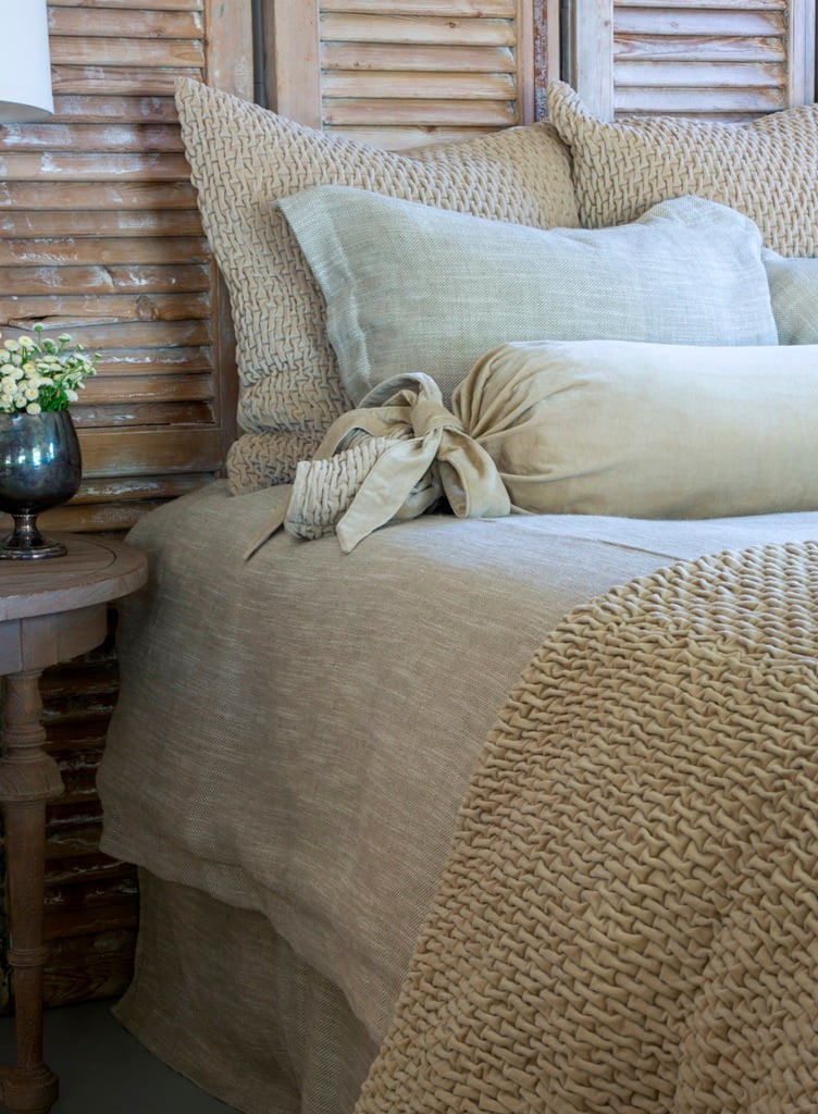 The hearty texture of the Emesto quilt pairs beautifully with the homespun look of the Jerome duvet cover for a monochromatic ensemble that is anything but basic. The Bella Banded Sheet set in Cream provides a crisp texture in contrast.