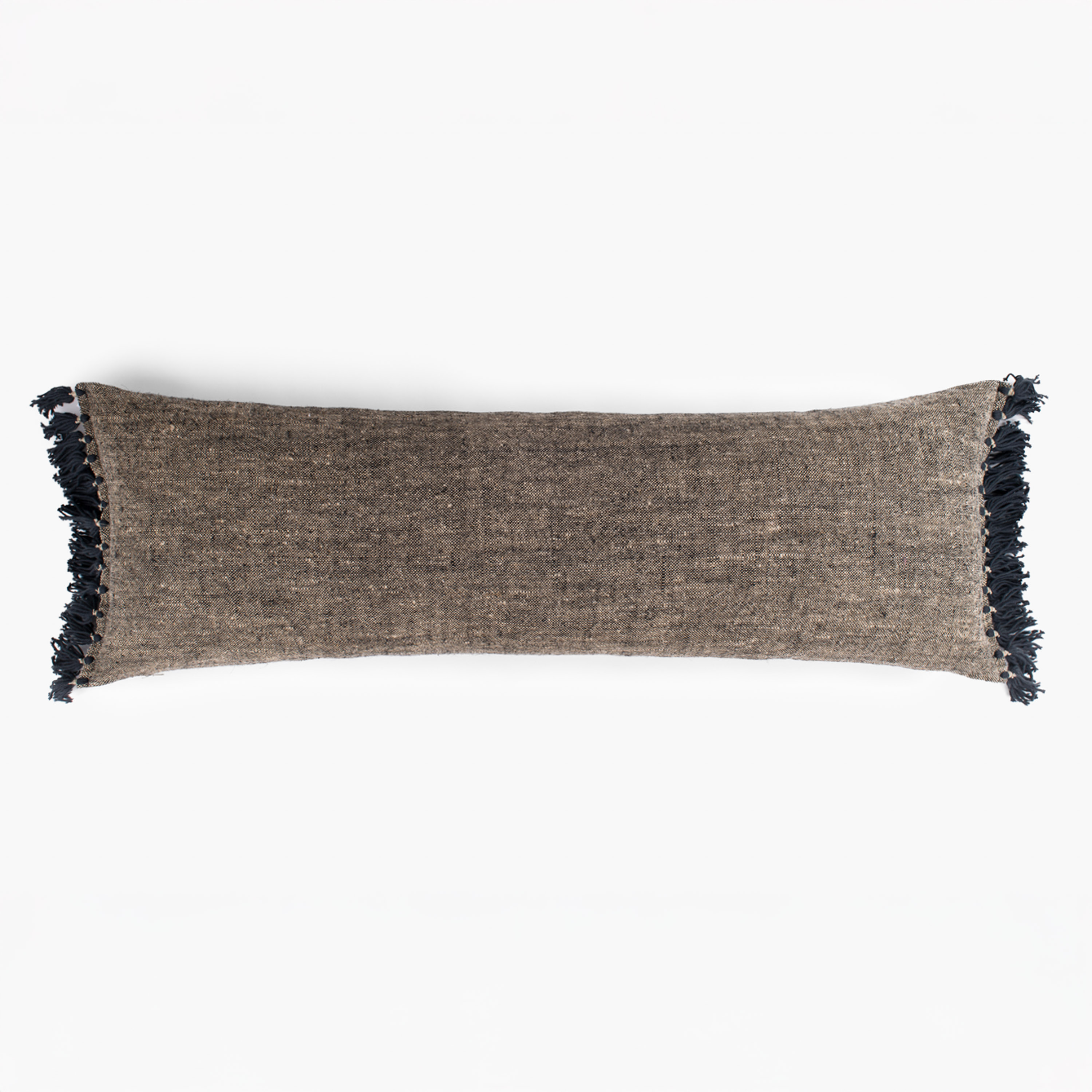 Understated and refined, this extra-long lumbar pillow is handwoven from richly textured linen in a deep espresso hue, offering a sophisticated foundation for layered luxury bedding. Delicate navy fringe trims each end, adding subtle contrast and artisanal flair. Designed for those who appreciate minimalist elegance, this piece effortlessly elevates modern and classic interiors alike with its quiet, tailored charm.
