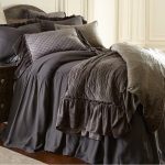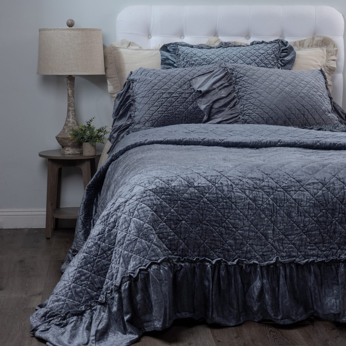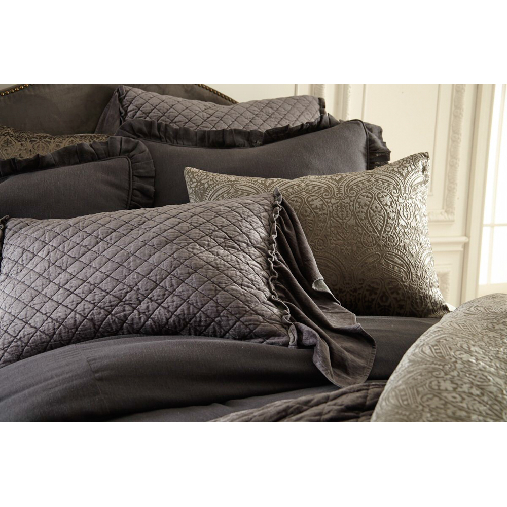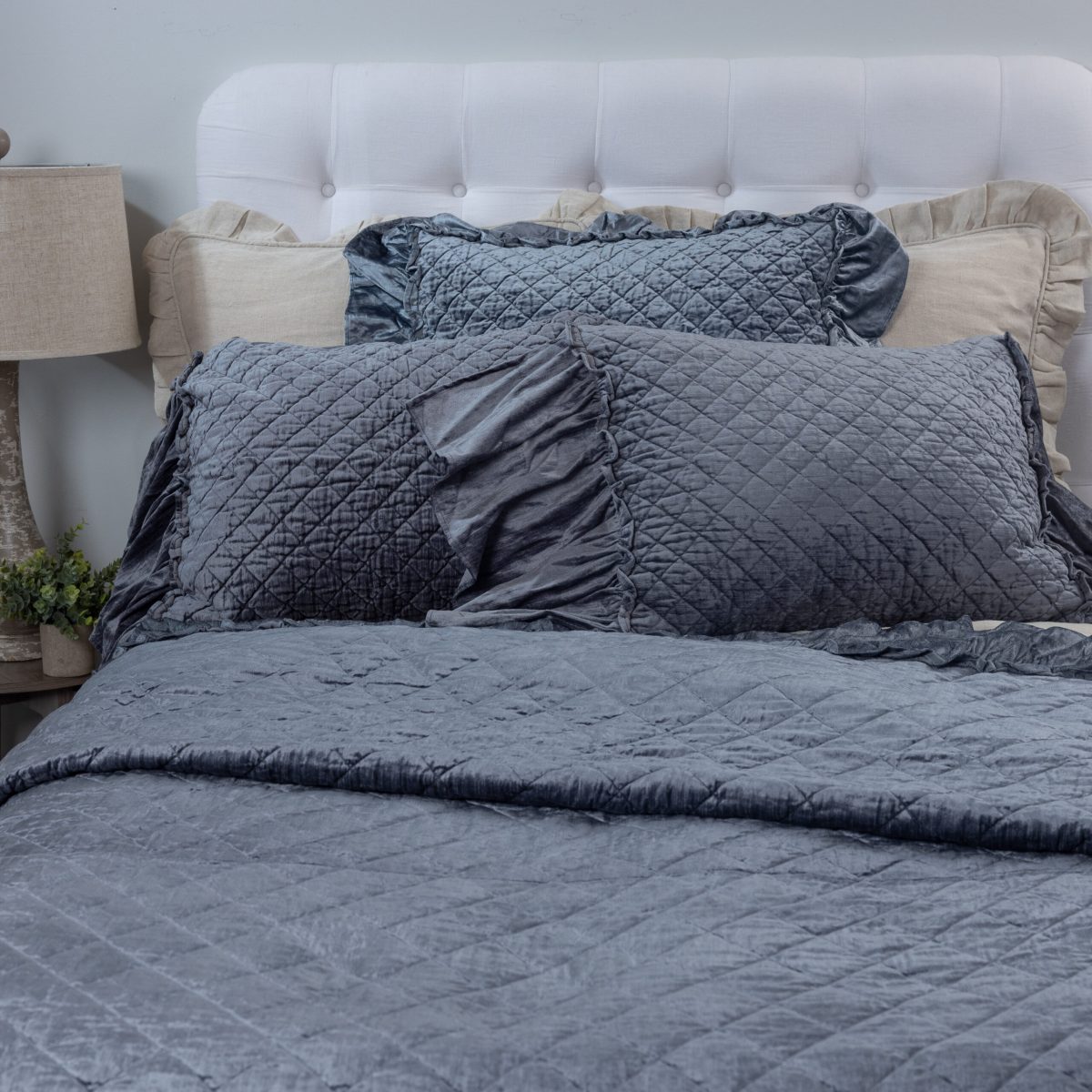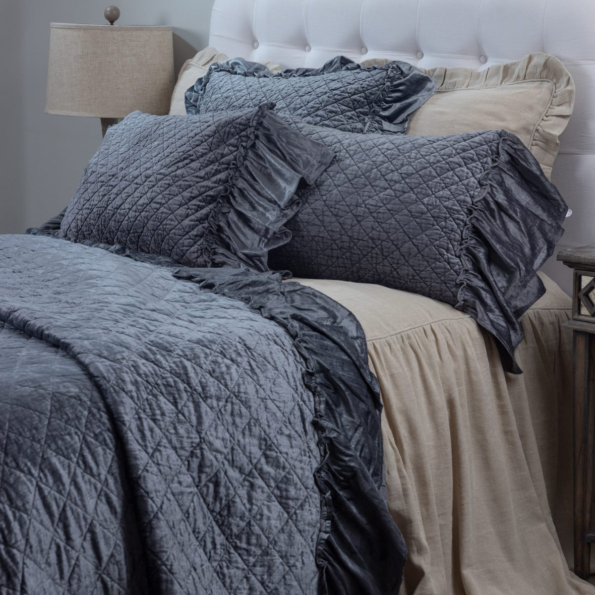 Using the same color palette, combine linen and velvet ruffles for a beautiful and lush texture story. Here the Kiya bedspread is a paired with Estrella Steel Blue to achieve this sultry ensemble.