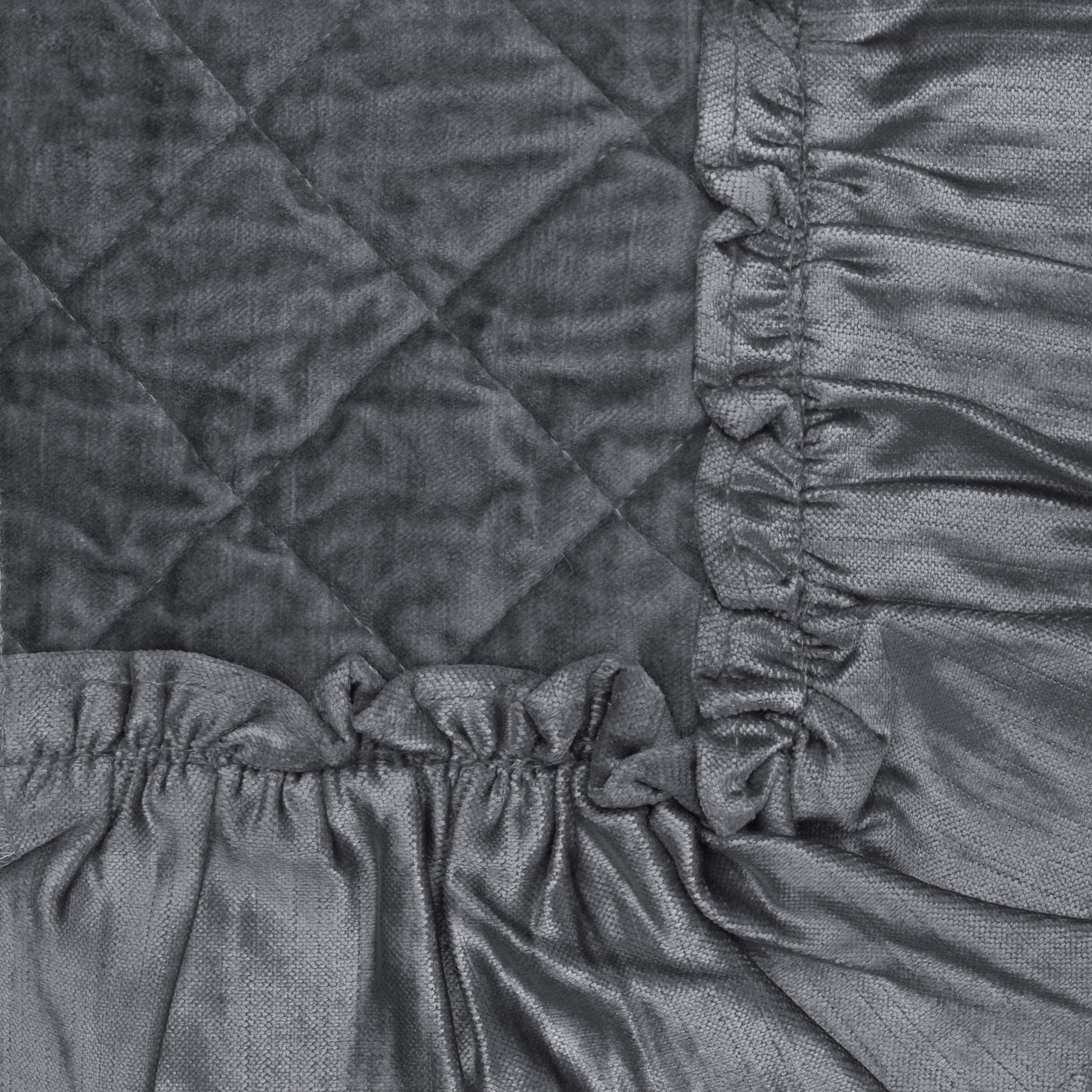 Lustrous viscose velvet is quilted in a classic diamond pattern and finished with 10 inches of ruffles for an old world aesthetic. The standard and king shams are adorned with a 10-inch ruffle on either side, while the euro sham is surrounded with a 3 inch ruffle on all four sides.