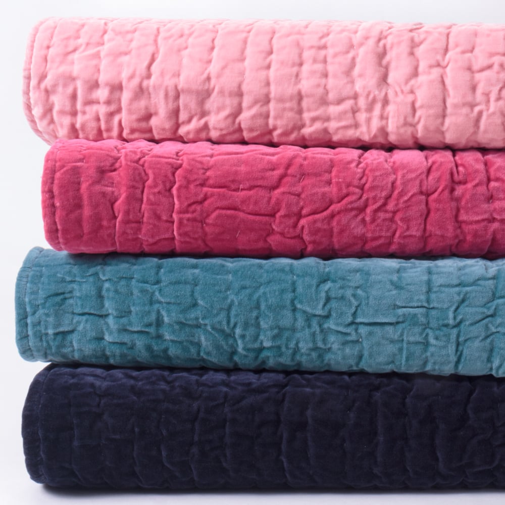 These cozy velvet quilts are reminiscent of the quilts at Granny’s farm house. They’re made with intricate hand quilting, and prewashed for extra softness.