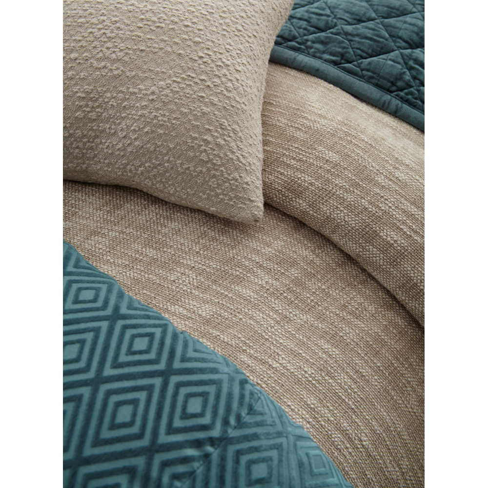 Evol Natural paired with rich and polished collections like Lia, Jacqueline and Simona all in Peacock makes for a modern take on formal tradition. A pair of Orlana Lumbar pillows add a touch of glimmer with a delicate gold lurex yarn woven through its textured boucle ground. The use of Damara Ivory Euros provides an elegant backdrop for the opulent textures to abound.