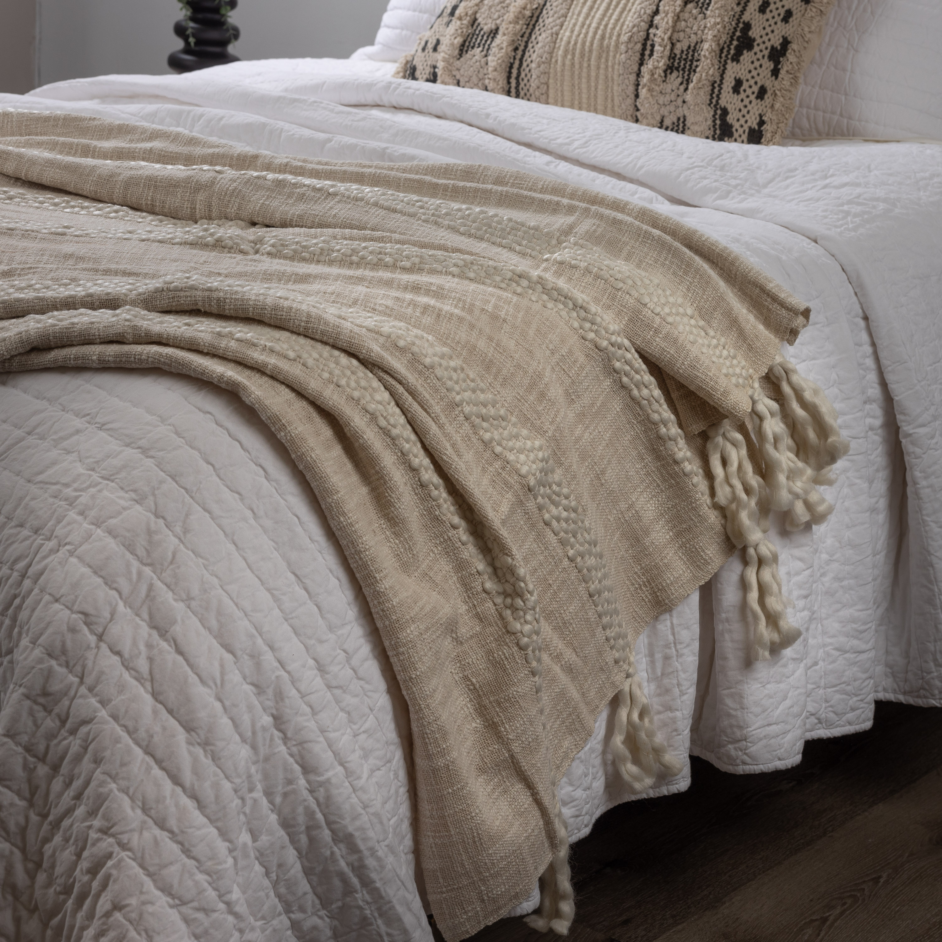 Subtle, yet statement, this throw is weaves slubby cotton in the warp and weft creating a light weight texture all over, with plush bulky yarn running horizontally creating a textural stripe. Finished with hand tied tassels on each either side.