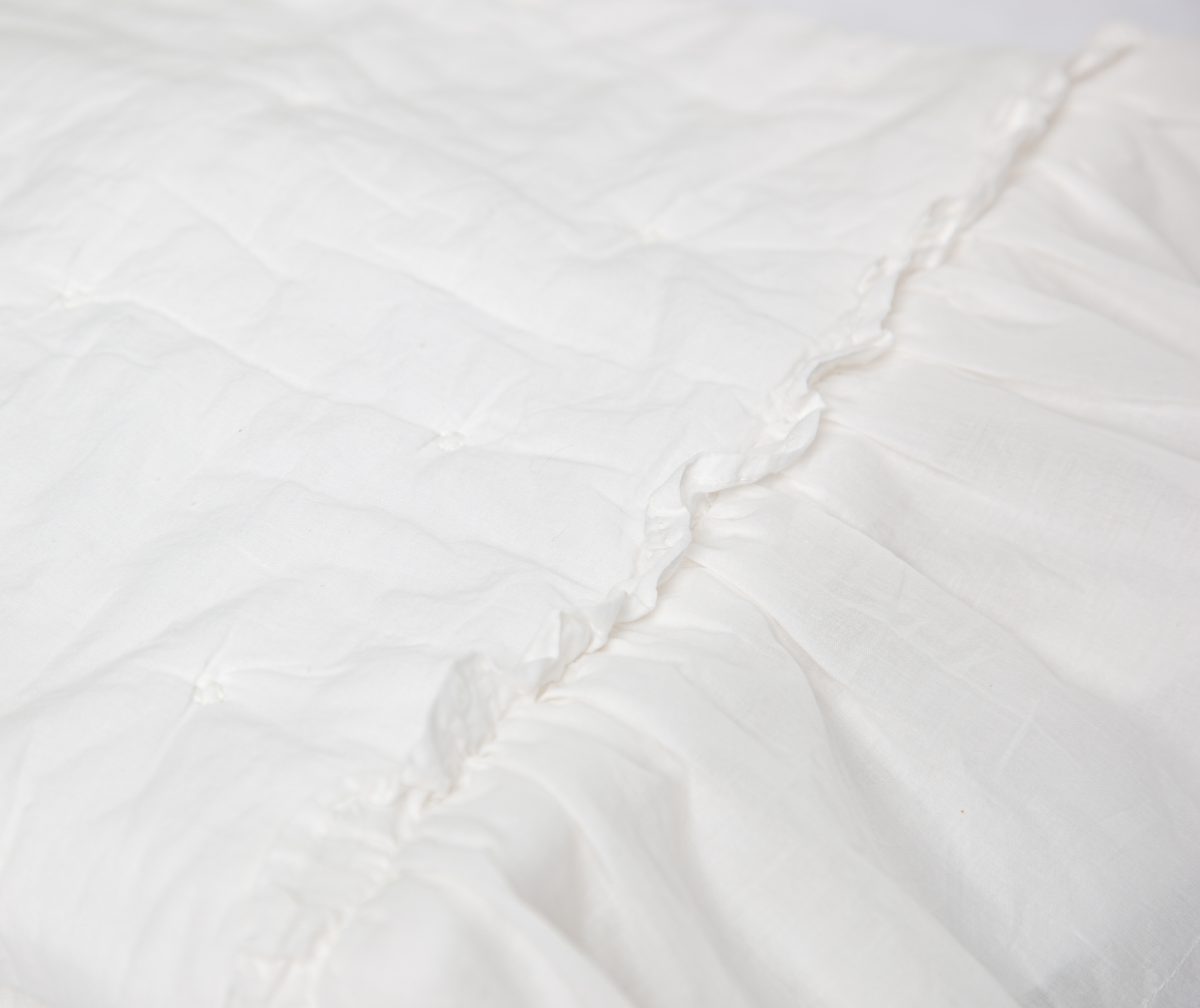 The Fiona Bedspread has a lightly padded tacked top surrounded by structured piping with a 30” long gathered waterfall skirt. This ethereal bedspread is finished with a hand frayed eyelash edge.