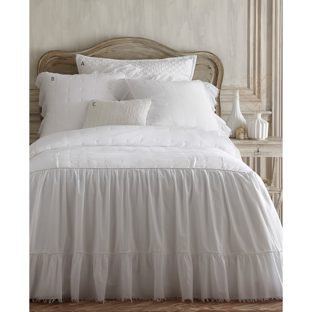 The Fiona Bedspread has a lightly padded tacked top surrounded by structured piping with a 30” long gathered waterfall skirt. This ethereal bedspread is finished with a hand frayed eyelash edge.
