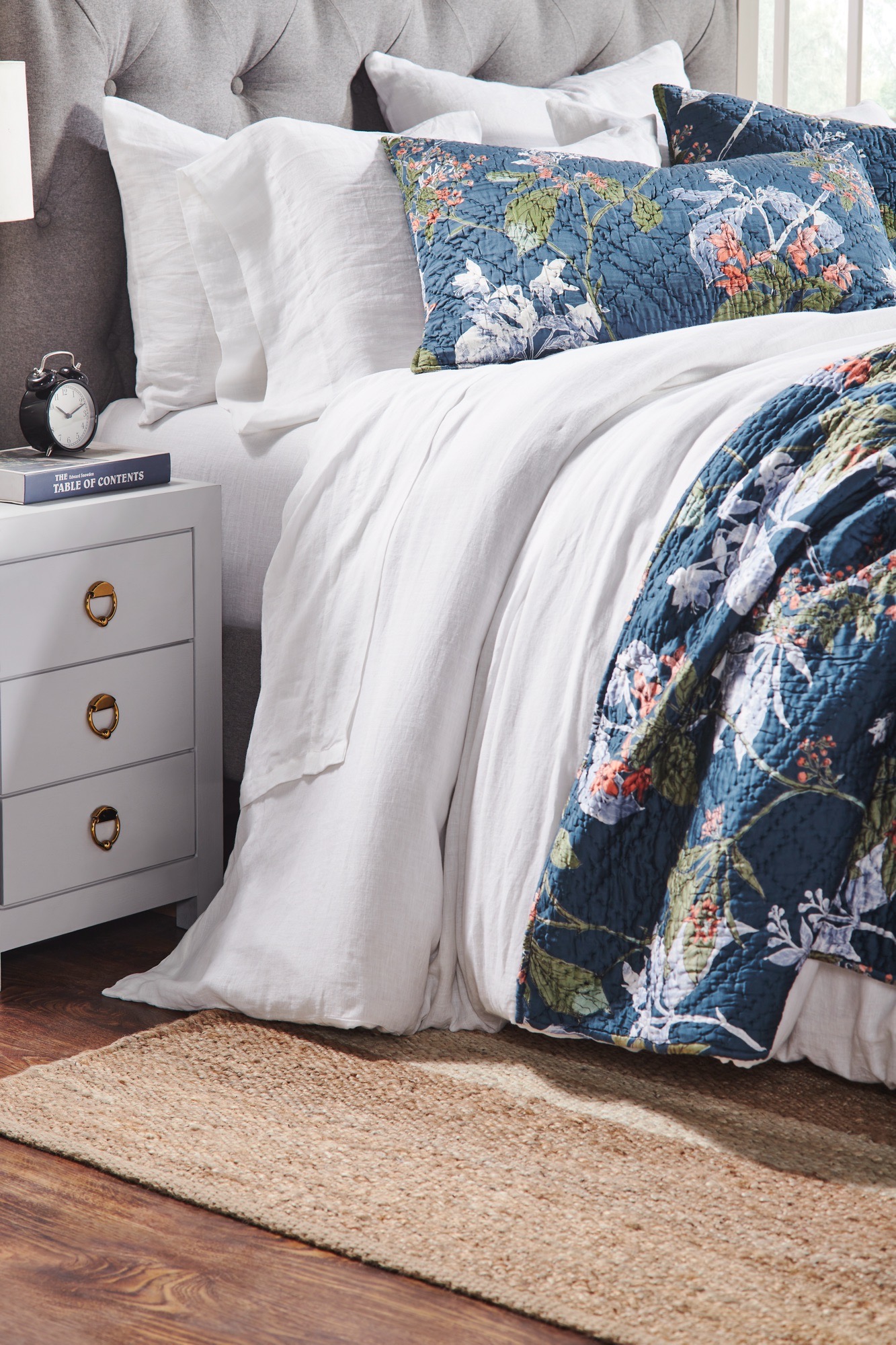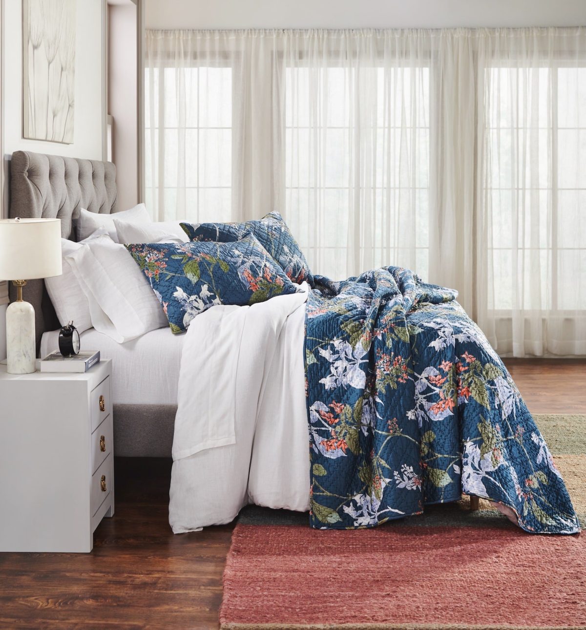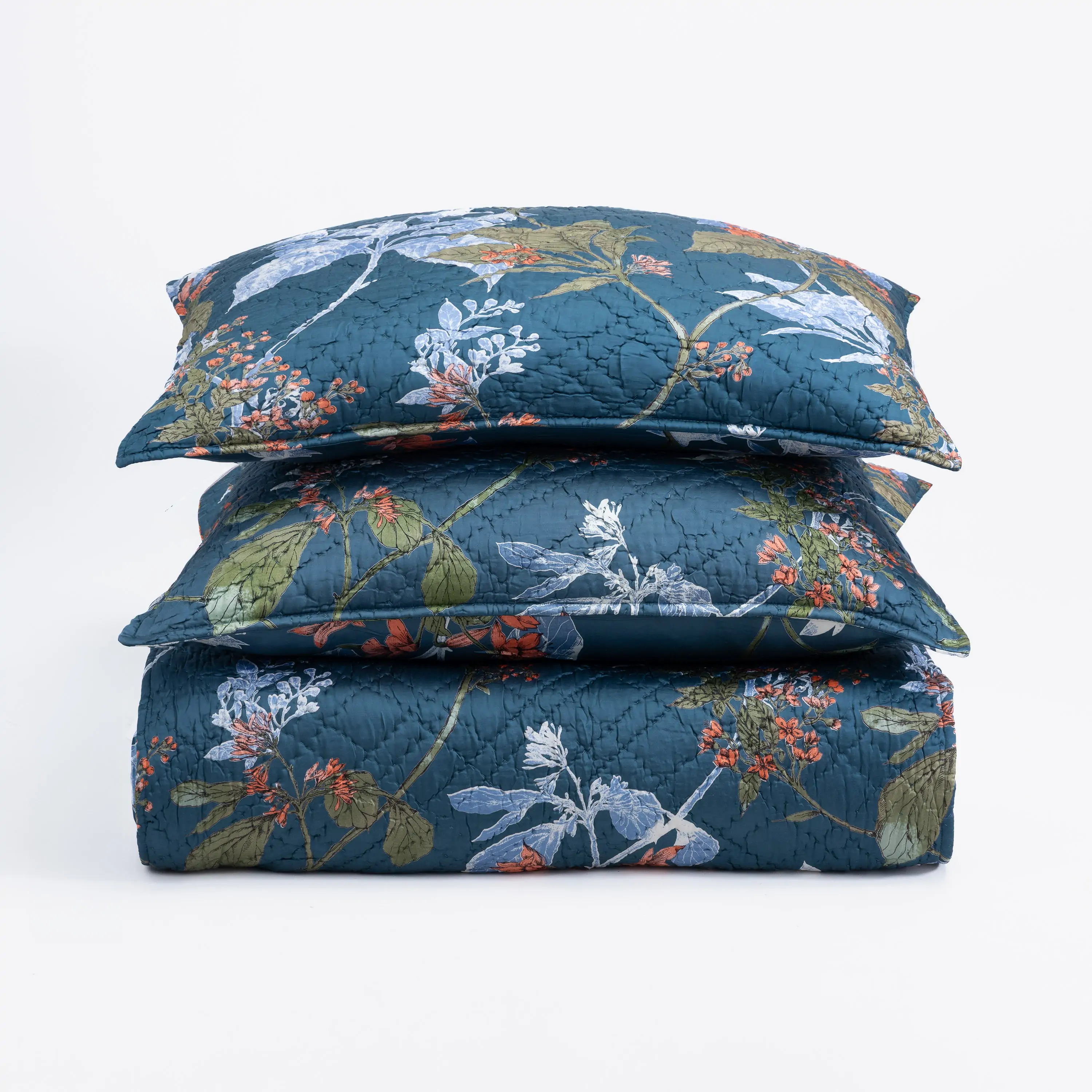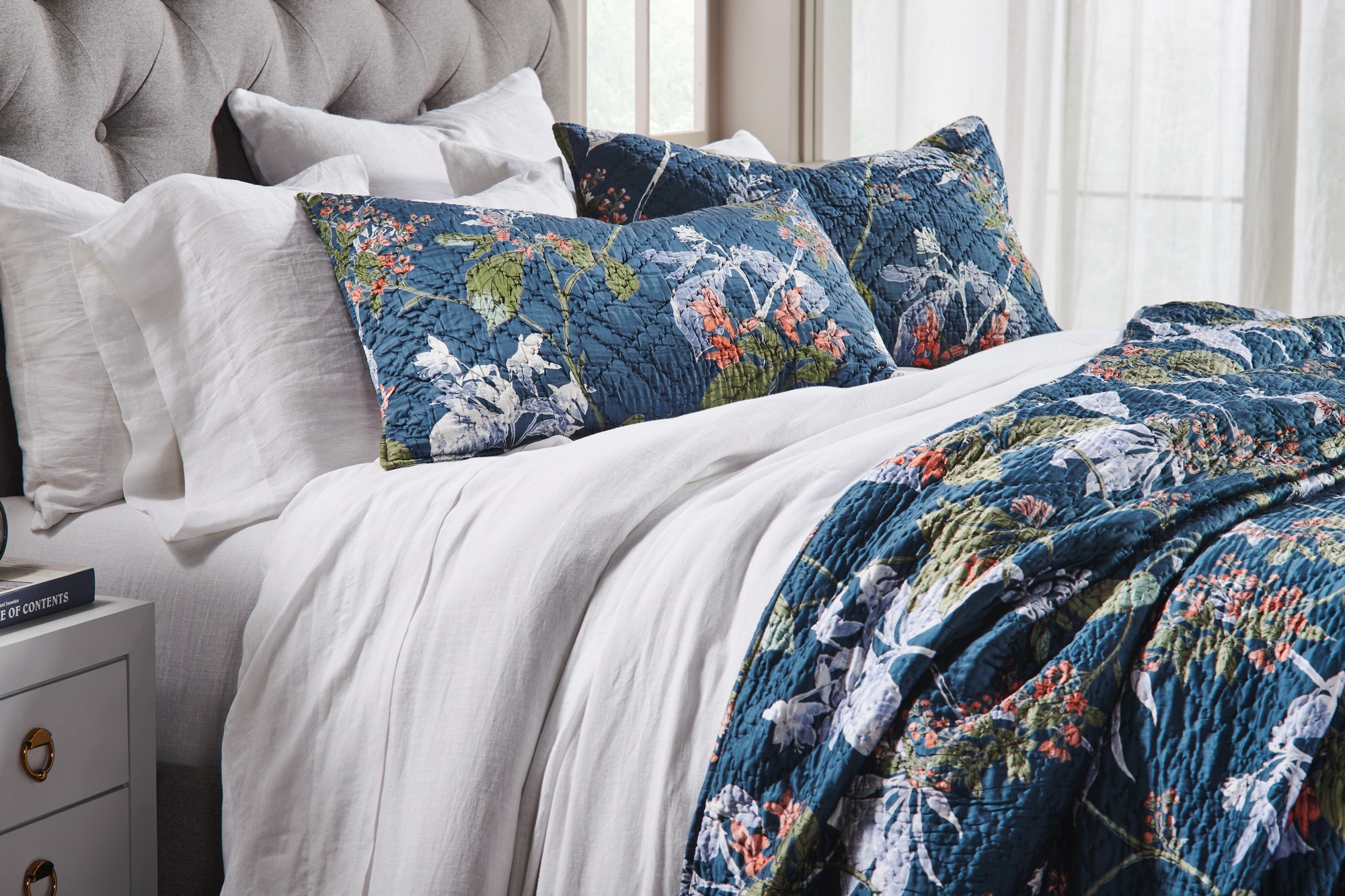 This trailing floral is inspired by vintage chinoiserie patterns, with fresh flair. Printed on a sleek rayon sateen ground and hand quilted, the Fitzgerald quilt has a lustrous yet livable finish. The Fitzgerald quilt is available in: