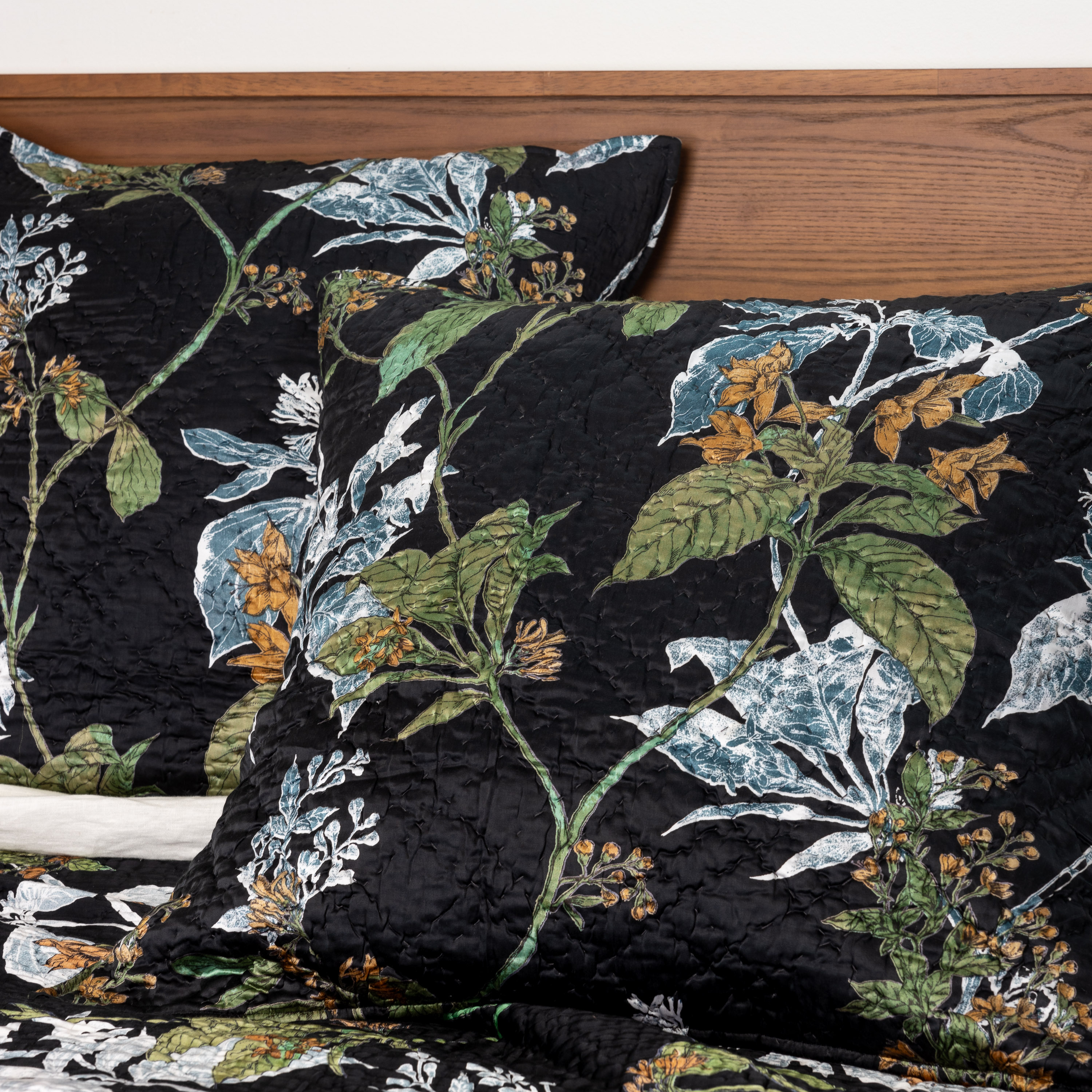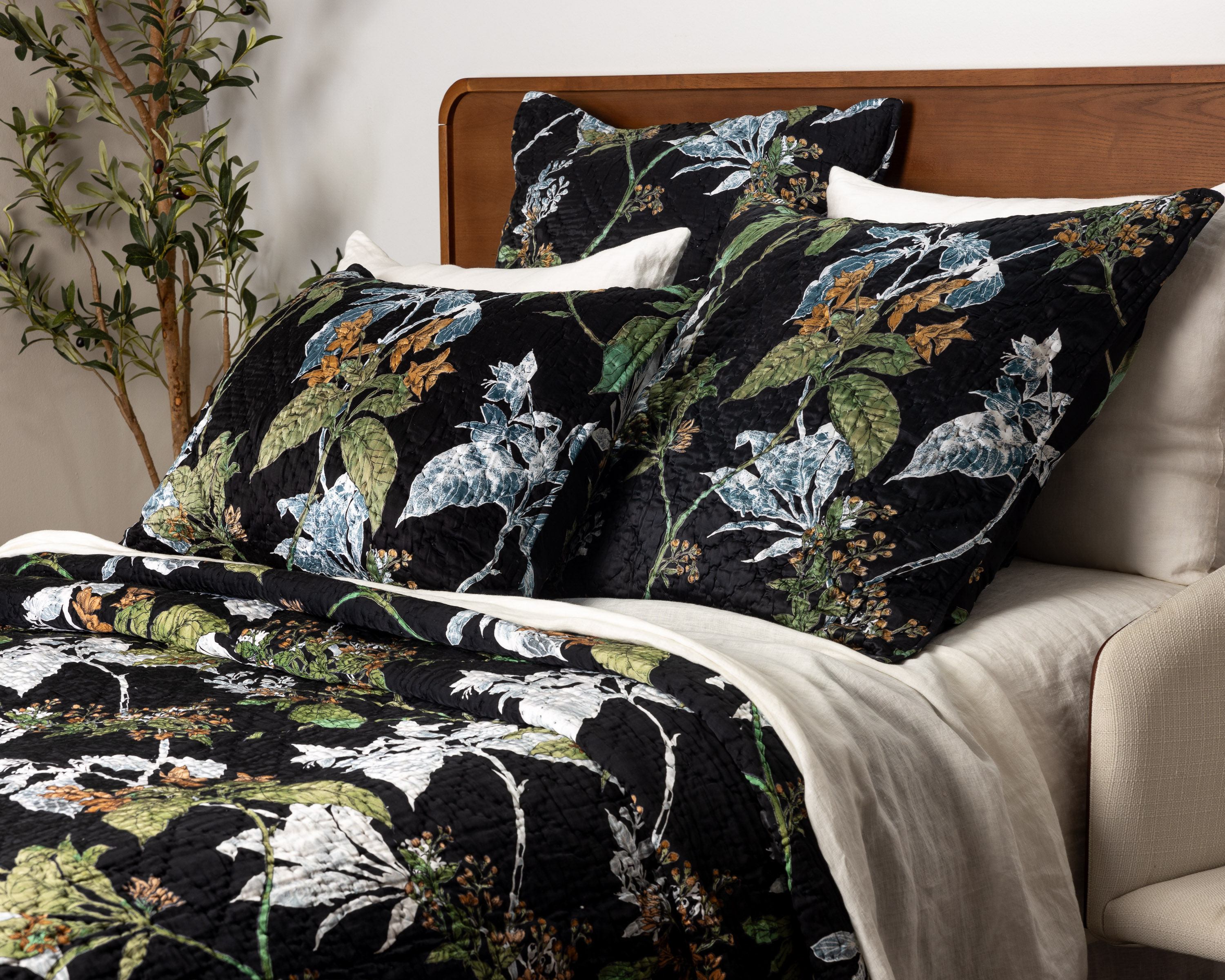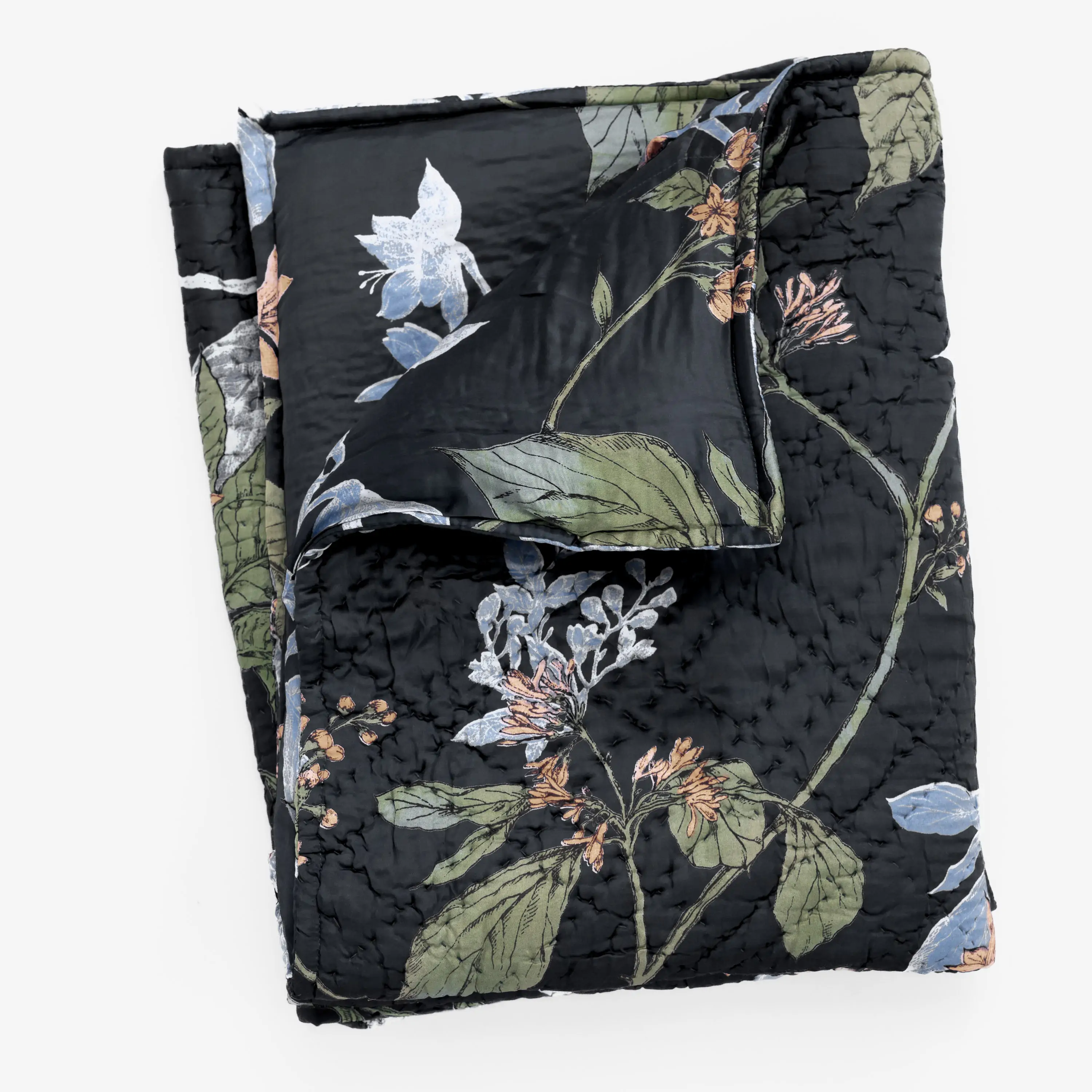 This trailing floral is inspired by vintage chinoiserie patterns, with fresh flair. Printed on a sleek rayon sateen ground and hand quilted, the Fitzgerald quilt has a lustrous yet livable finish. The Fitzgerald quilt is available in: