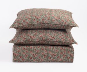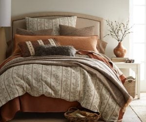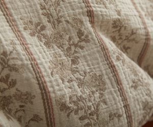 This ensemble captures a quietly romantic sensibility, where subtle pattern and texture come together with an effortless, lived-in ease. The look is rooted in a palette of softened earth tones—sage, sand, and tobacco—layered with an intuitive hand. A delicate floral print is paired with a classic stripe, striking a balance between rustic charm and refined simplicity. The interplay of these patterns adds a sense of quiet movement without overwhelming the space, while tonal quilts and relaxed forms keep the look grounded and inviting.